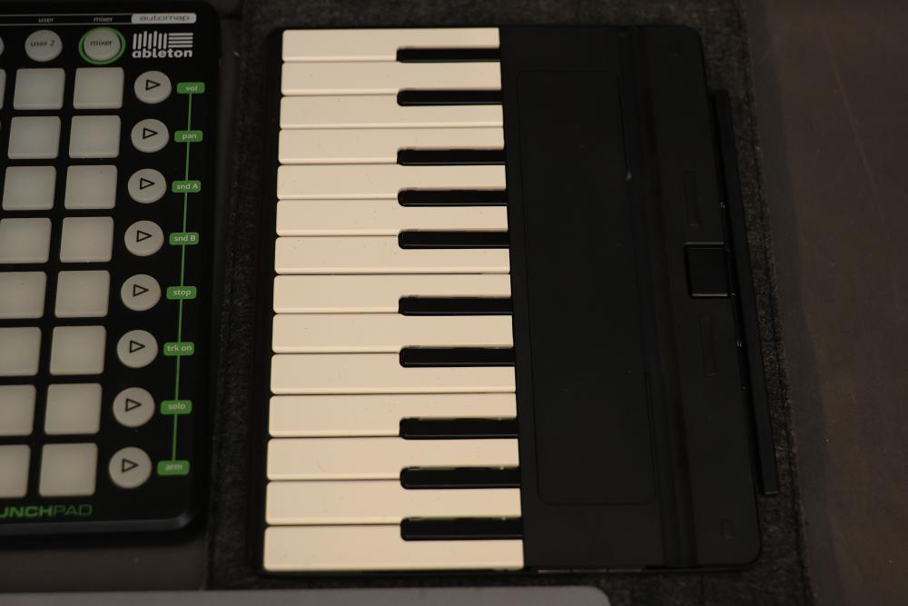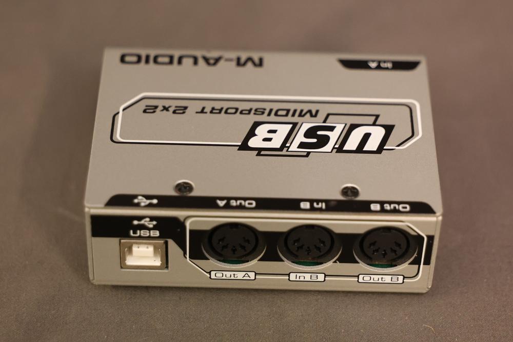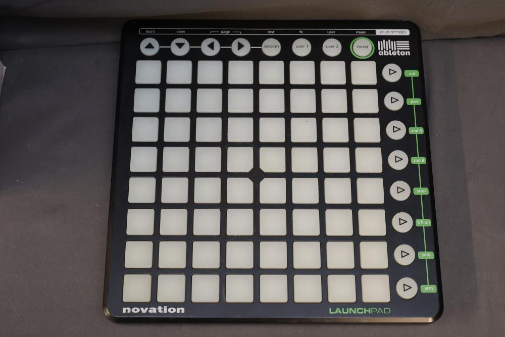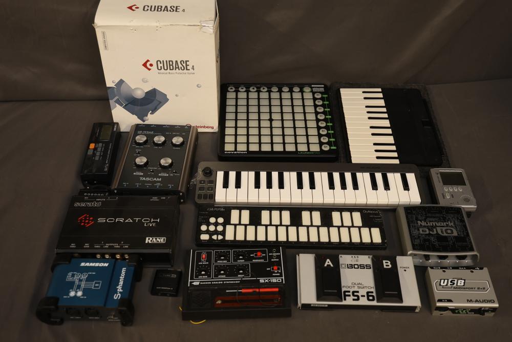 A range of music production and performance equipment, including M-Audio USB MIDISPORT 2x2 interface, Boss FS-6 dual foot switch, Gakken Analog Synthesizer SX-150, Novation Launchpad controller, M-Audio Keystation Mini 32 keyboard, Keith McMillen Instruments QuNexus MIDI controller, Tascam US-144MKII interface, Rane Serato Scratch Live interface, Samson S-Phantom, and Numark DJ|iO. Includes boxed Steinberg Cubase 4 software. Pickup only.