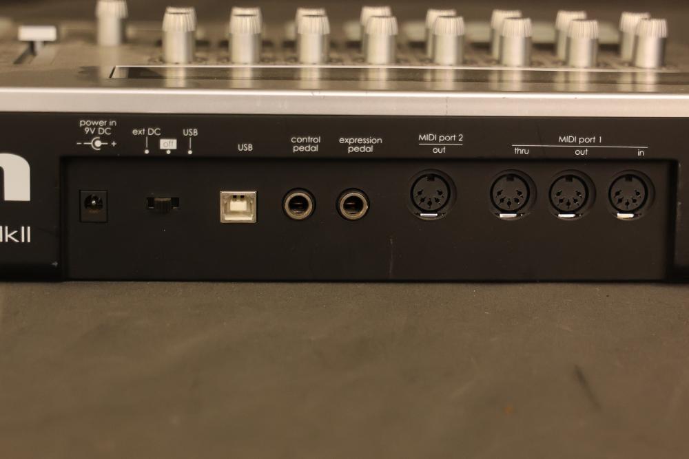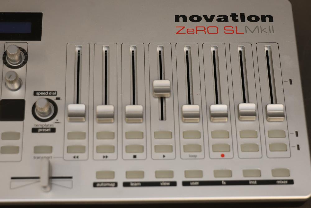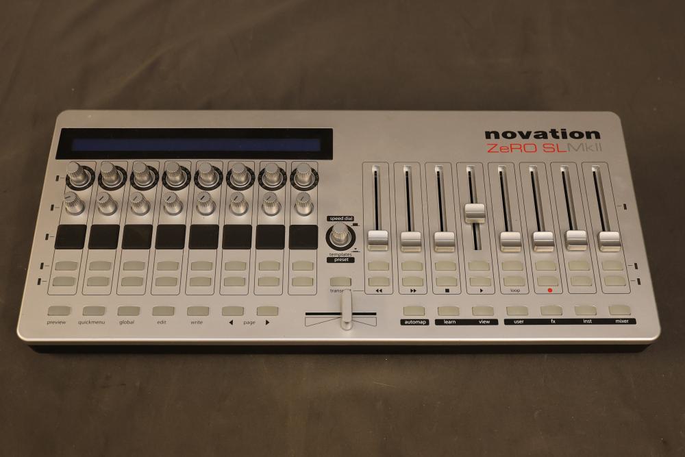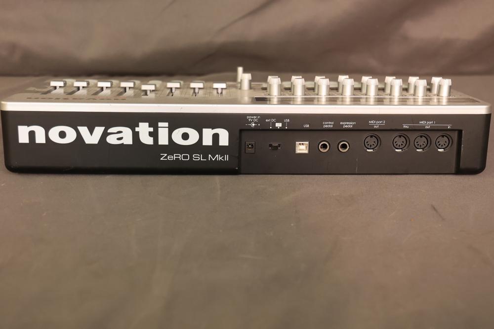 Novation ZeRO SL MkII USB MIDI Controller featuring multiple knobs, sliders, and buttons for customizable music production. Equipped with MIDI I/O ports, USB connectivity, and controls for expression and sustain pedals. Suitable for studio and live performance setups.