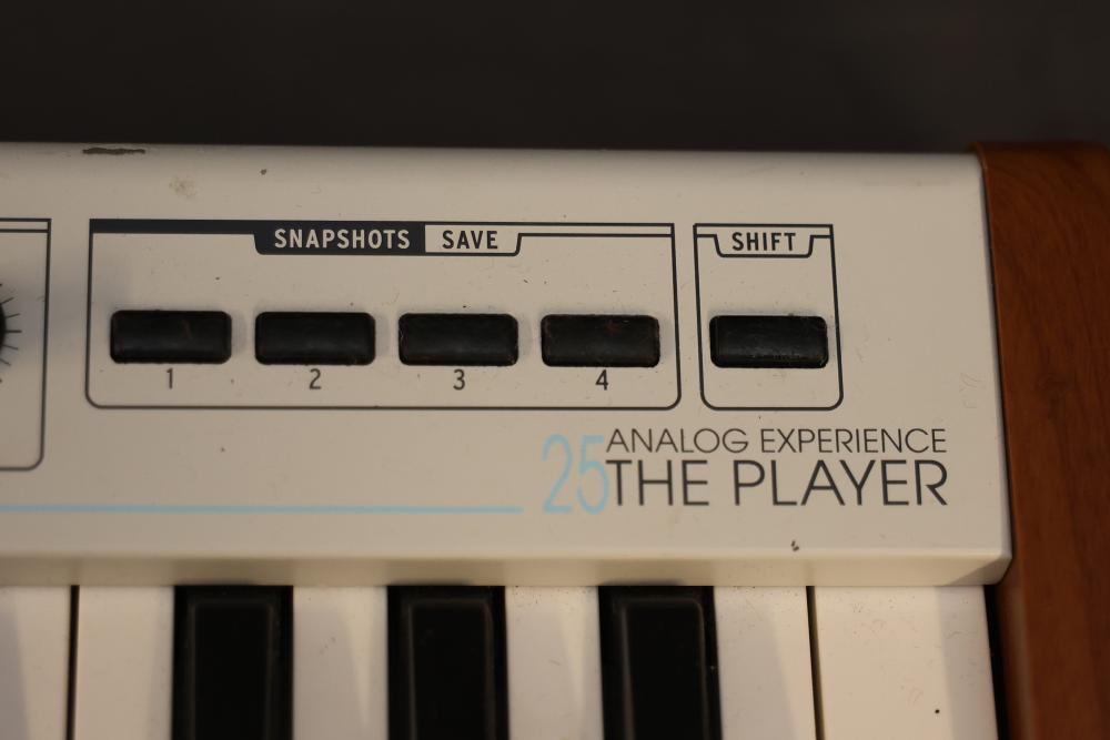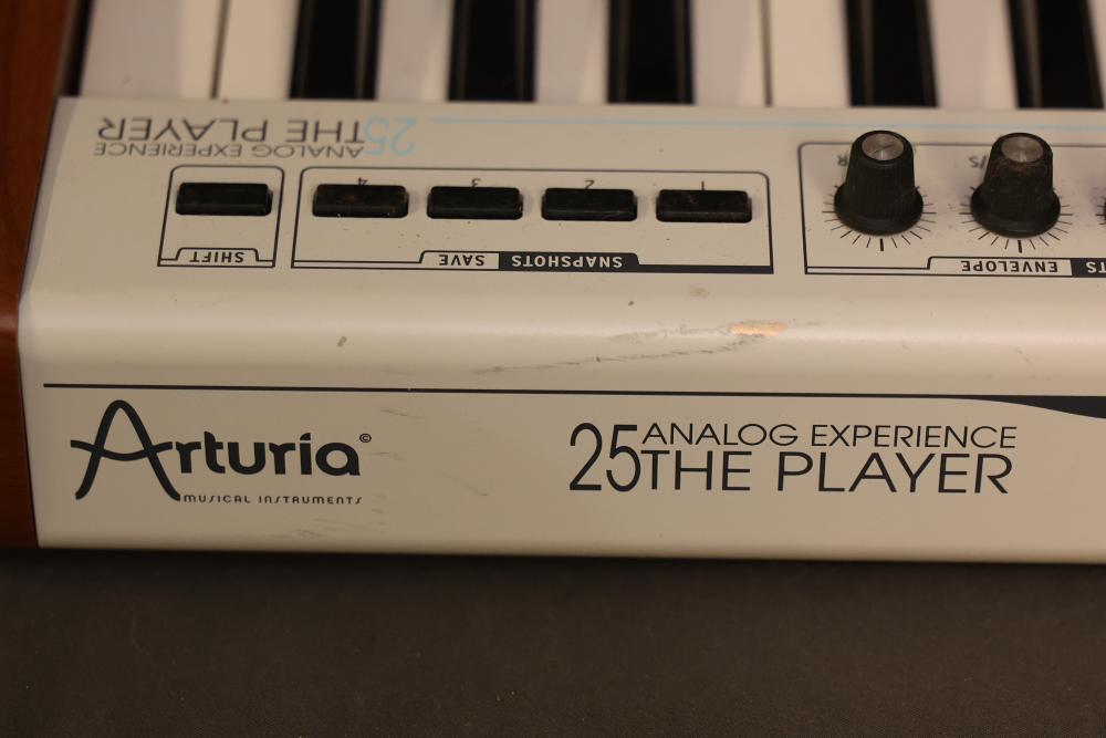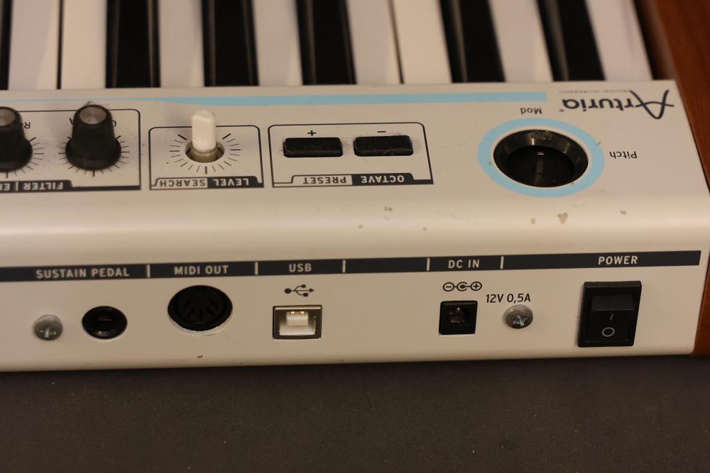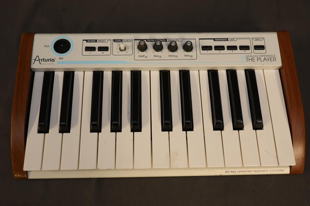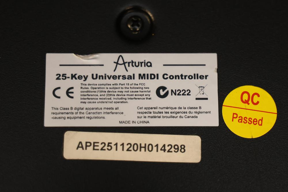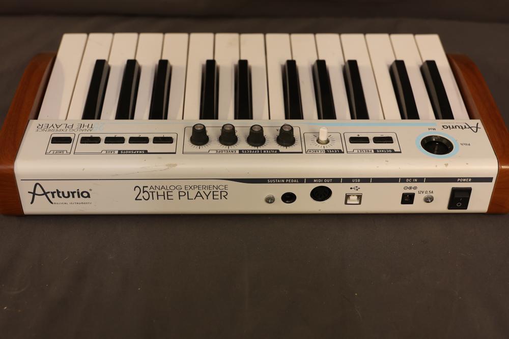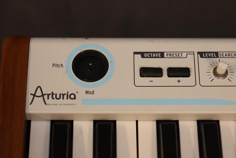 Arturia 25-Key Universal MIDI Controller featuring analog experience with multiple control functions including pitch, modulation, level interface, preset, snapshots, and shift. Includes MIDI OUT, USB, and DC IN connectivity. Clearly labeled controls and wood panel details.