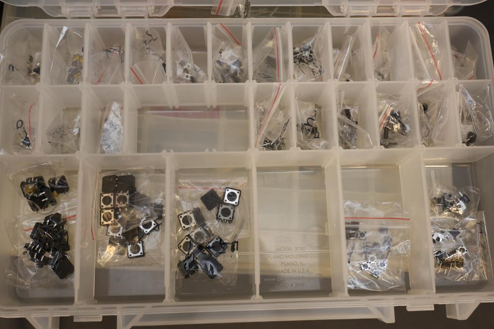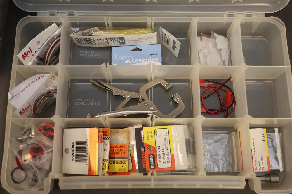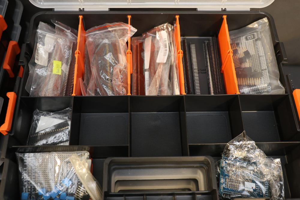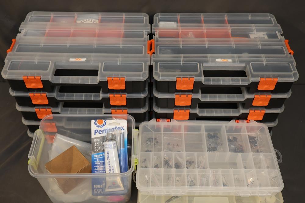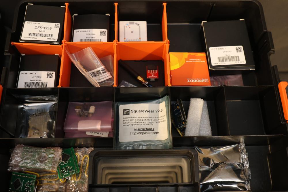 Includes Airtac solenoid valves, DFRobot Bluno Nano and Arduino-compatible modules, Microduino components, SquareWear electronics controller board, Flywoo batteries, and various hardware like screws, fasteners, and wires. Also includes several compartmentalized storage containers for organization. Contents vary. Pickup only.