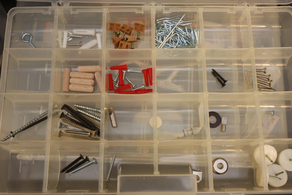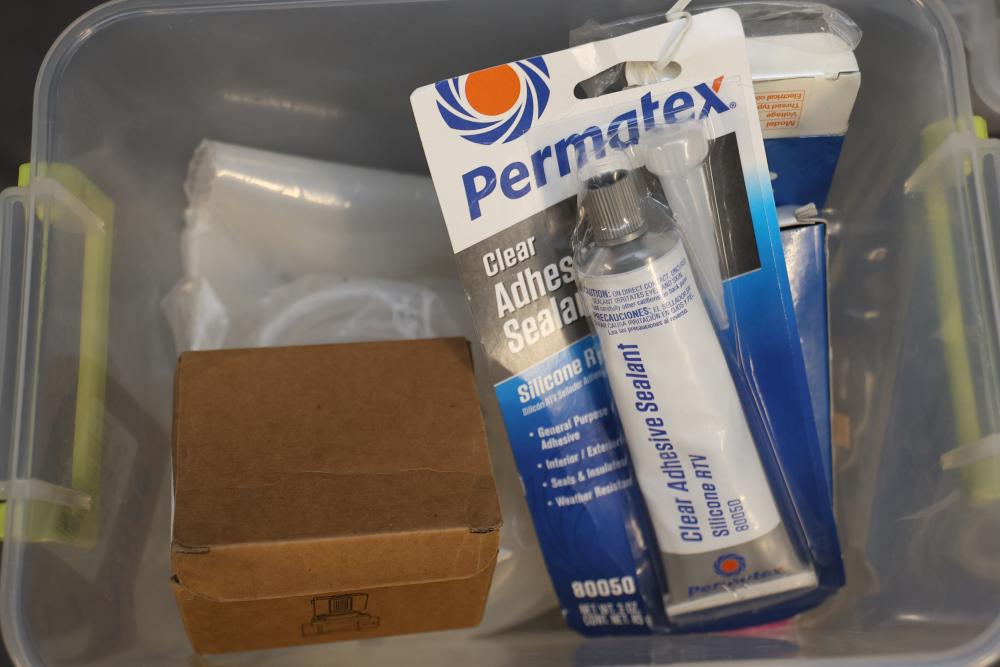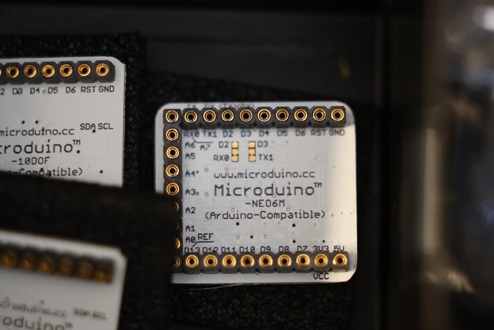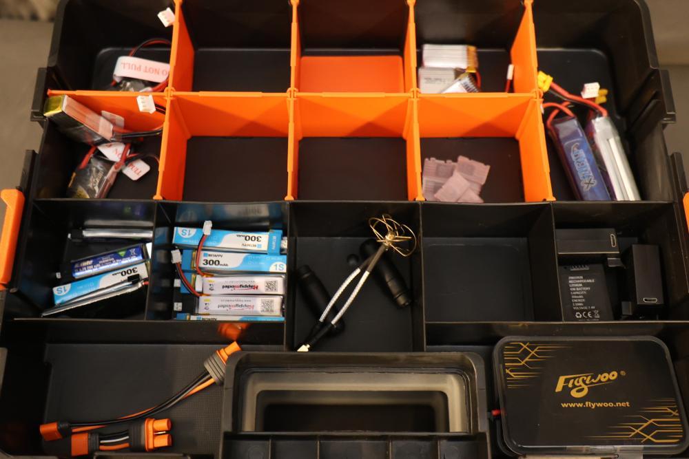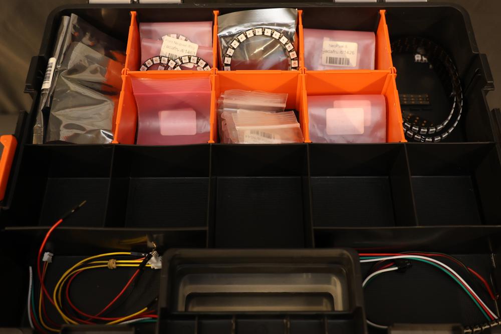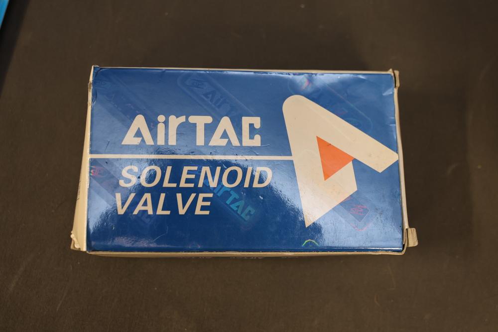 Includes Airtac solenoid valves, DFRobot Bluno Nano and Arduino-compatible modules, Microduino components, SquareWear electronics controller board, Flywoo batteries, and various hardware like screws, fasteners, and wires. Also includes several compartmentalized storage containers for organization. Contents vary. Pickup only.