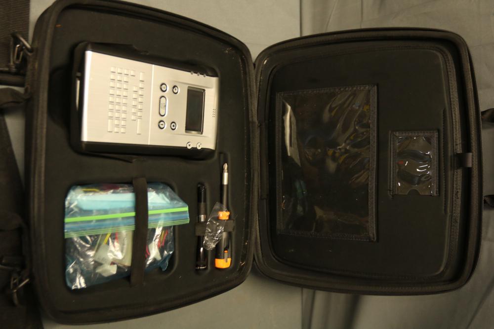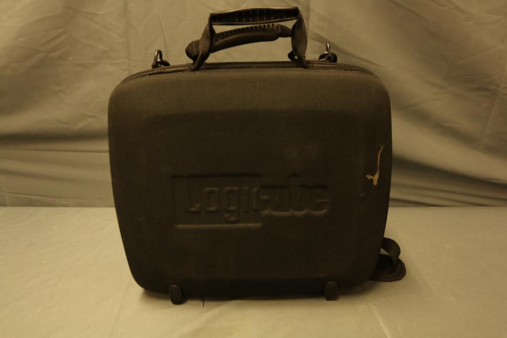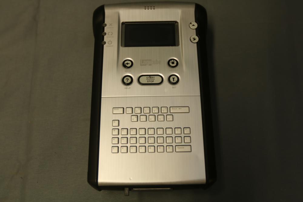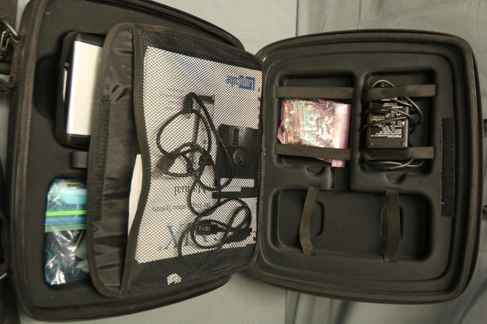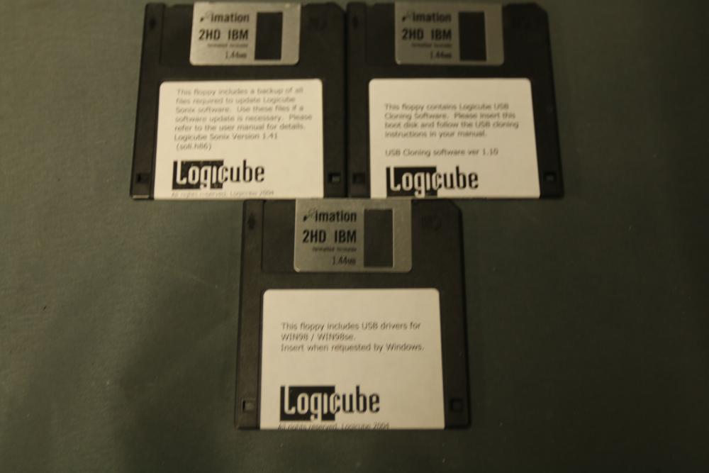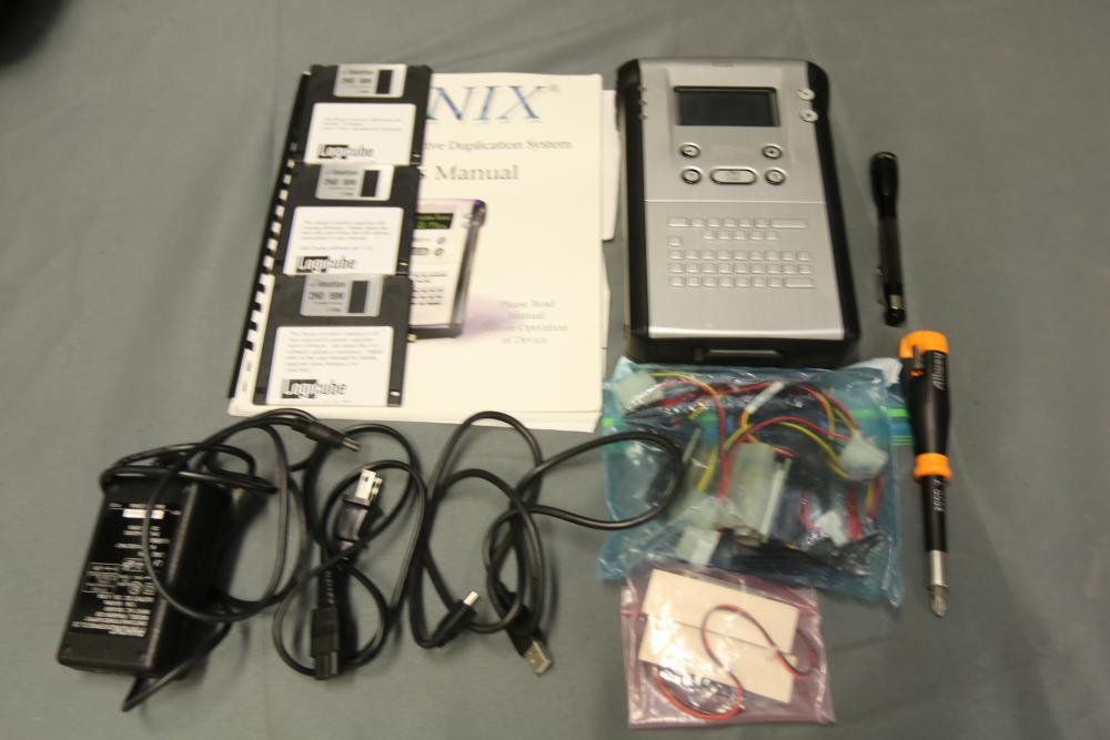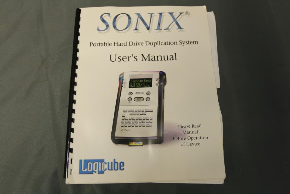 Logicube Sonix portable hard drive duplication system in a protective carrying case. Includes power supply, USB cable, screwdriver, flashlight, various cables, adapters, floppy disks, and a user manual. All items are housed within the fitted case for organization and transport.
