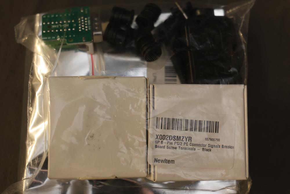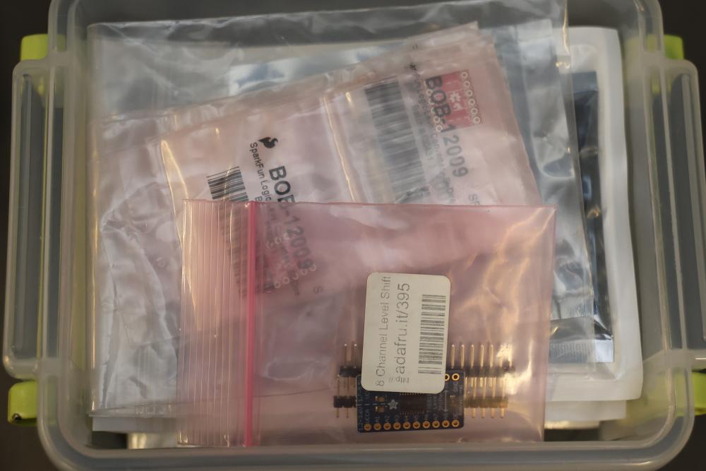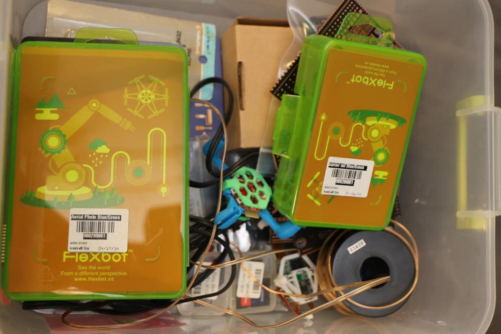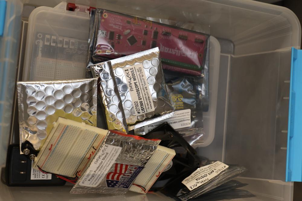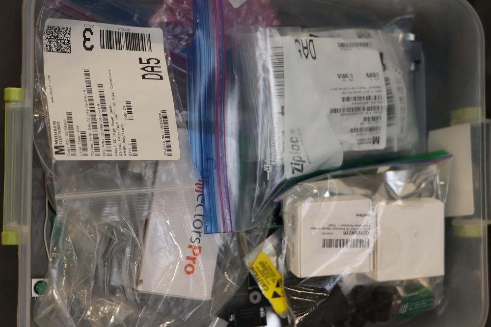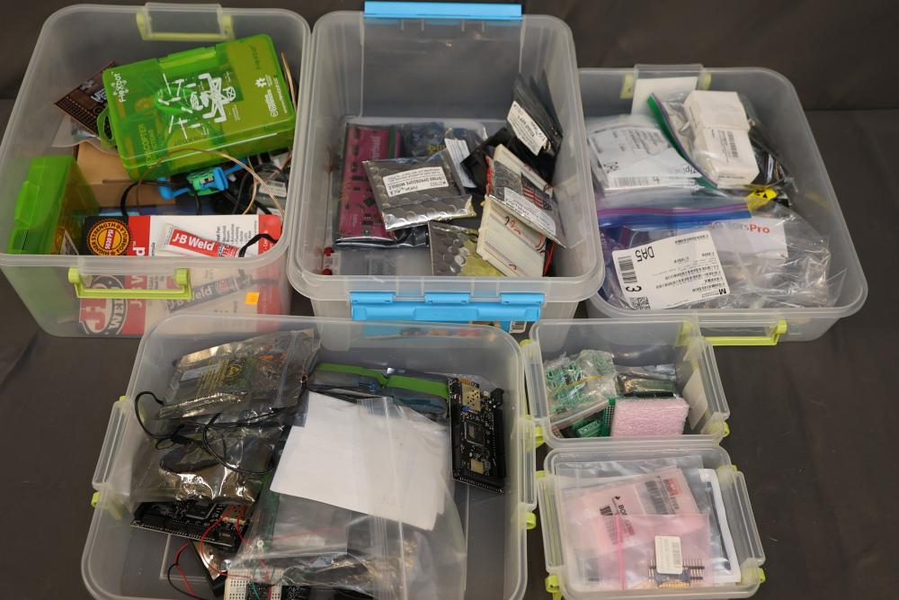 Electronics components and boards including LISY300 Gyroscope Module, Honeywell HMC6352 Compass Module, various breadboards, and DigiX boards. Additional items include prepackaged connectors, prototyping boards, wires, and a variety of small parts for electrical projects. All contents contained in multiple storage boxes and organized with small containers. Pickup only.