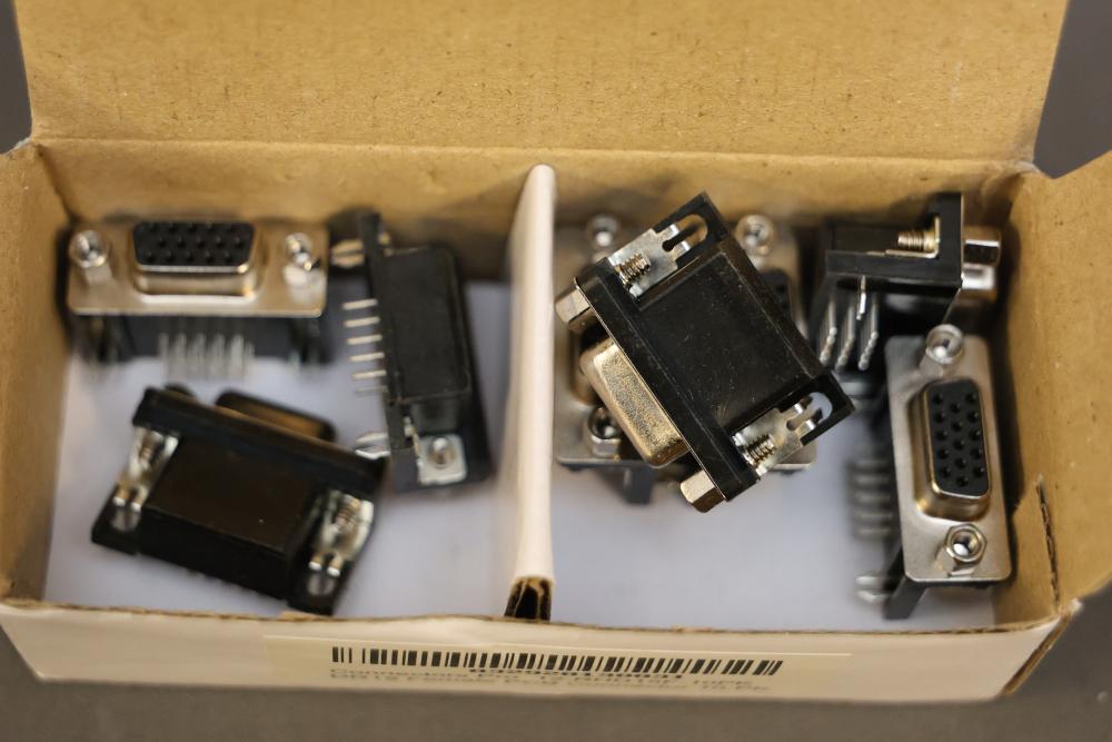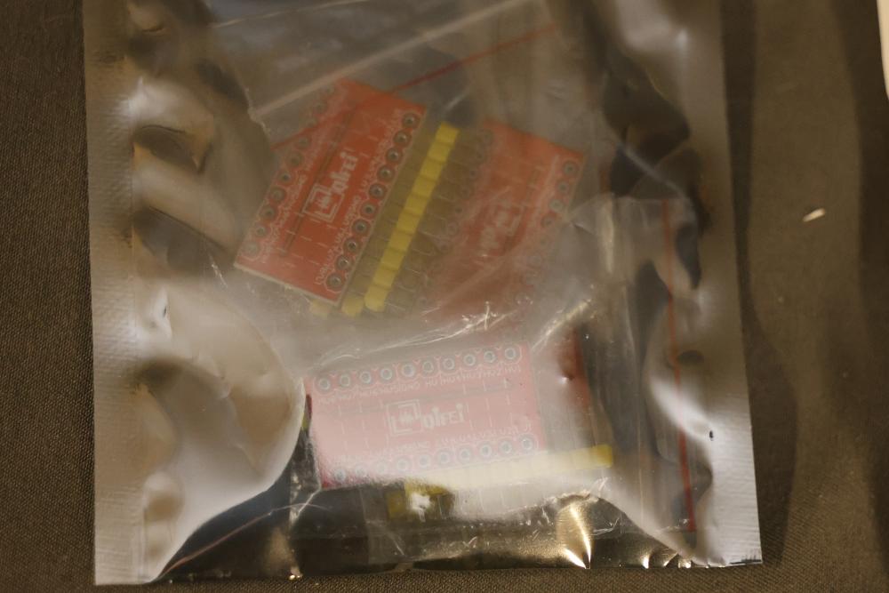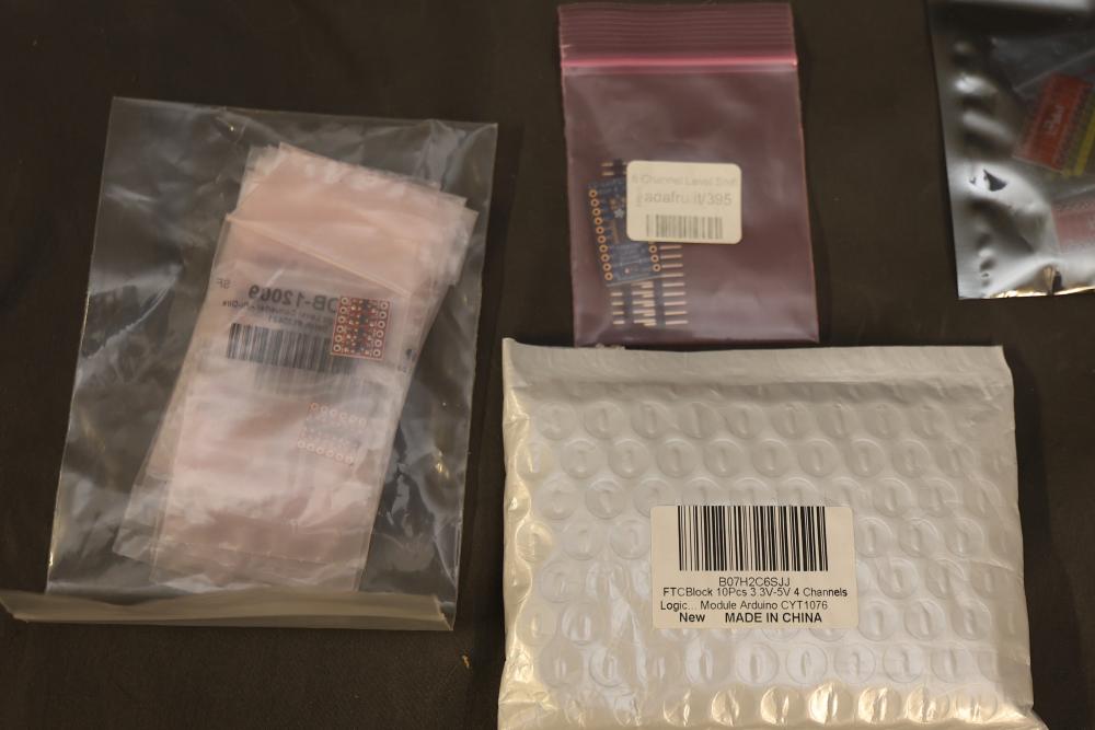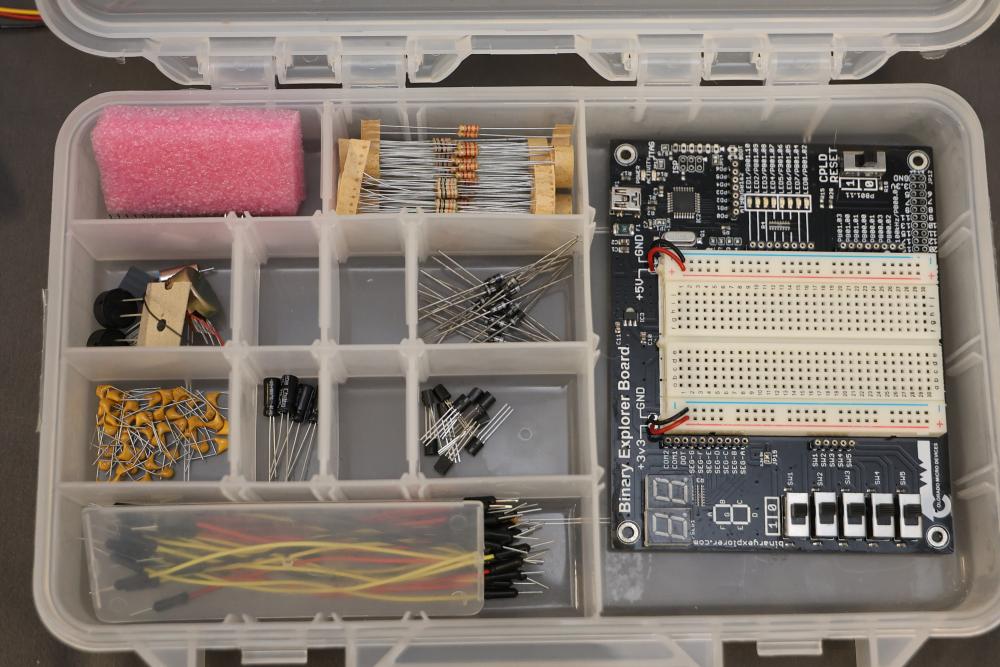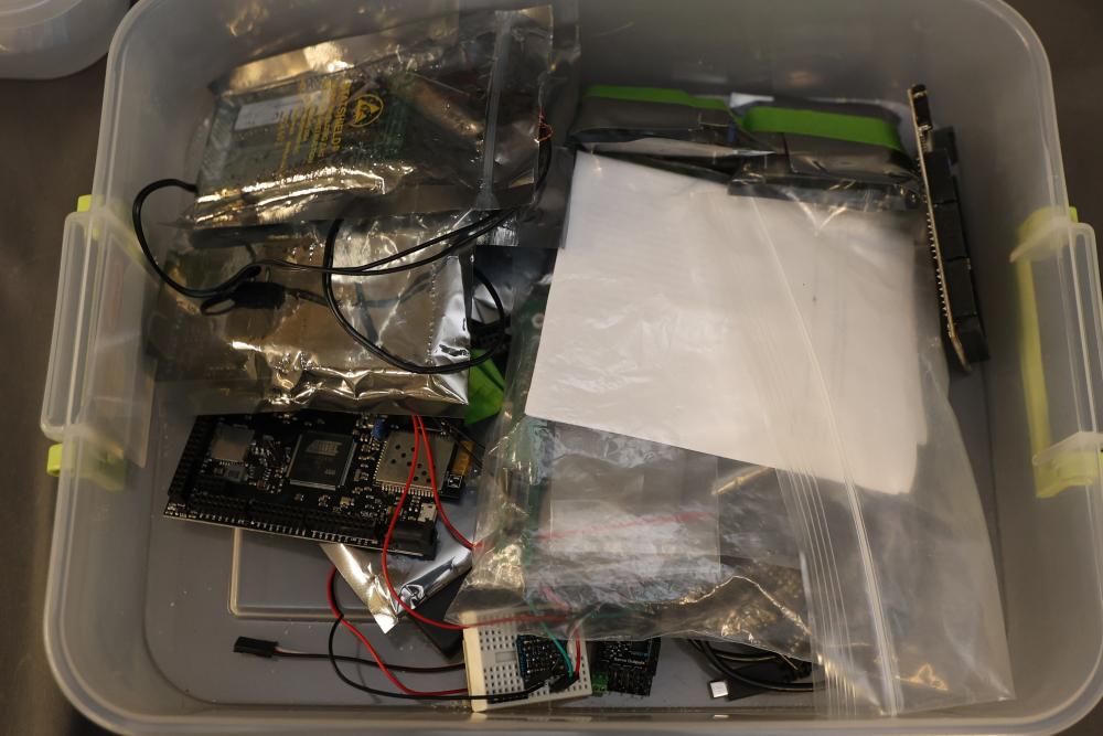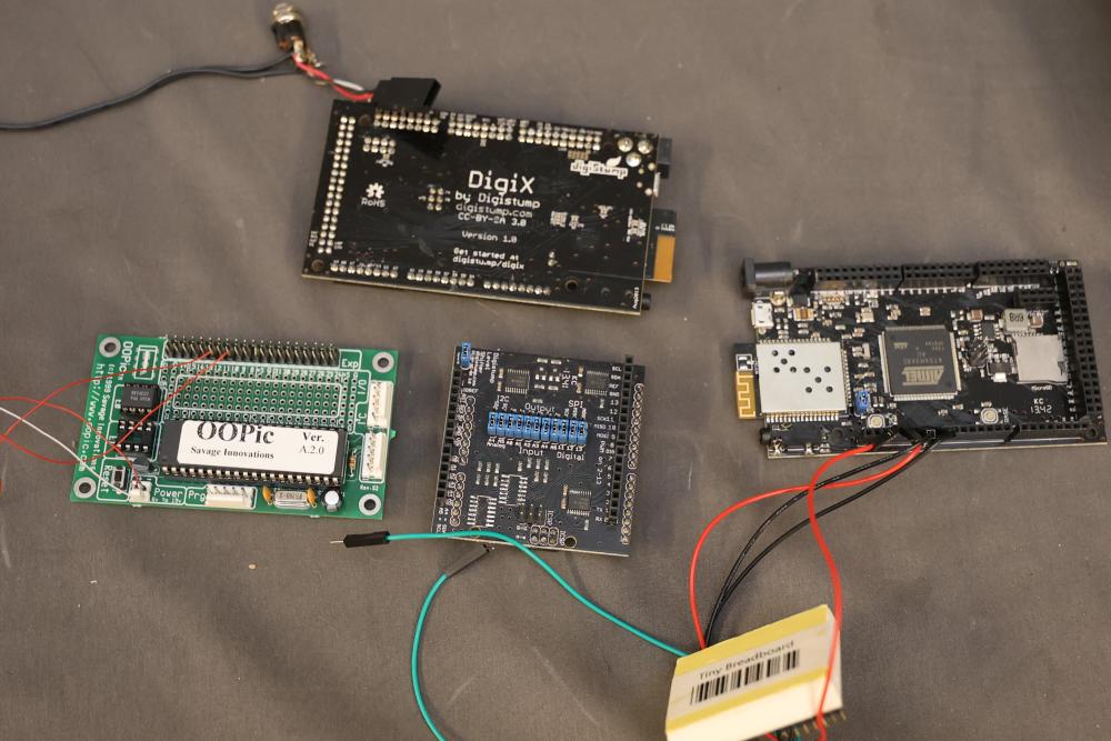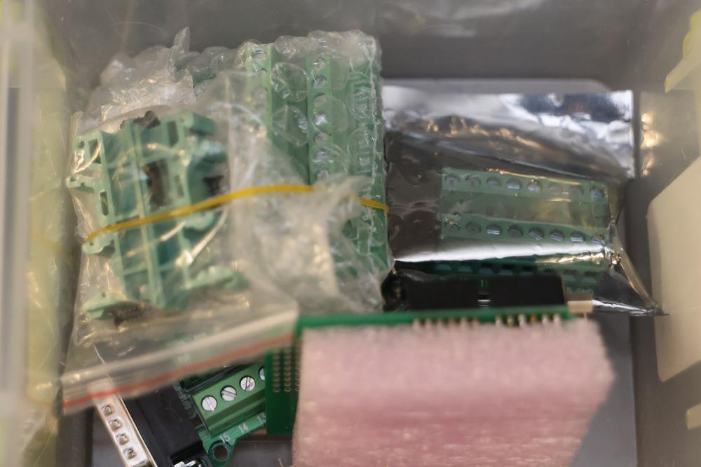 Electronics components and boards including LISY300 Gyroscope Module, Honeywell HMC6352 Compass Module, various breadboards, and DigiX boards. Additional items include prepackaged connectors, prototyping boards, wires, and a variety of small parts for electrical projects. All contents contained in multiple storage boxes and organized with small containers. Pickup only.