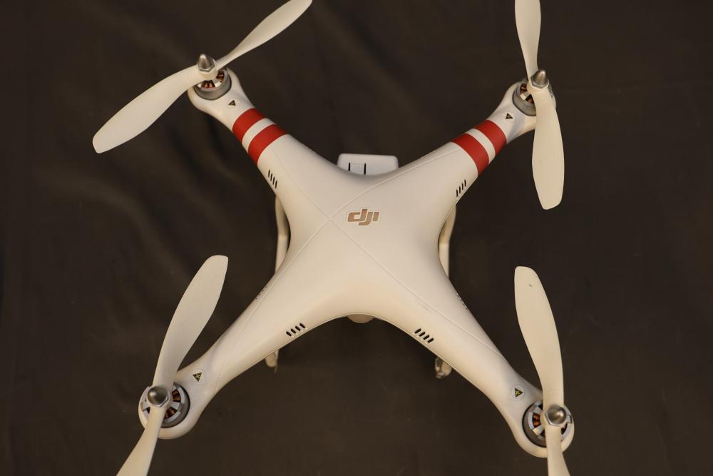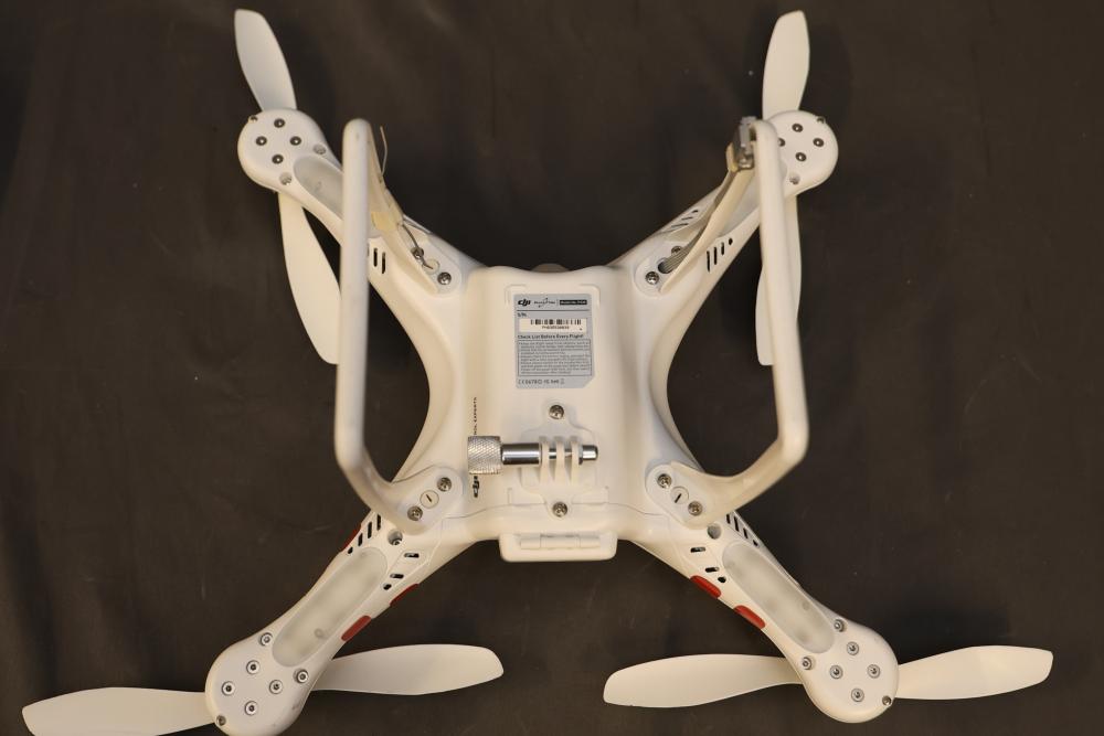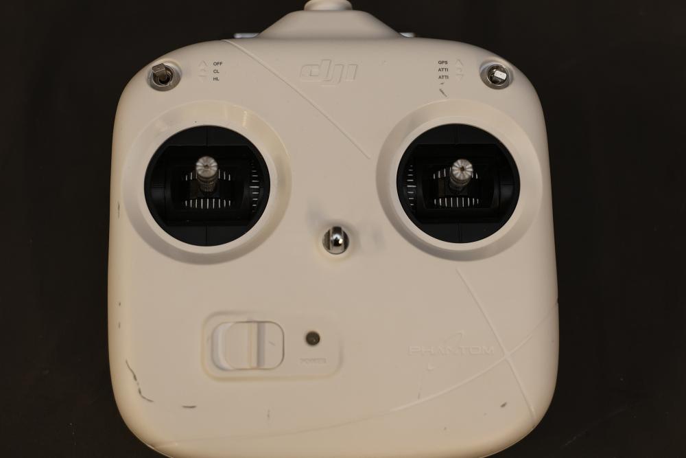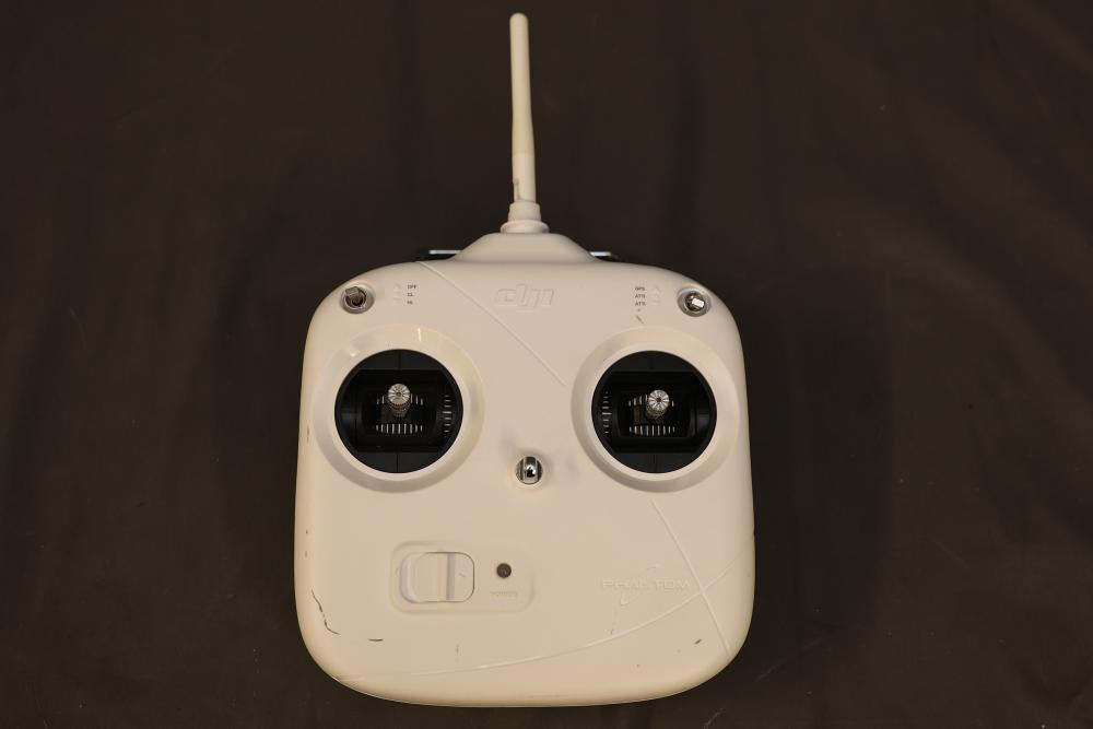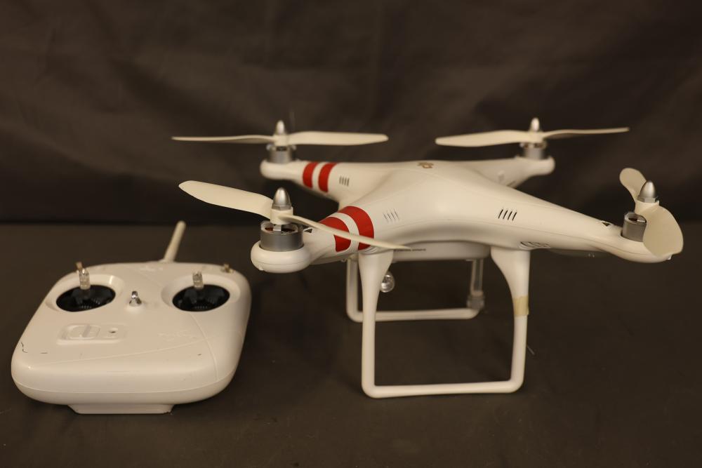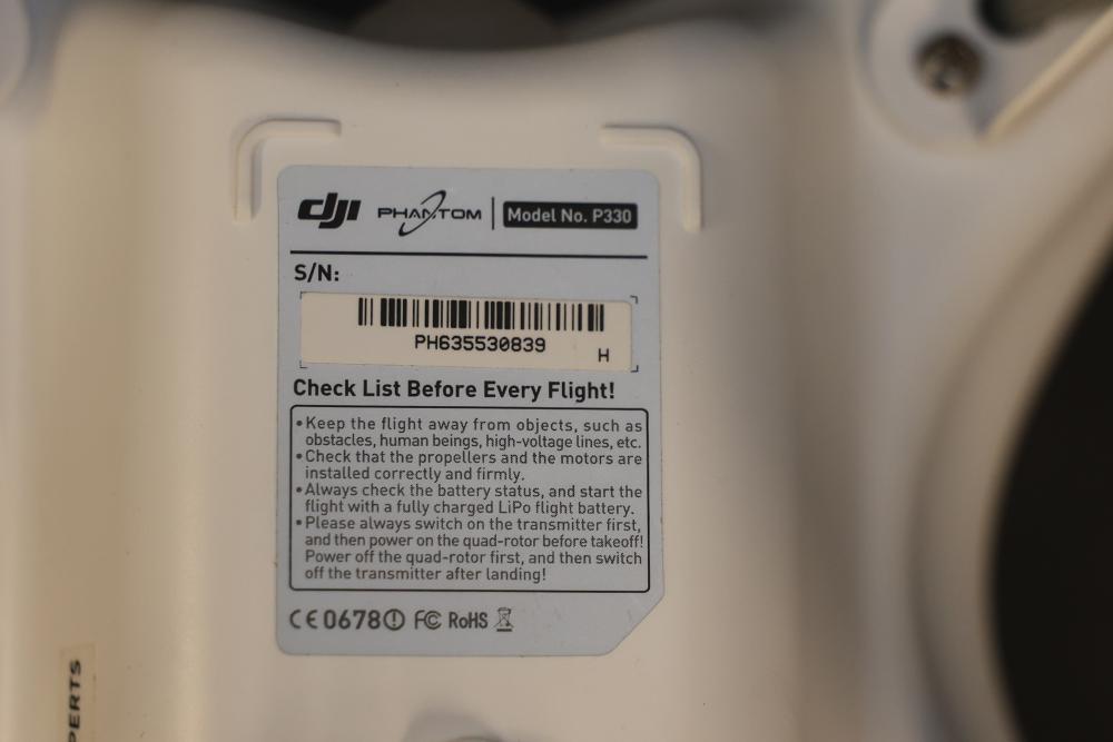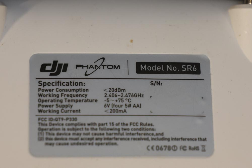 DJI Phantom drone model P330, featuring a quadcopter design with white body and red decals. Includes a DJI SR6 model controller with dual joystick layout. Specifications on drone list a power consumption of <20dBm and working frequency of 2.406–2.476GHz. Signs of previous use are visible on the controller and drone housing. Pickup only.