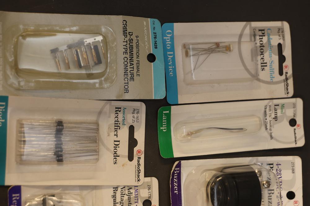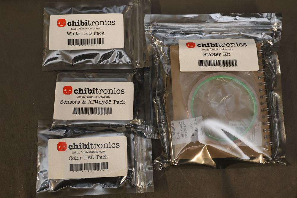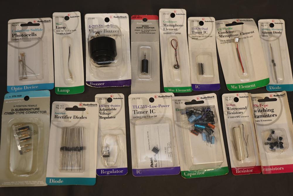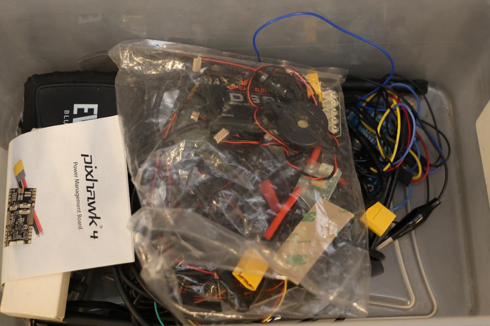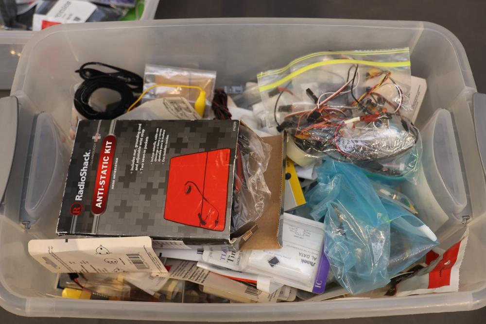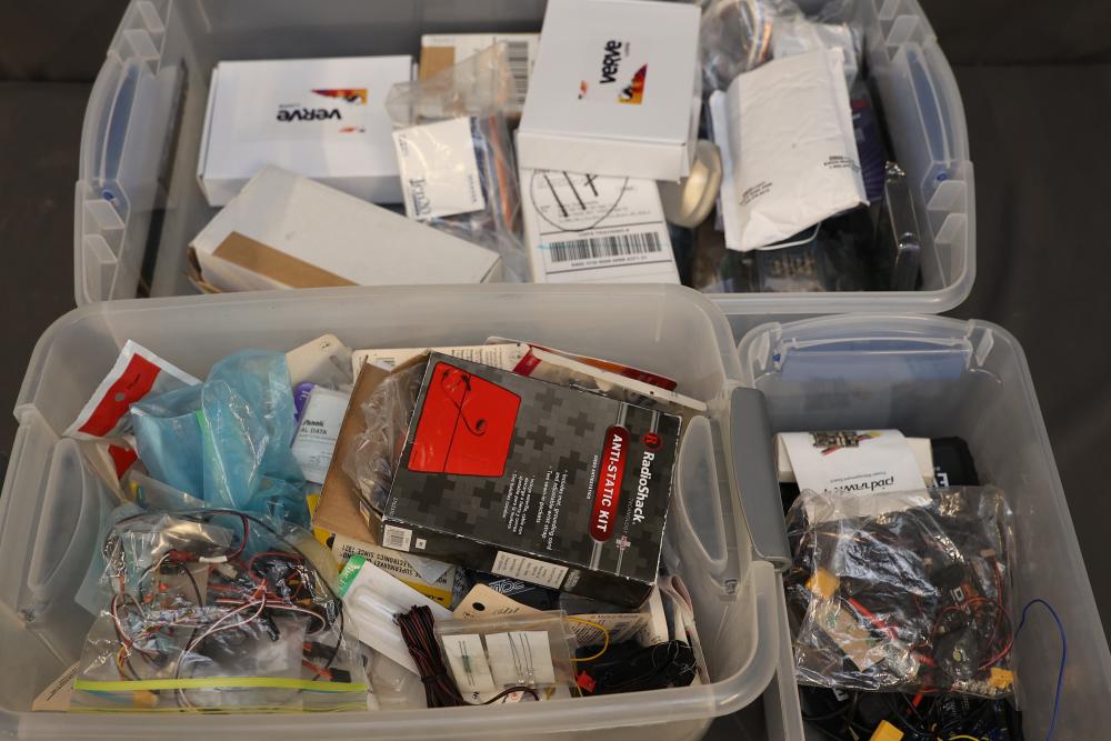A diverse assortment of electronic components and kits, featuring Verve inux kits, Ardupilot, DJI Lightbridge GoPro HDMI Cable, Hubhc LED driver, Chibitronics LED packs and starter kit, PIR motion sensor, anti-static kit, RadioShack components, Futaba battery, and various other electronic parts and materials. All items are arranged in plastic storage bins. Pickup only.
