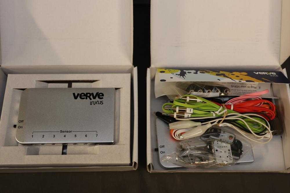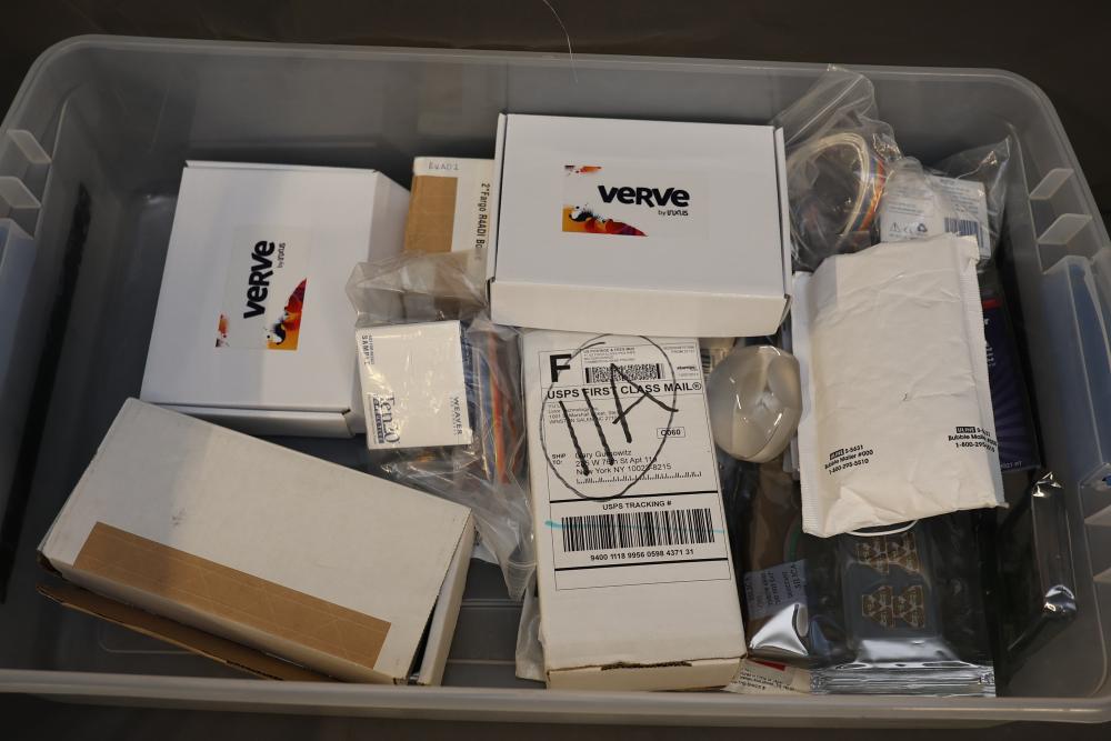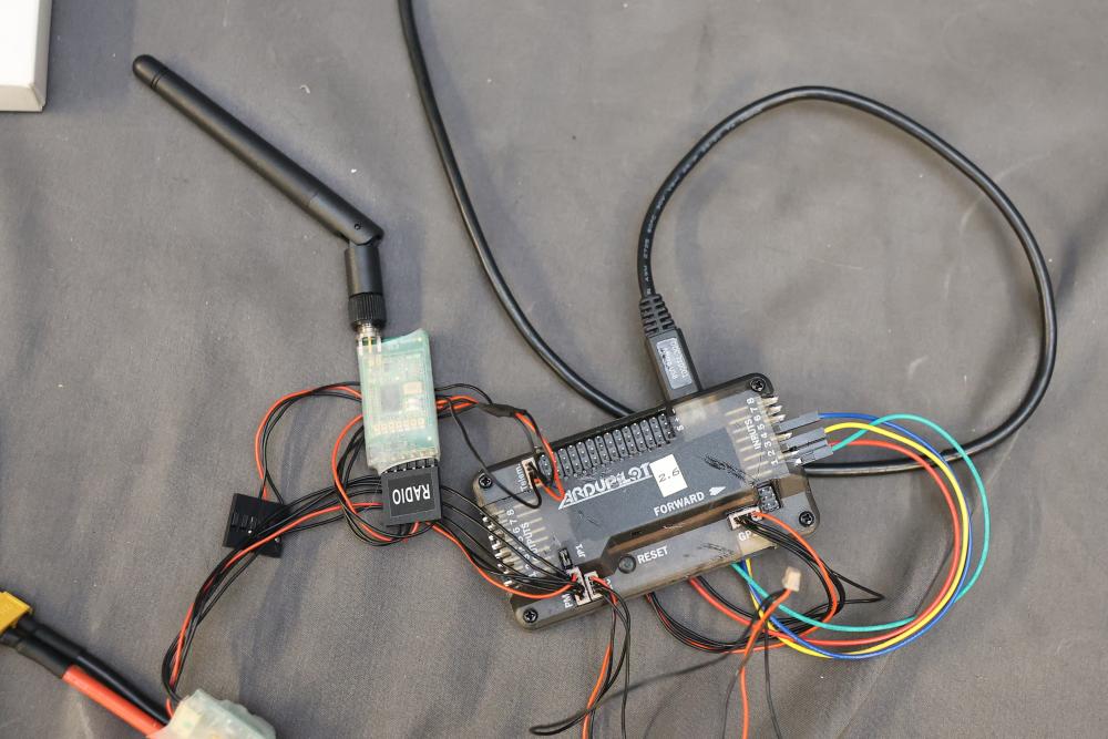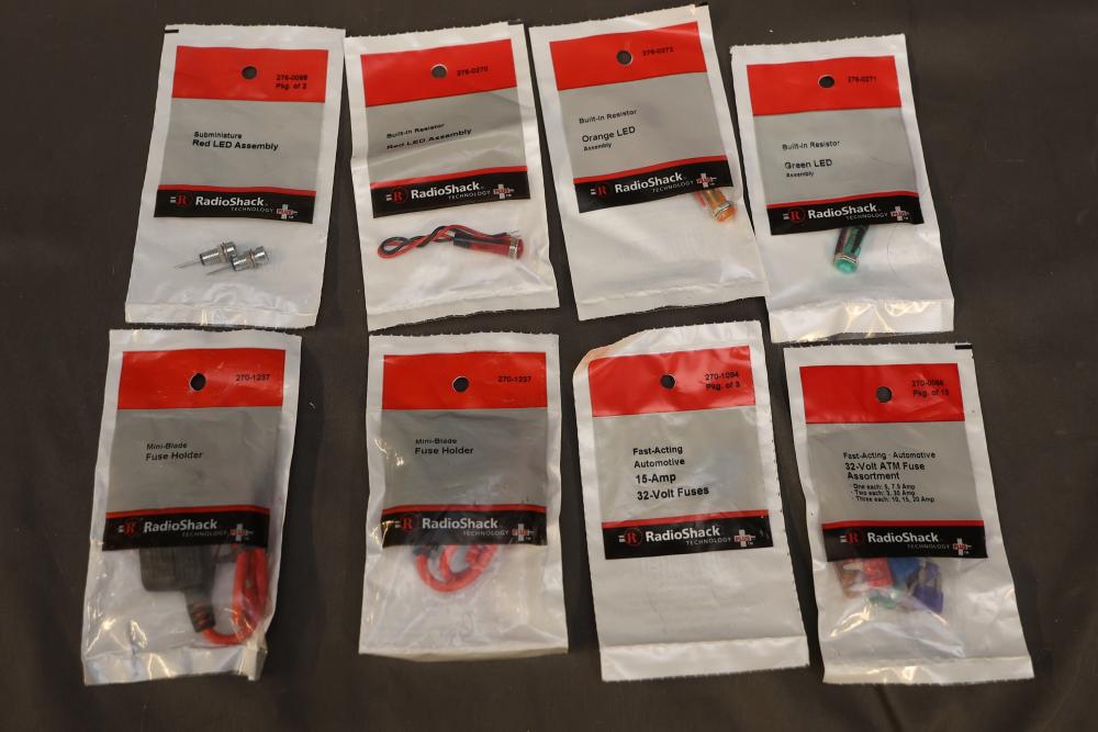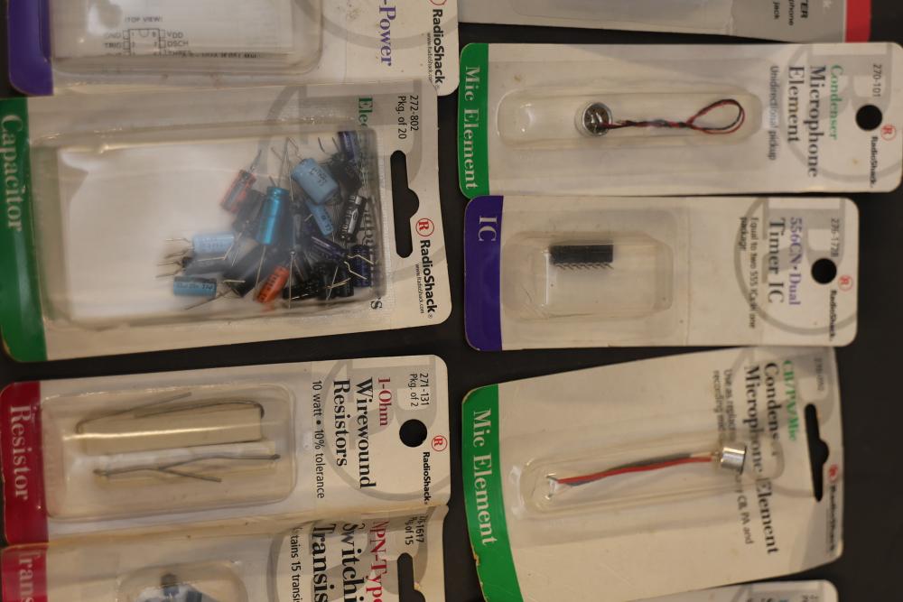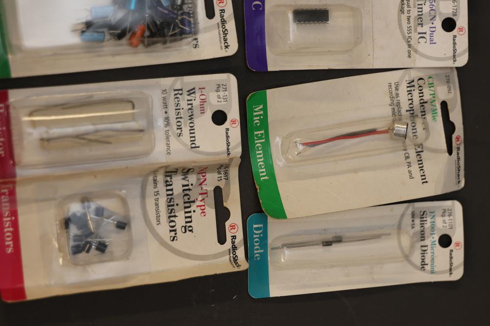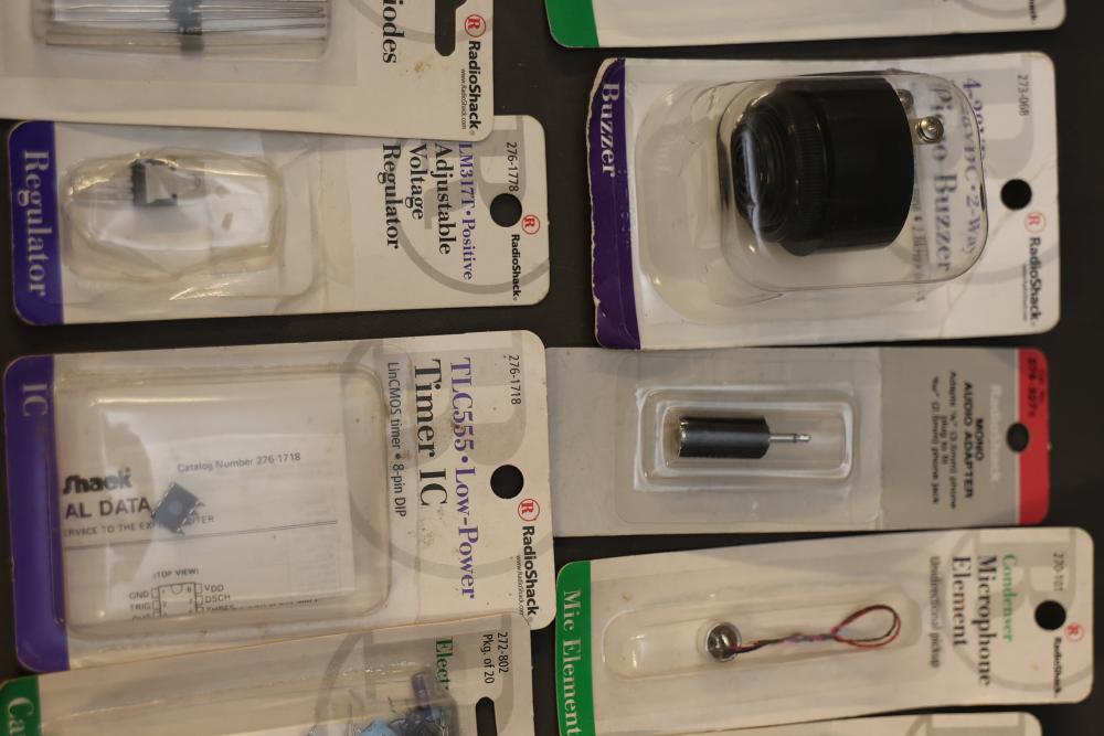 A diverse assortment of electronic components and kits, featuring Verve inux kits, Ardupilot, DJI Lightbridge GoPro HDMI Cable, Hubhc LED driver, Chibitronics LED packs and starter kit, PIR motion sensor, anti-static kit, RadioShack components, Futaba battery, and various other electronic parts and materials. All items are arranged in plastic storage bins. Pickup only.