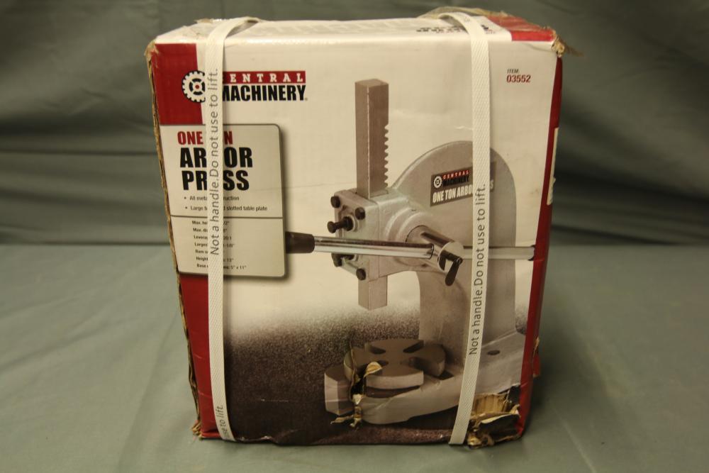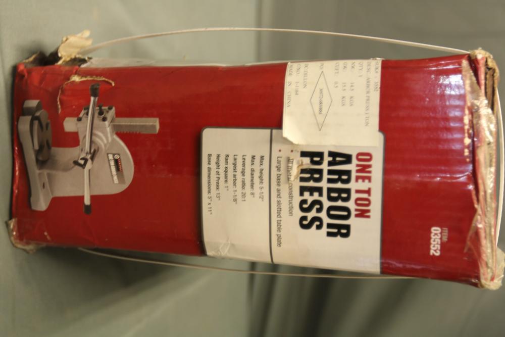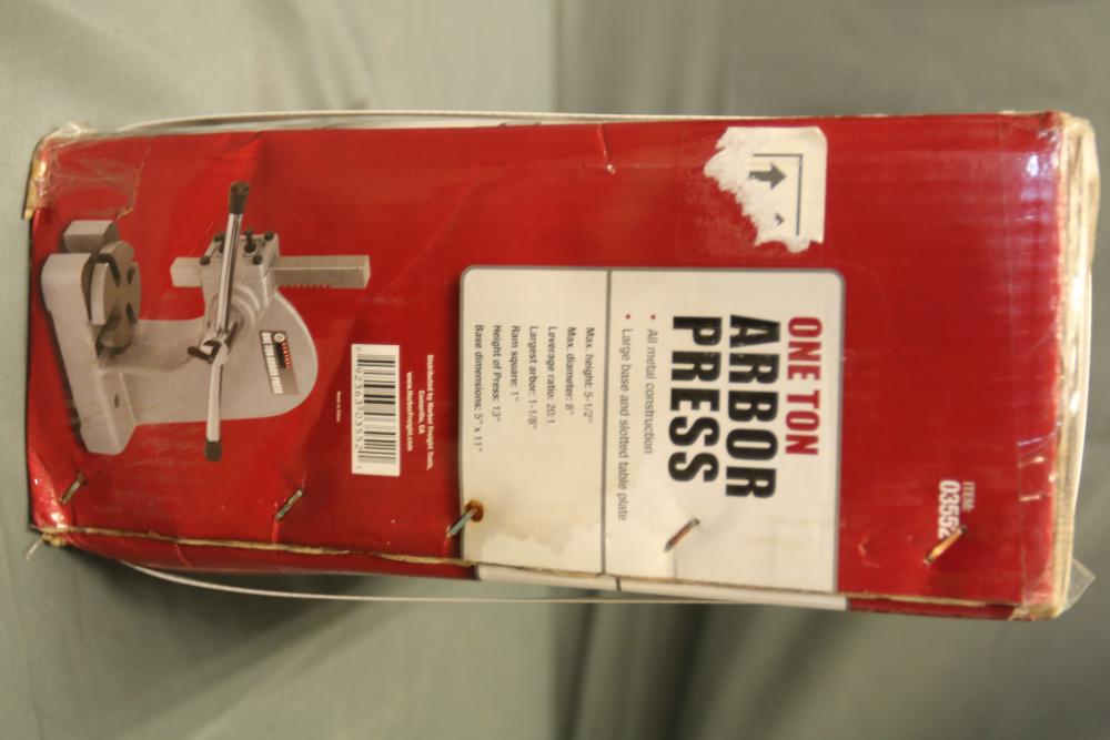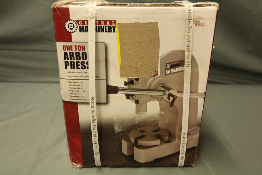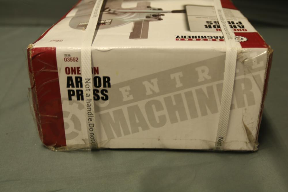 Central Machinery one ton arbor press in its original packaging. Item number 03552. The box shows visible wear and tear but remains sealed and intact. Pickup only.
