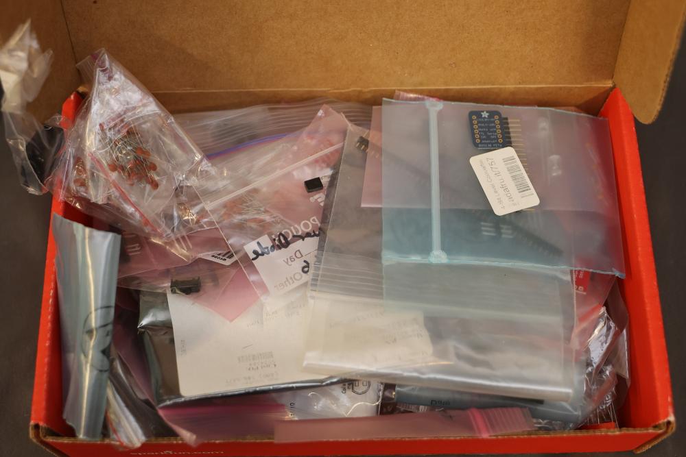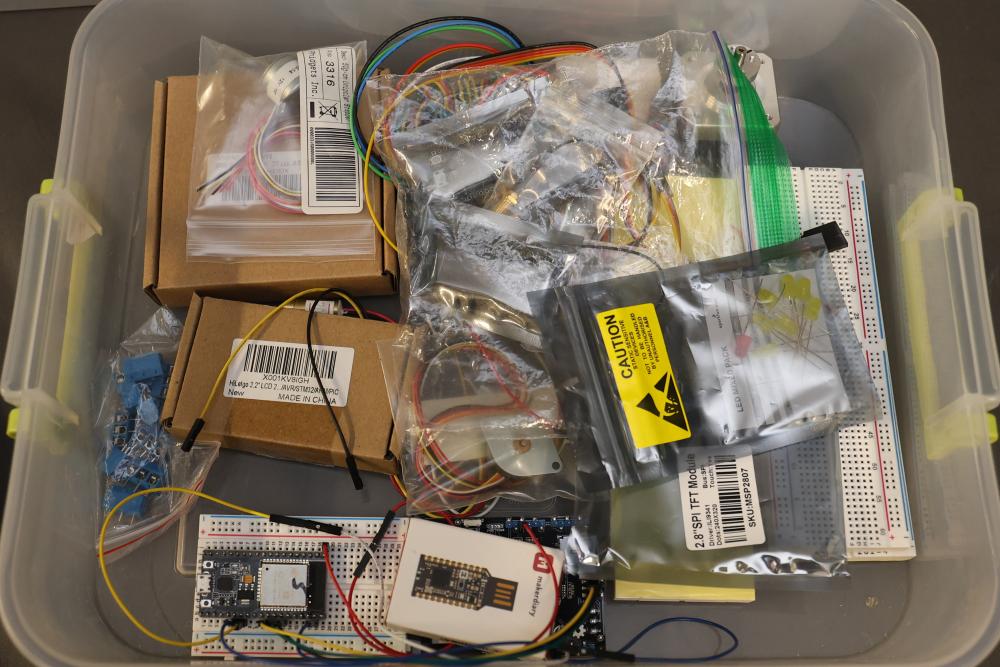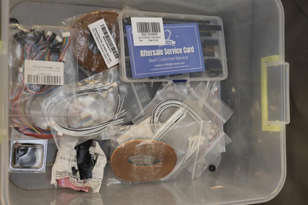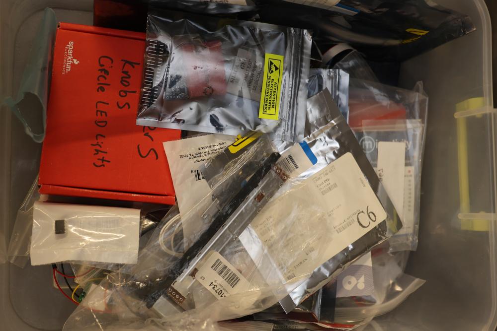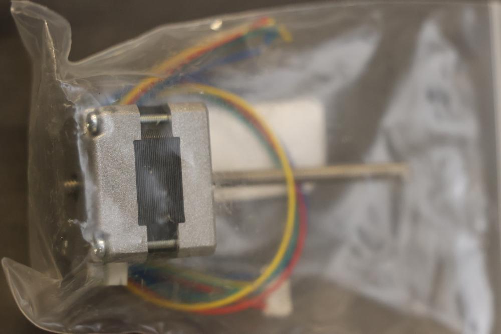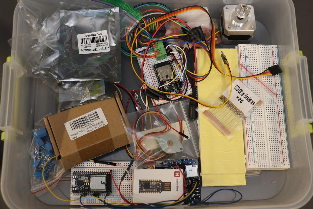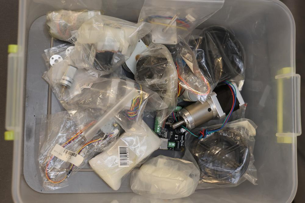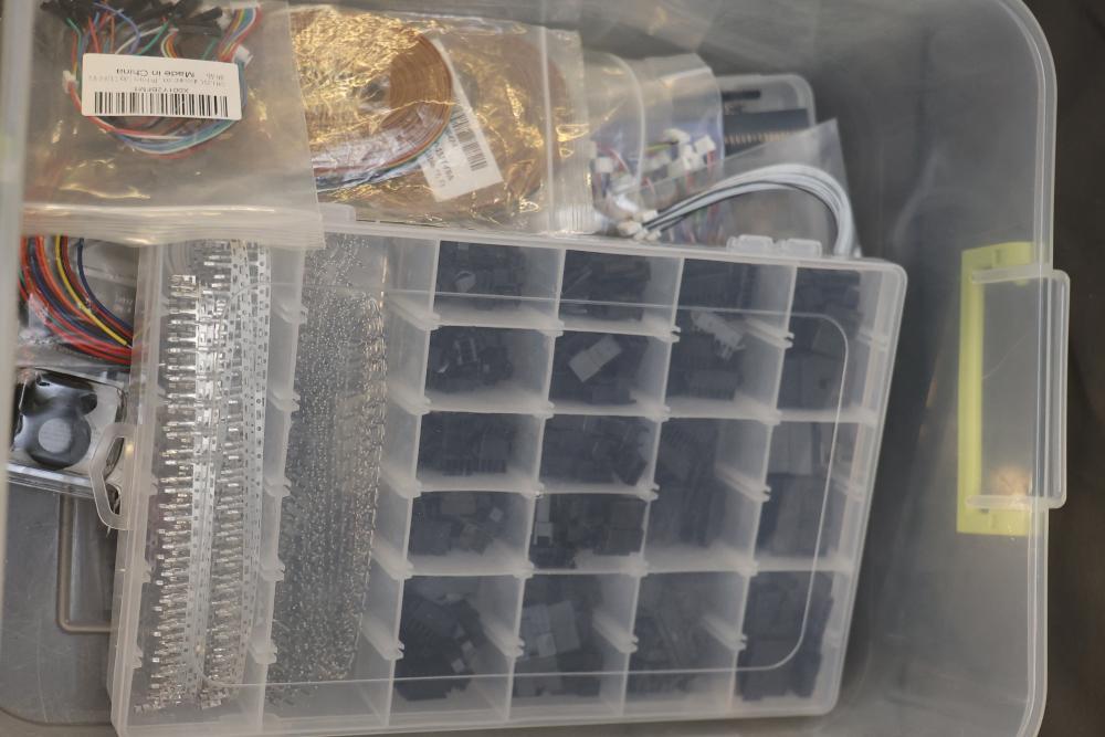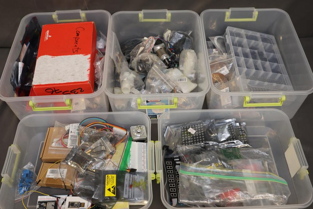 Electronics and components including stepper motors, control boards, cables, connectors, SPI TFT module, breadboards, display modules, and various small parts stored in labeled bins and containers. Suitable for prototyping and electronic projects. Some items appear unused or in their original packaging. Pickup only.