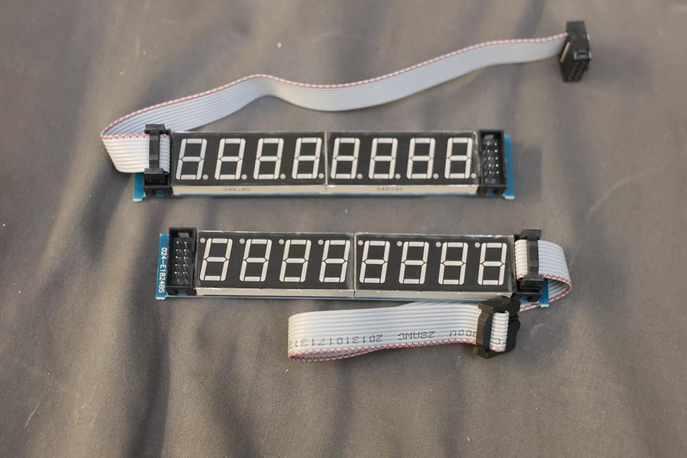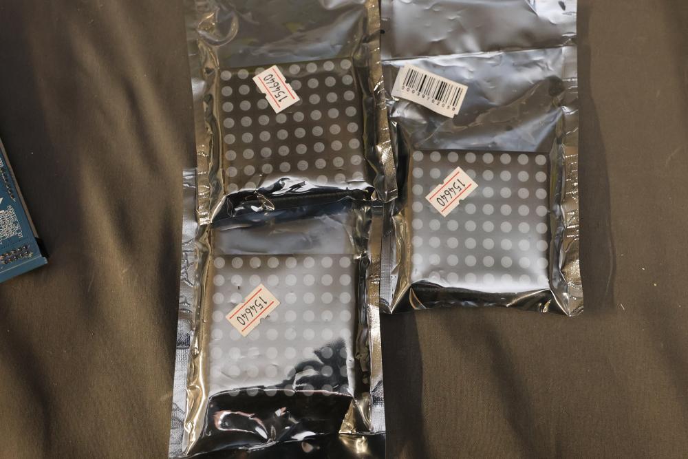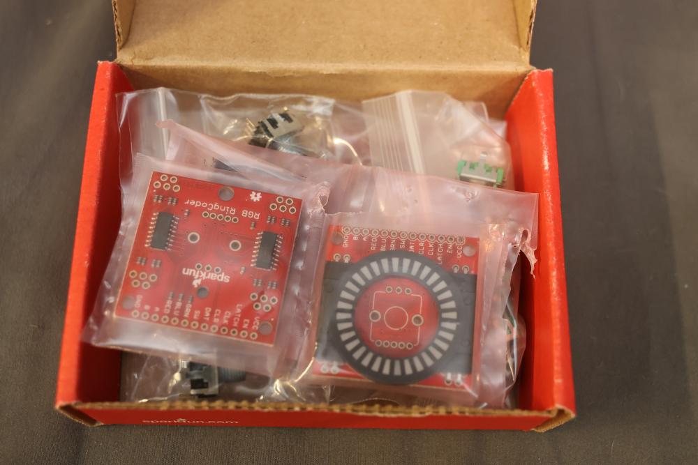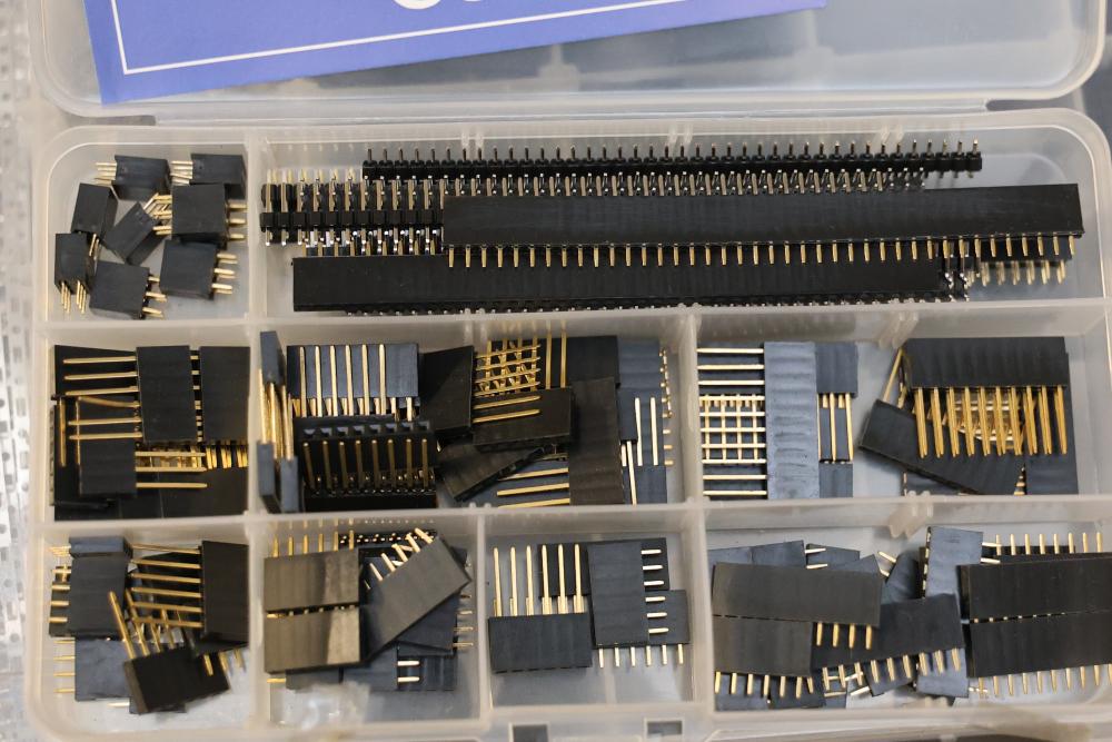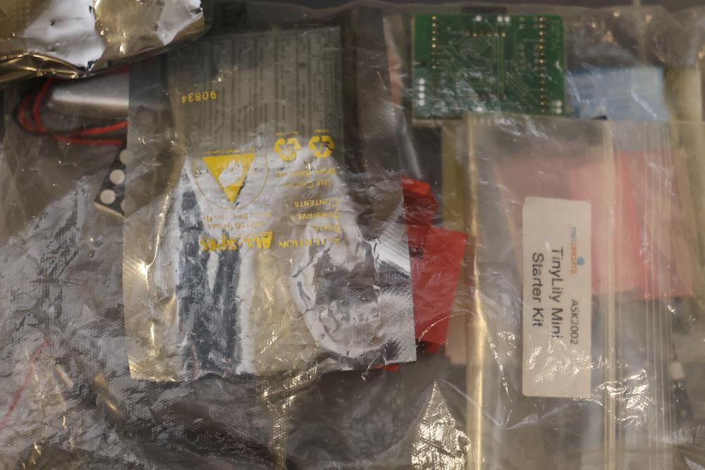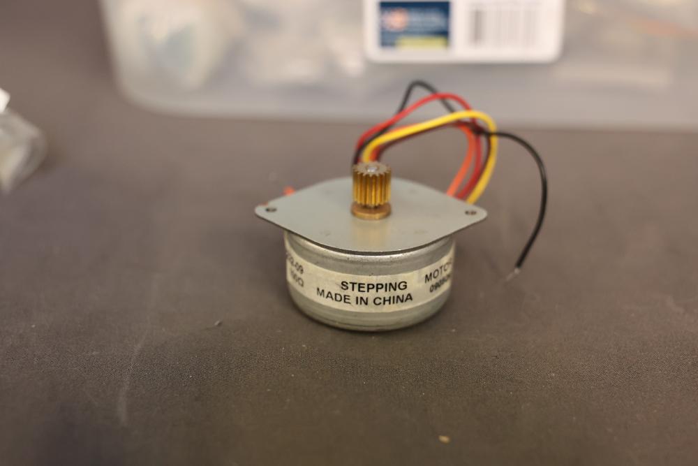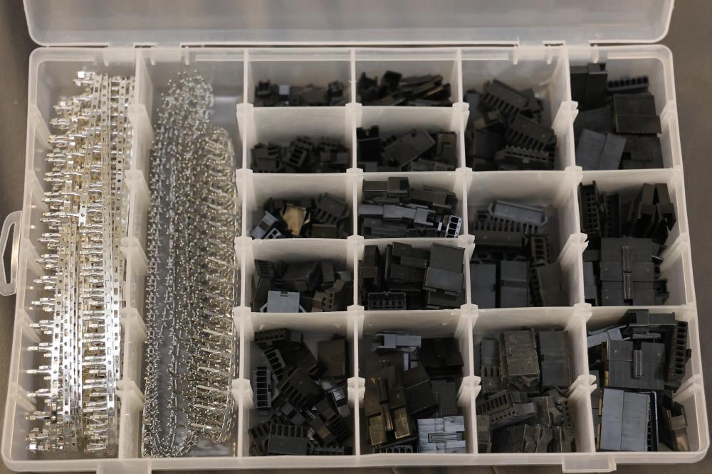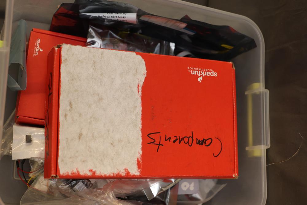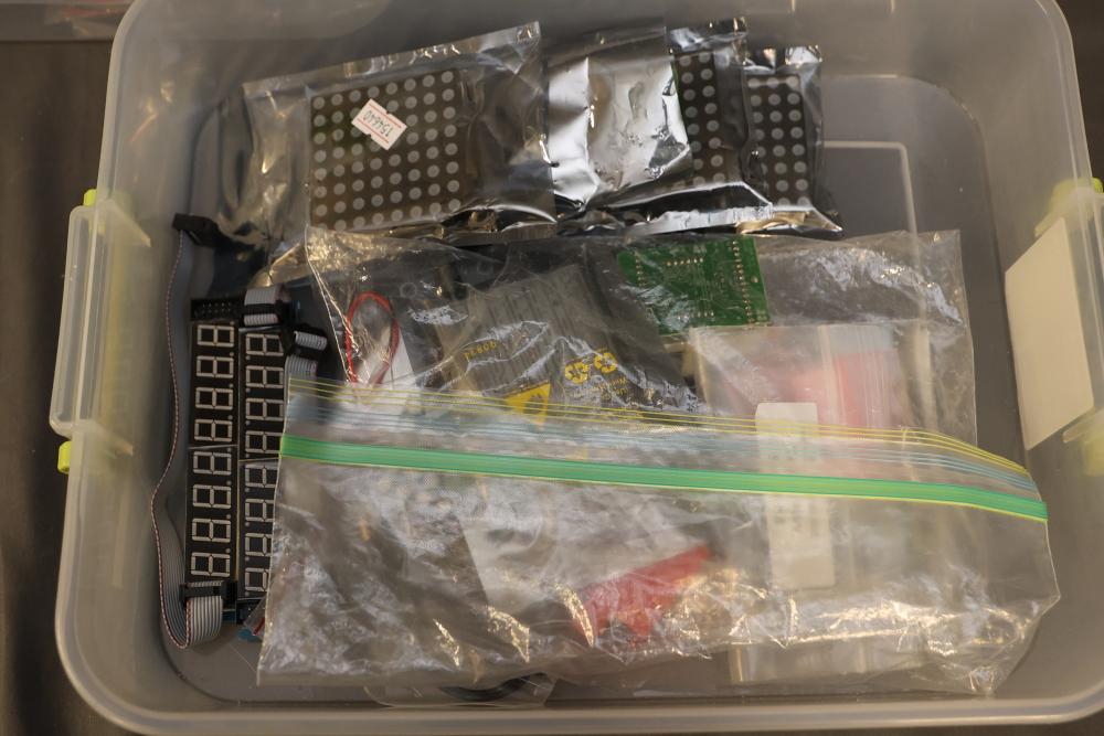 Electronics and components including stepper motors, control boards, cables, connectors, SPI TFT module, breadboards, display modules, and various small parts stored in labeled bins and containers. Suitable for prototyping and electronic projects. Some items appear unused or in their original packaging. Pickup only.