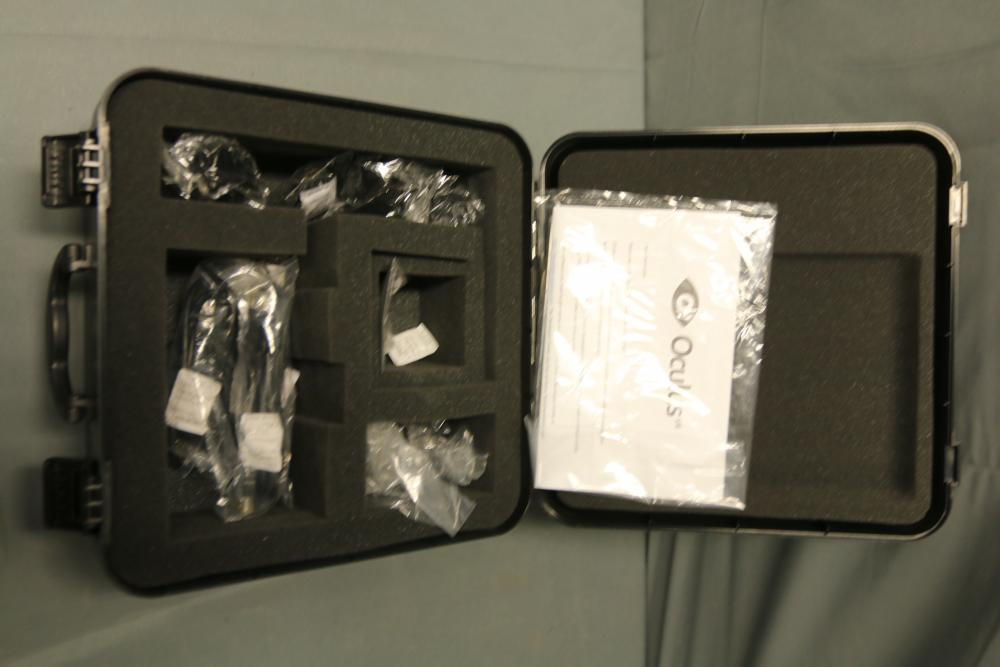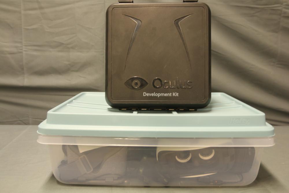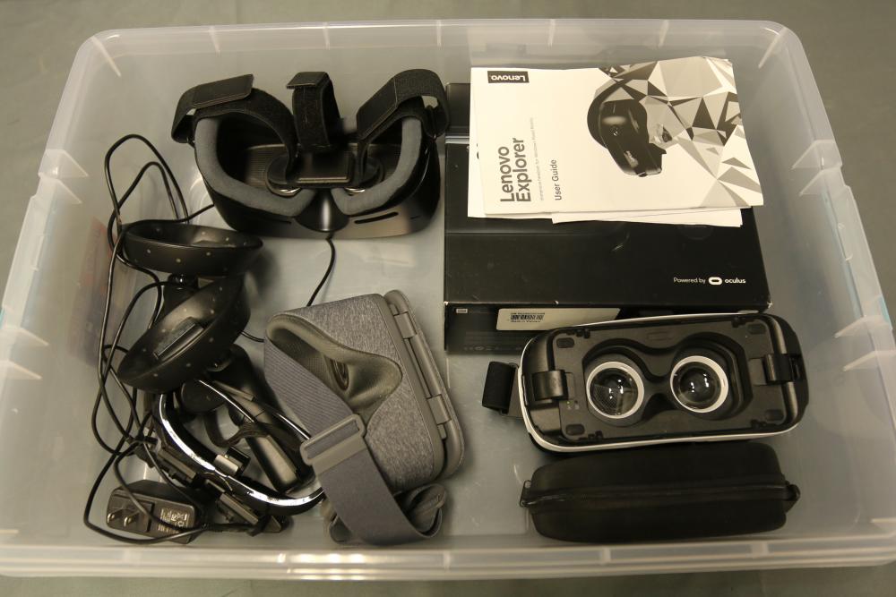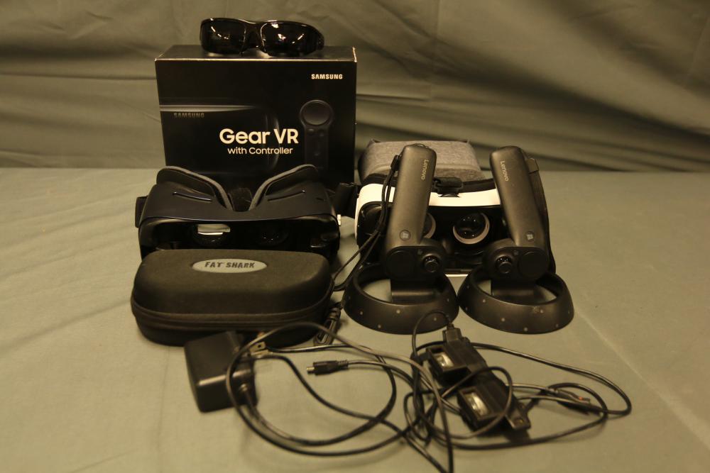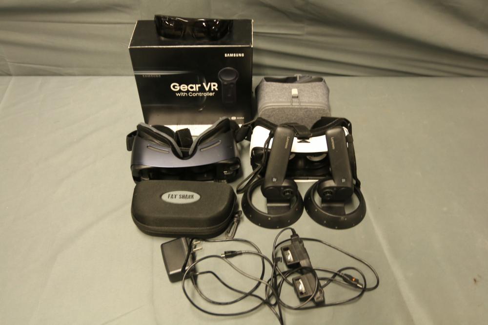 Virtual reality equipment that includes Oculus Development Kit with carrying case, Samsung Gear VR with controller and box, Lenovo Explorer headset and controllers, Fat Shark headset with accessories, and additional VR items. Items are in used condition. Pickup only.
