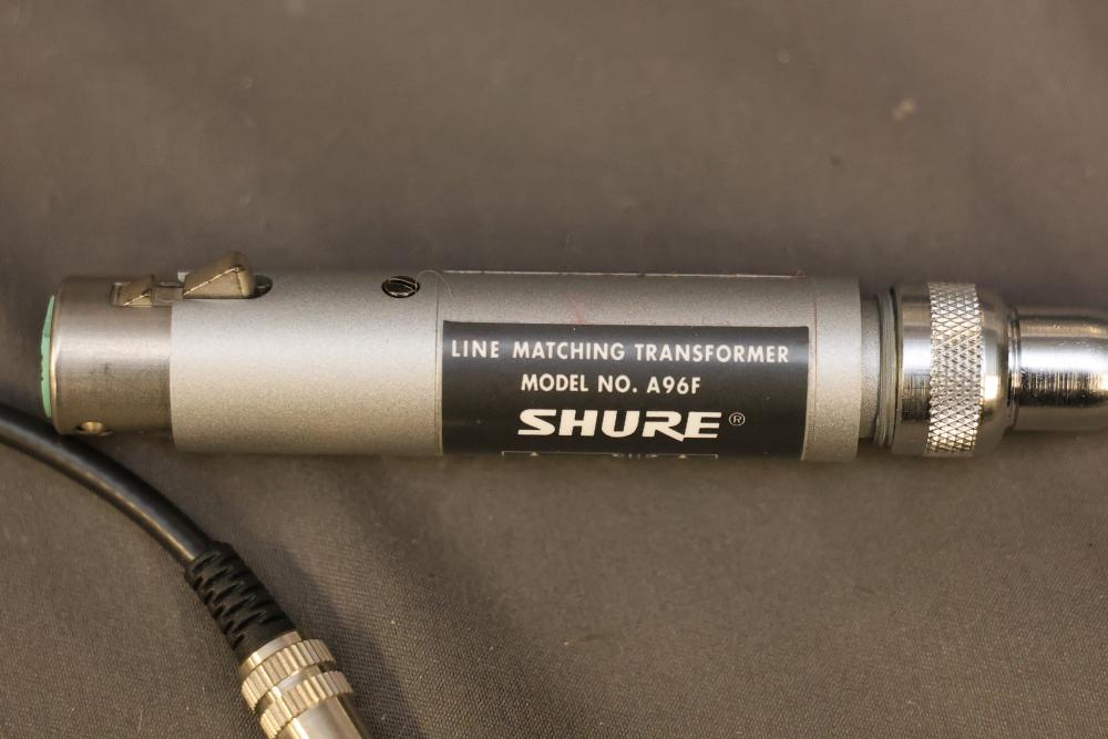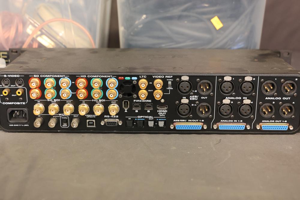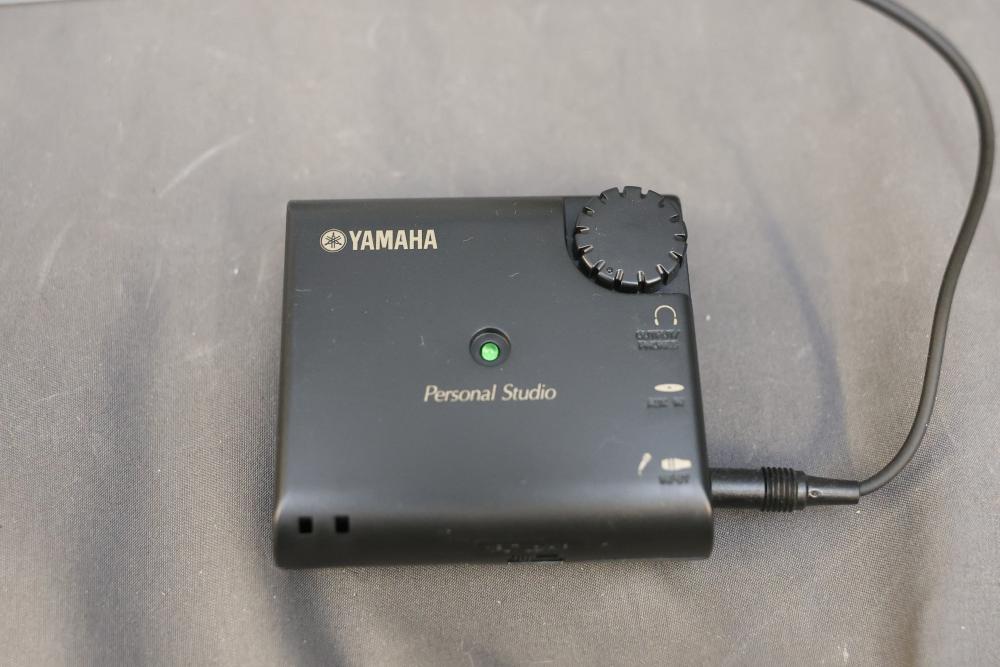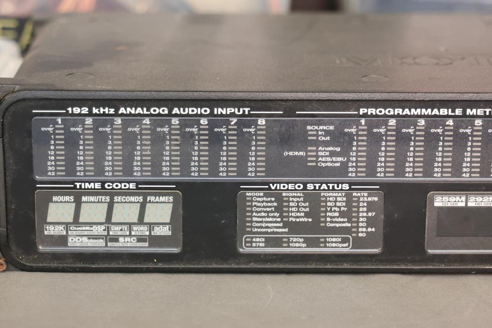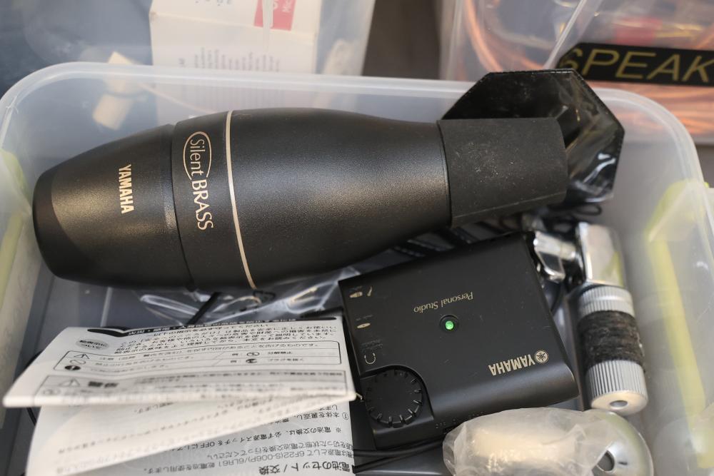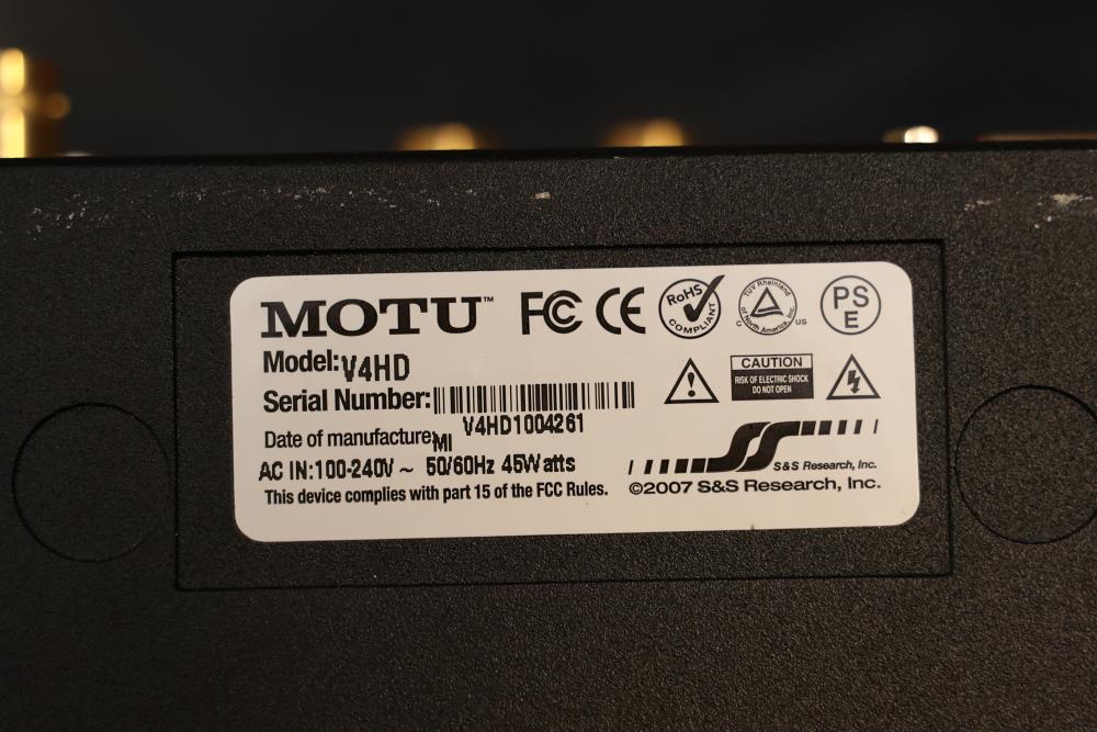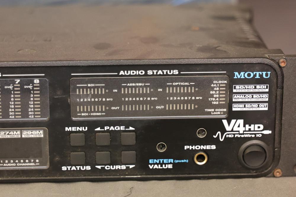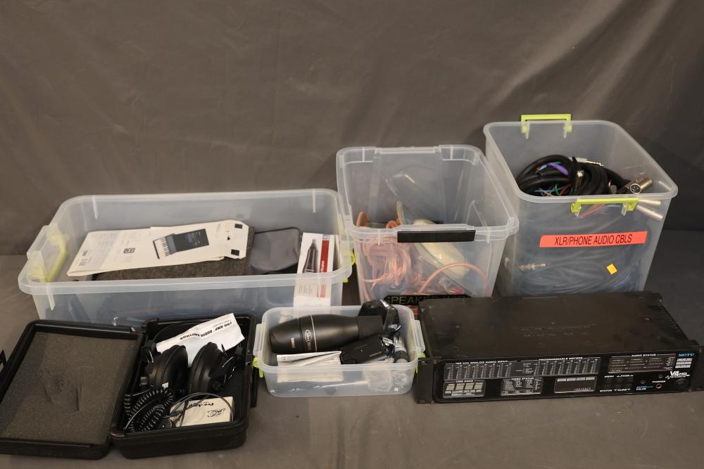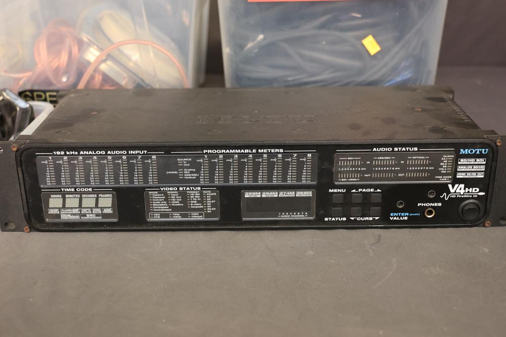 Audio equipment consisting of a MOTU V4HD audio/video interface, Yamaha Silent Brass system with accessories, headphones, Pro-Amp LKM-1036 amplifier, RadioShack omnidirectional microphone, Shure A96F line matching transformer, Belkin Pure AV 15-gauge speaker cable, multiple audio cables, and a Miselu C.24 music creation tool. Pickup only.