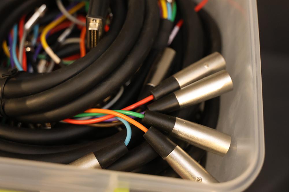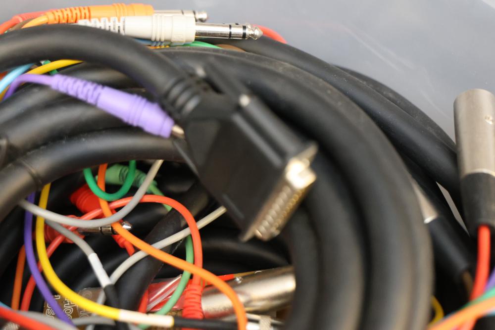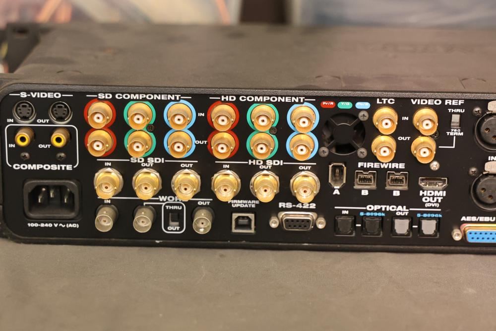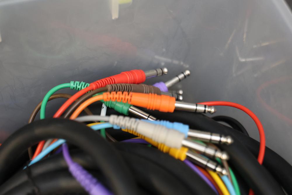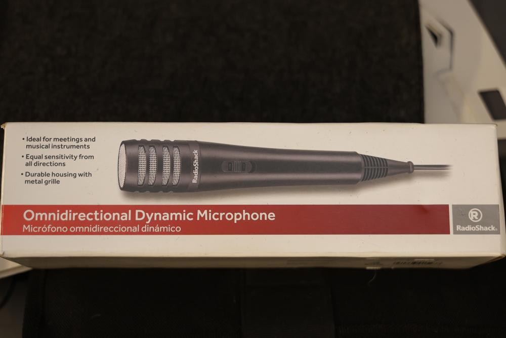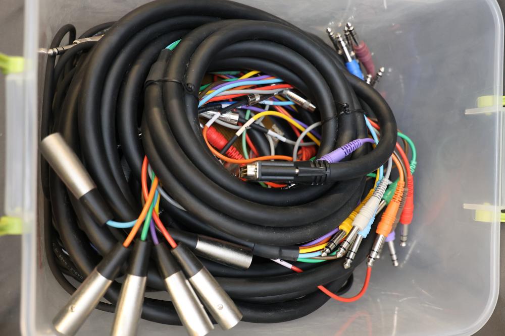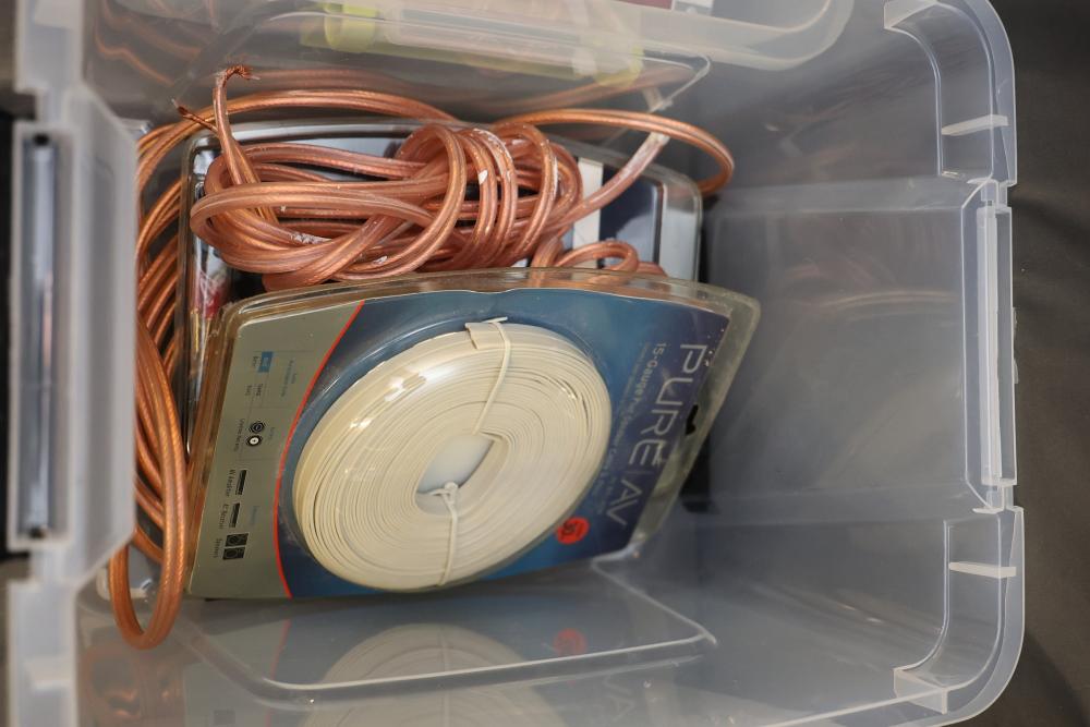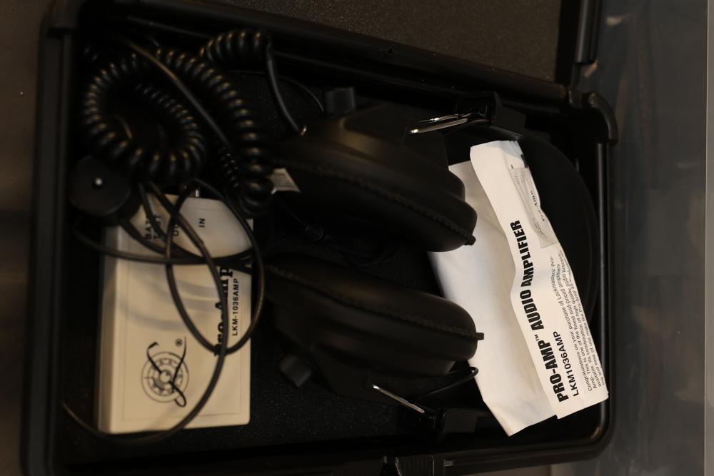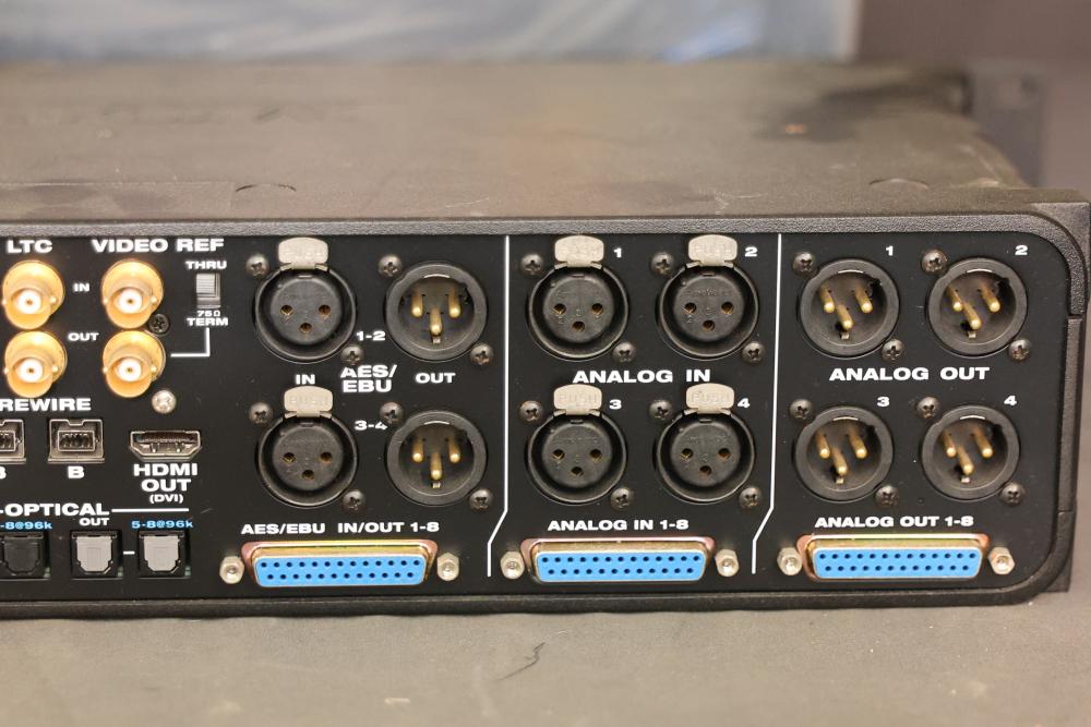 Audio equipment consisting of a MOTU V4HD audio/video interface, Yamaha Silent Brass system with accessories, headphones, Pro-Amp LKM-1036 amplifier, RadioShack omnidirectional microphone, Shure A96F line matching transformer, Belkin Pure AV 15-gauge speaker cable, multiple audio cables, and a Miselu C.24 music creation tool. Pickup only.