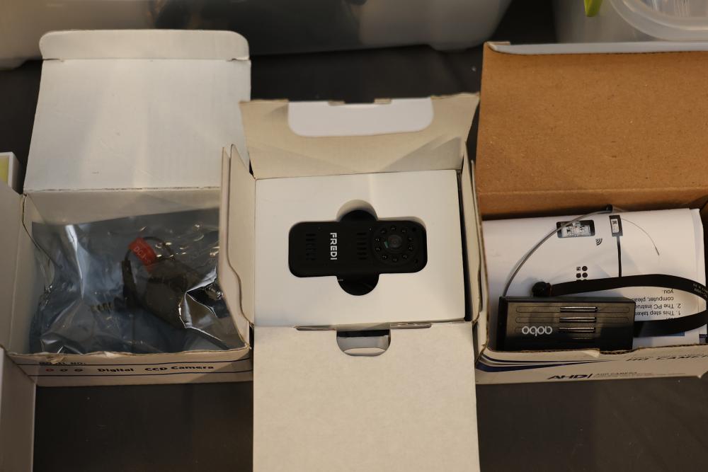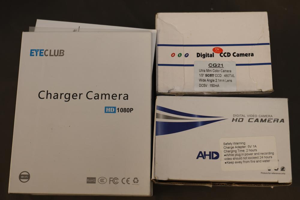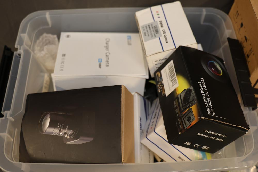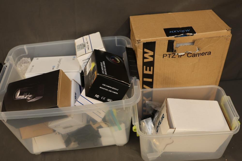 Cameras and accessories consisting of models such as wireless network cameras, USB camera modules, HD cameras, and PTZ IP cameras. Brands include Mokose, ELP, and others. Components include wired and wireless models, CCD cameras, and chargers. Conditions range from new to pre-owned with packaging included for some items. Pickup only.