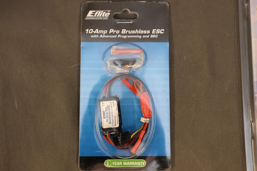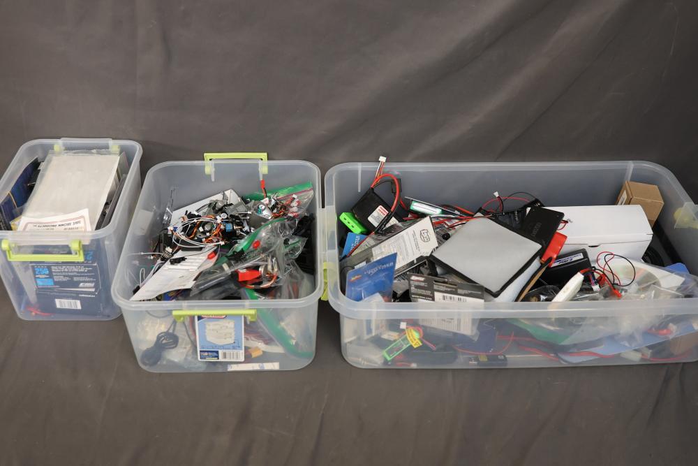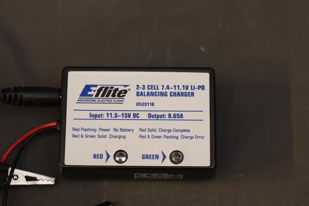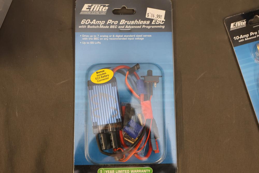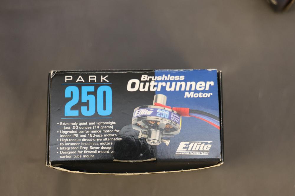 Multiple electronic components, chargers, and accessories. Items include Eflite balancing chargers, variable rate chargers, brushless motors by Eflite (Park 250, Park 400, Park 480), a Triton computerized charger, NiMH and LiPo batteries, wiring kits, an ISolderStore gyroscope soldering kit, and a 10-amp pro brushless ESC. Pickup only.