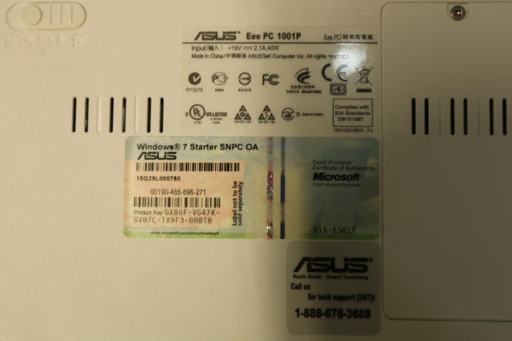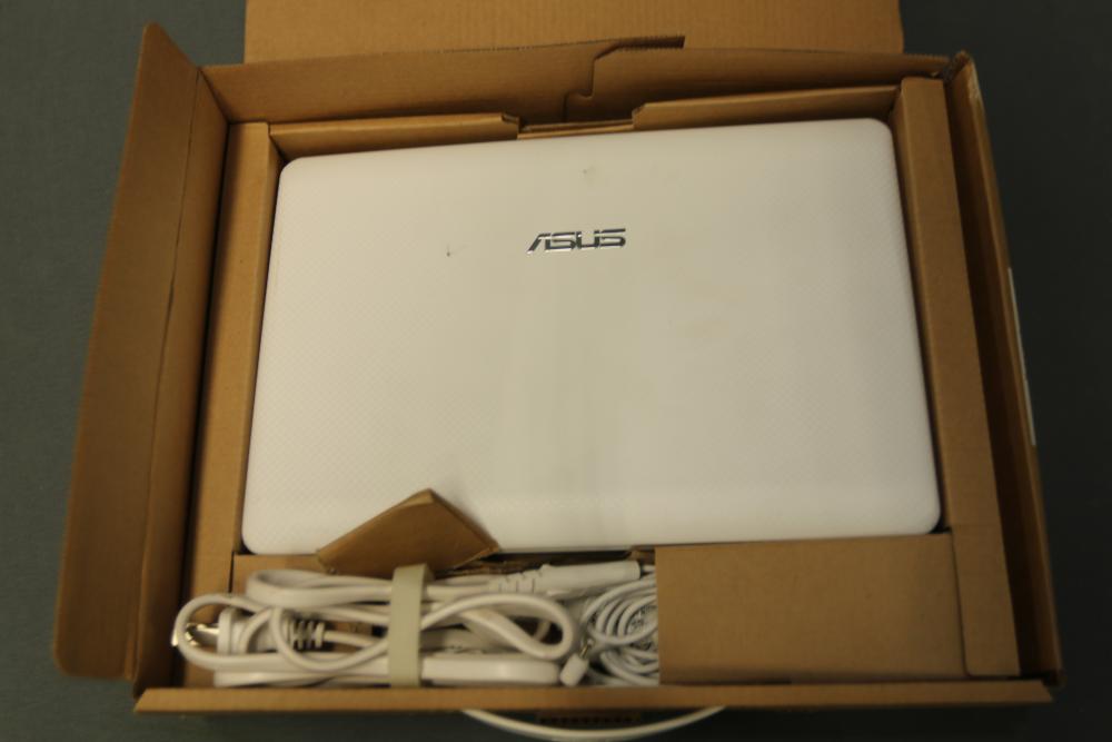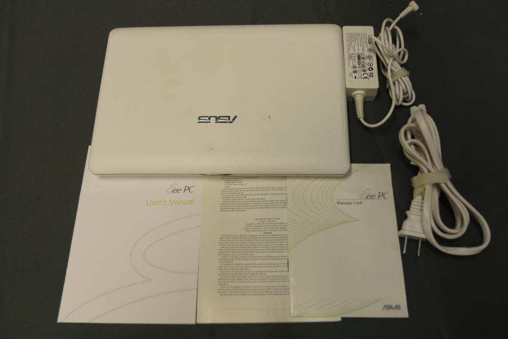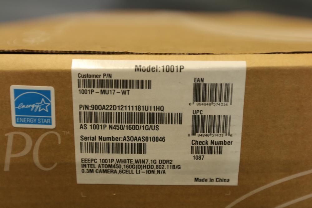 Asus Eee PC 1001P netbook featuring Intel Atom N450 processor, 1GB DDR2 RAM, 160GB HDD, and Windows 7 Starter. Includes original packaging, power adapter, and documentation. Pickup only.