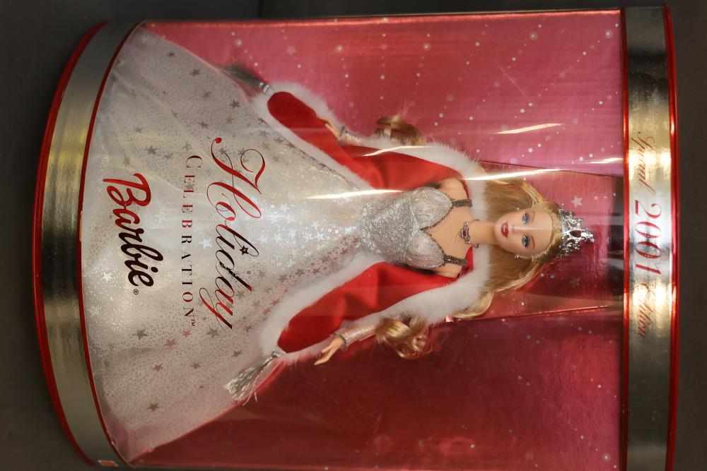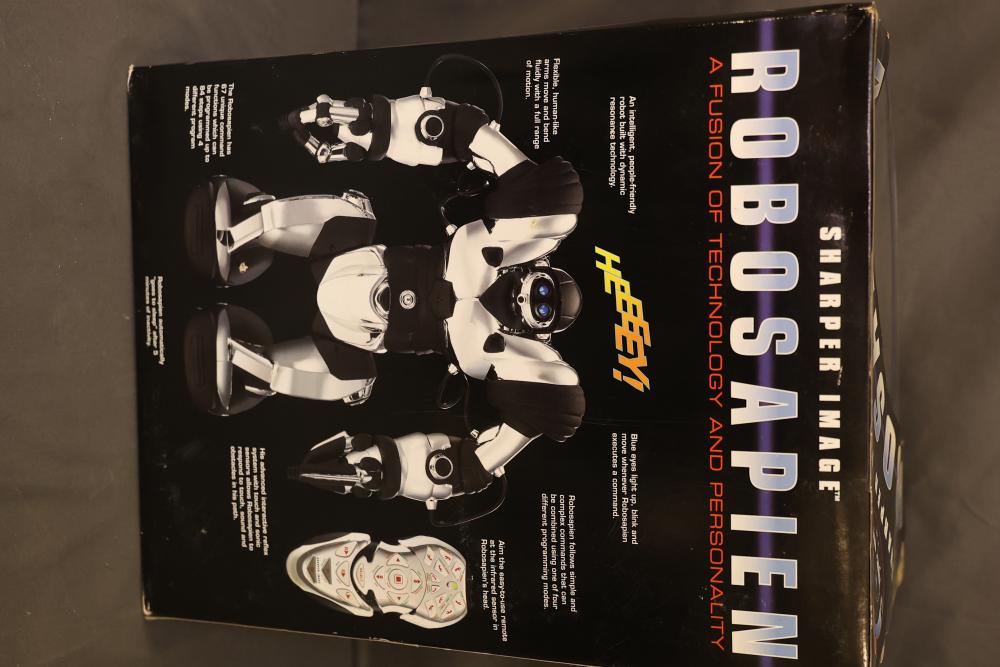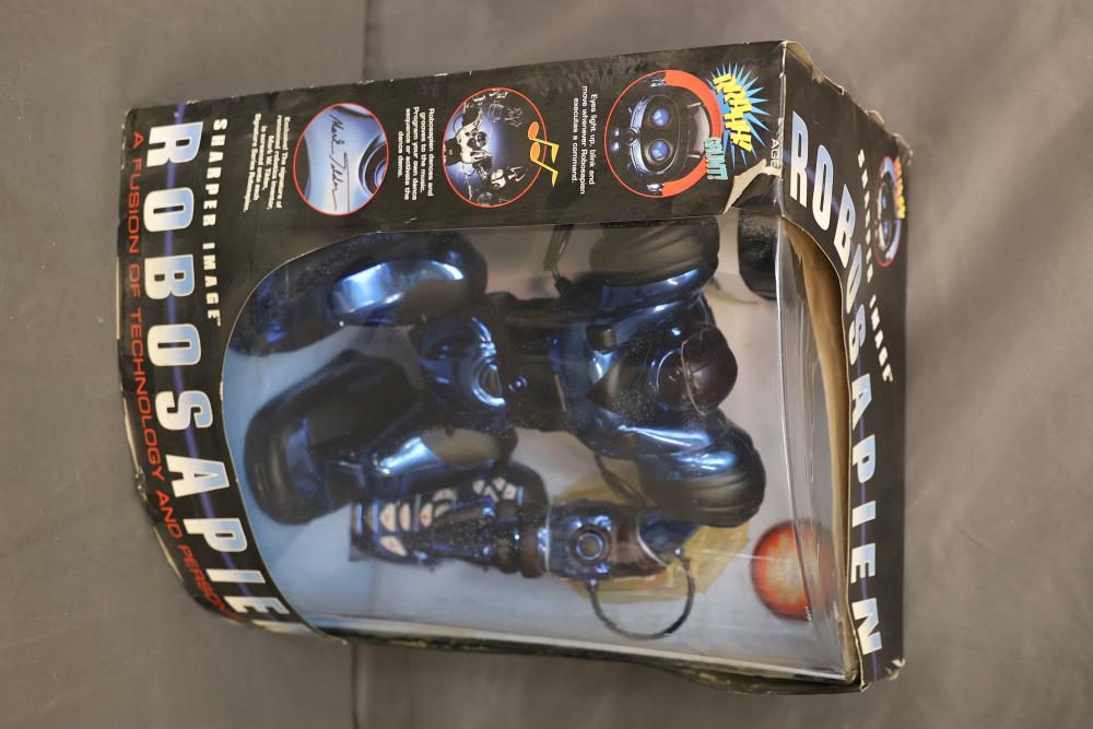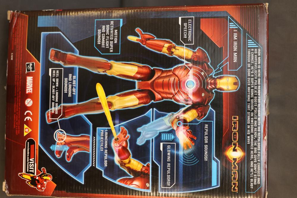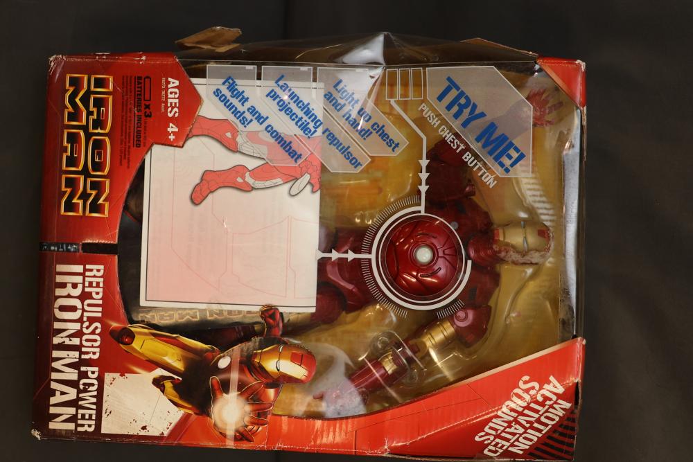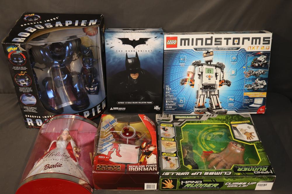 Items featuring unopened or partially opened toys: Iron Man Repulsor Power action figure, 2004 Holiday Celebration Barbie in original packaging, Remote Control Hand Runner, Star Wars Robosapien robot, The Dark Knight Batman 1/6-scale deluxe figure, and LEGO Mindstorms NXT 2.0 including instruction manual and pieces in bags. Pickup only.