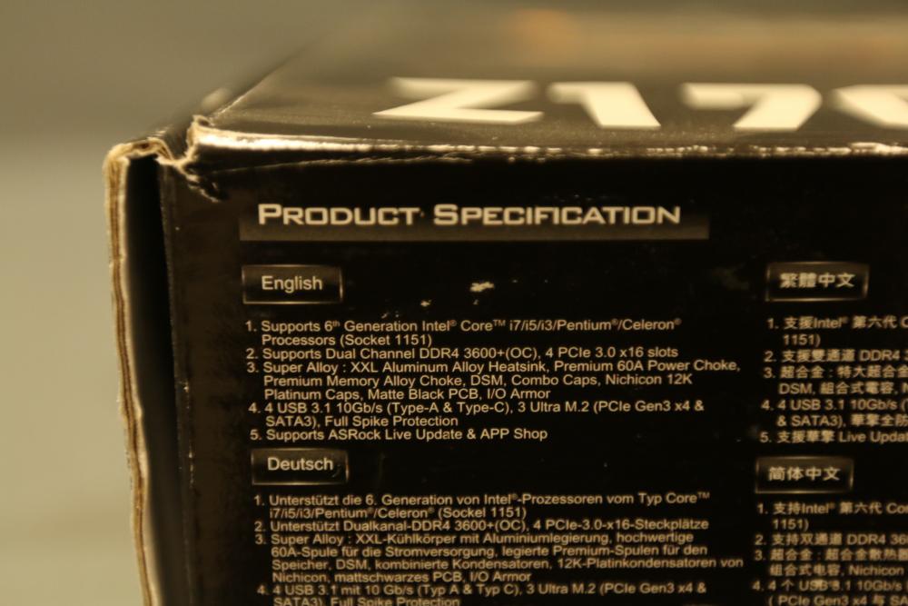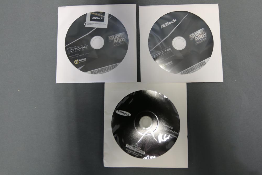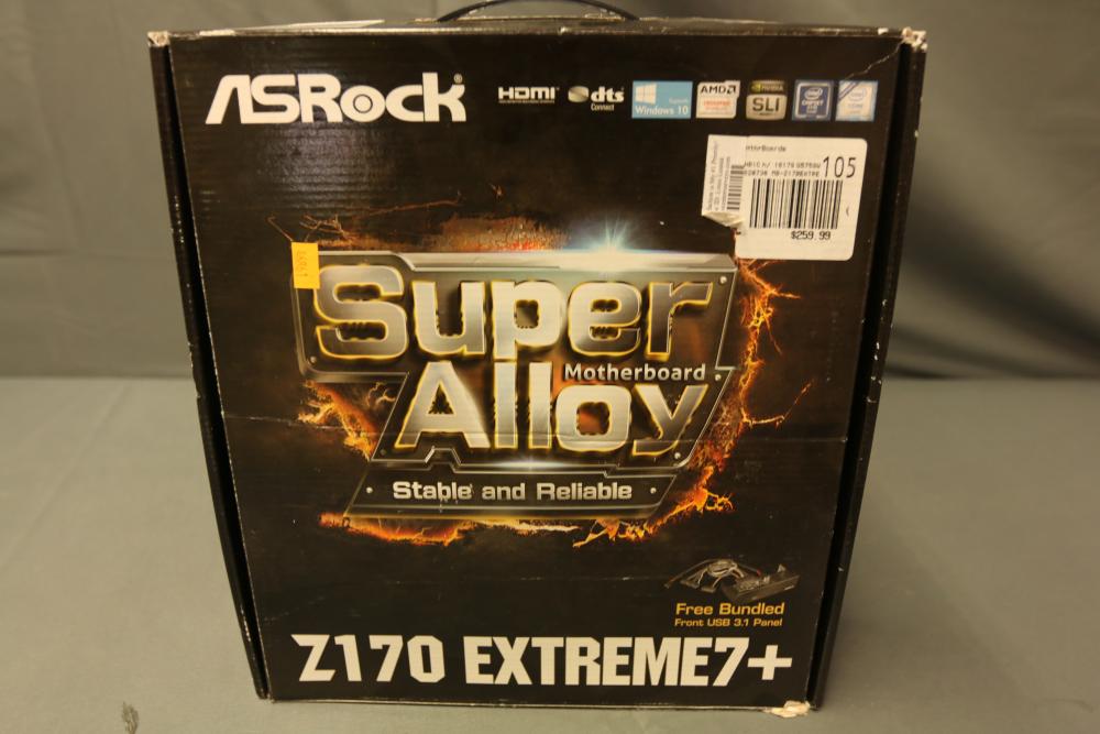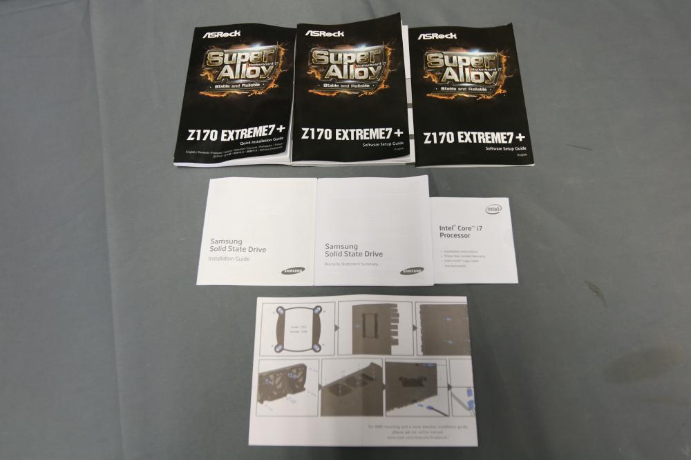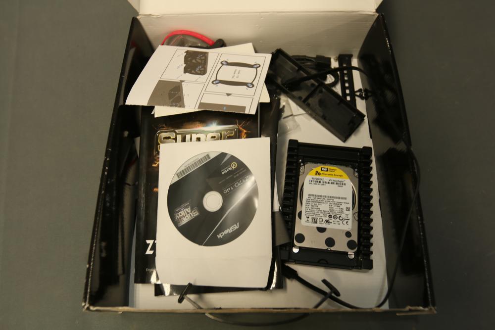 ASRock Z170 Extreme7+ motherboard with manuals, driver discs, mounting accessories, SATA cables, and packaging. Includes two 80GB Western Digital VelociRaptor drives in enclosures and additional small parts.