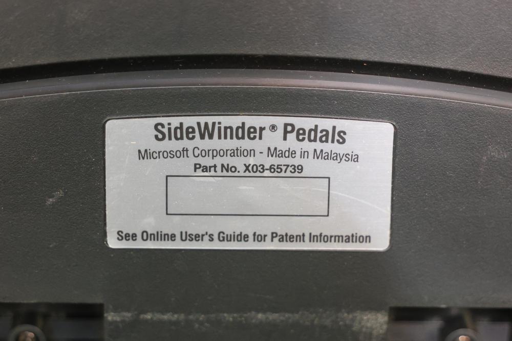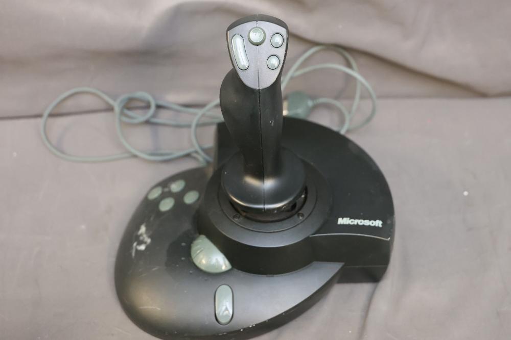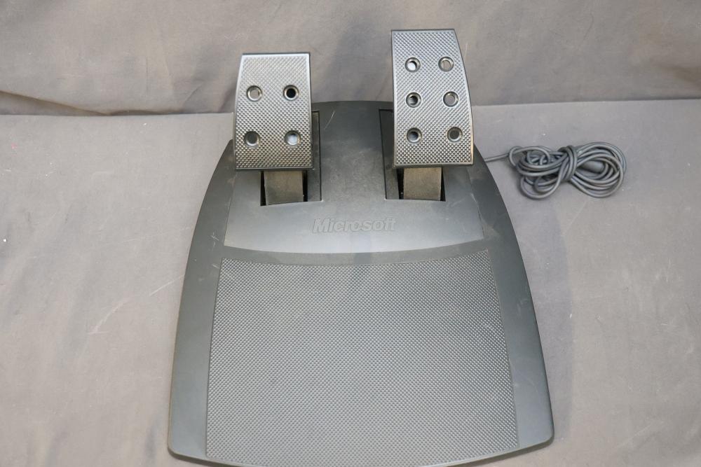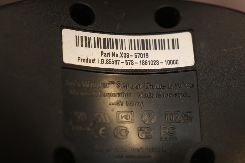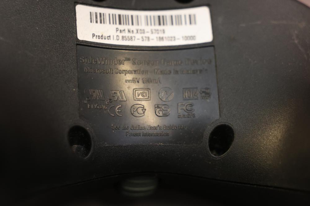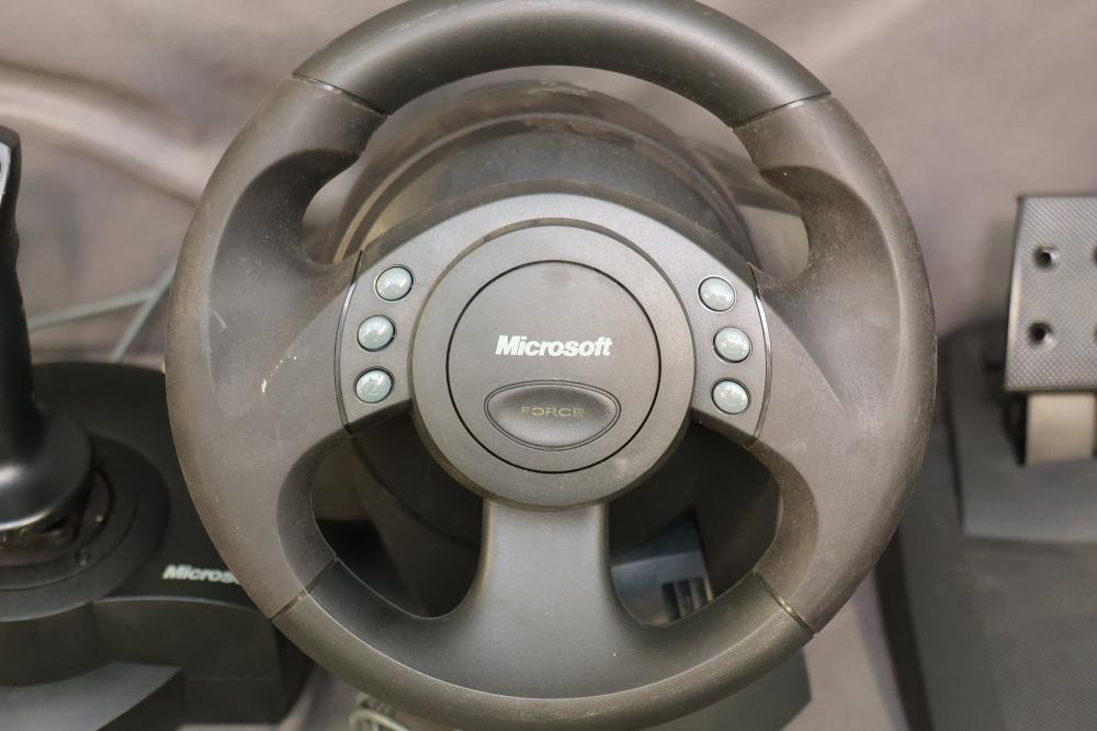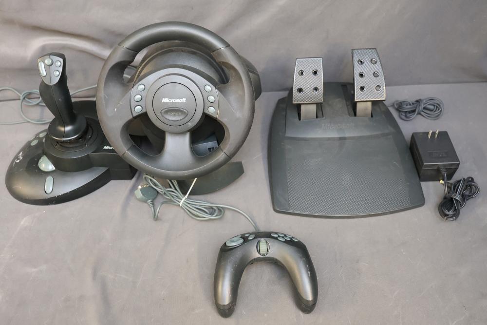Microsoft SideWinder gaming accessories including a Force Feedback Wheel, pedals, joystick, and controller. Items are powered by a compatible adapter (model LA-1203C included). Components show visible wear from prior use. Items are untested. Pickup only.
