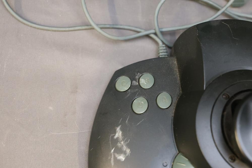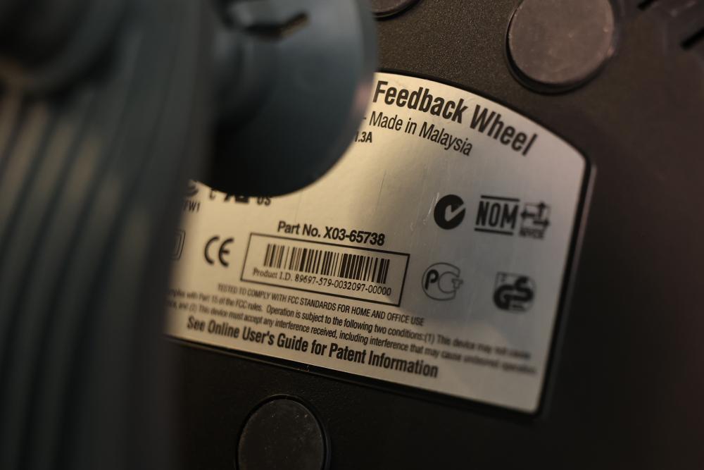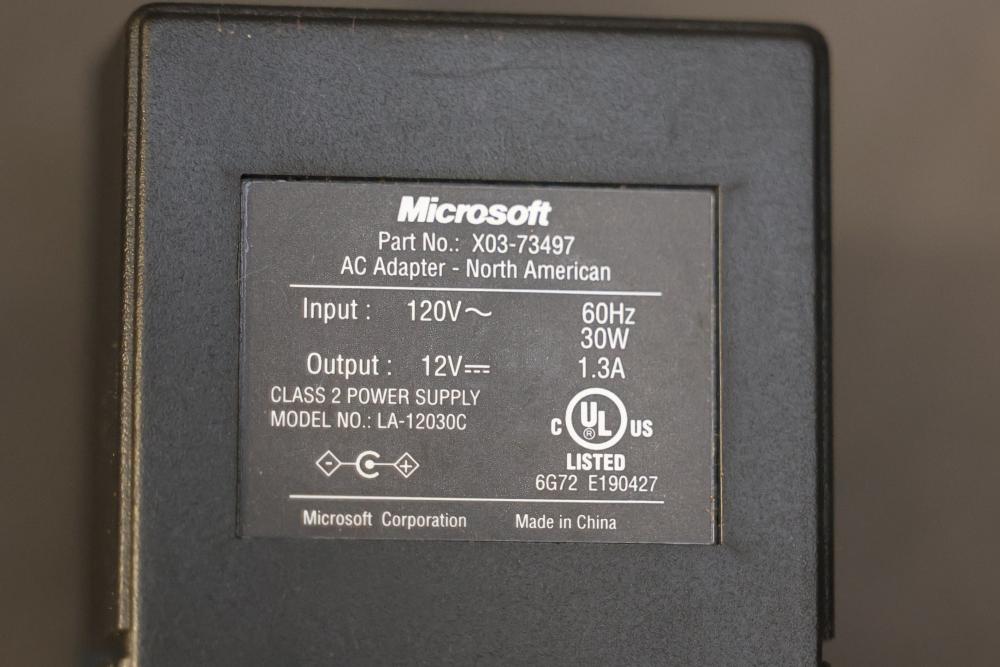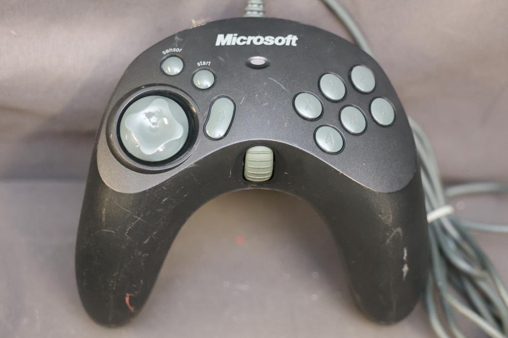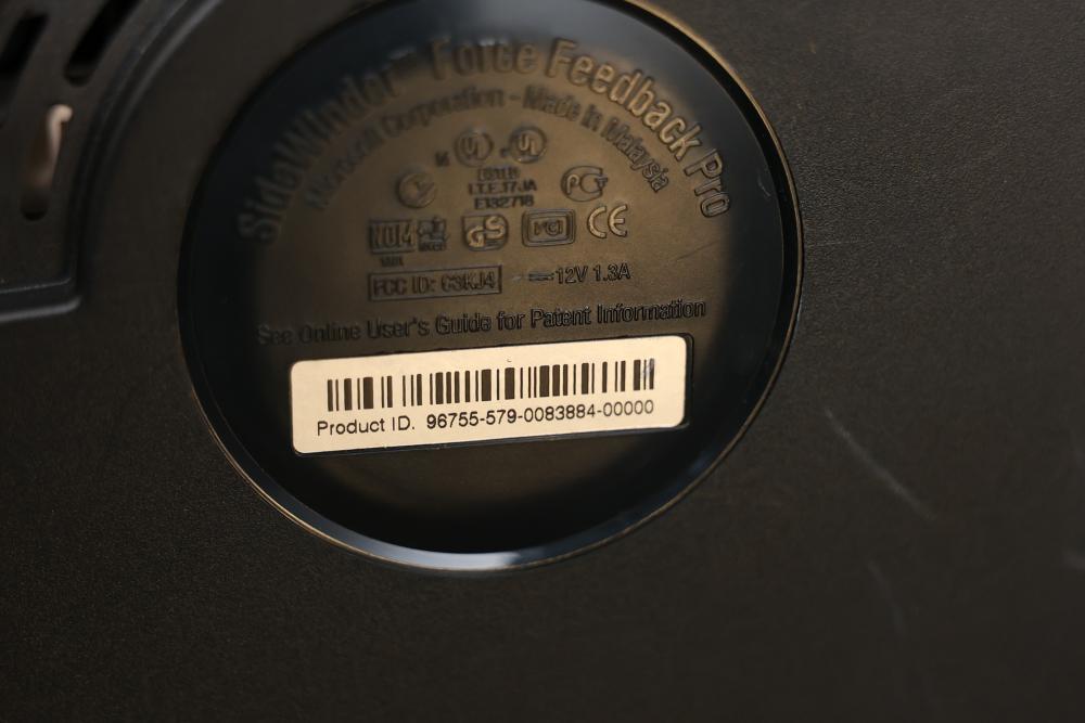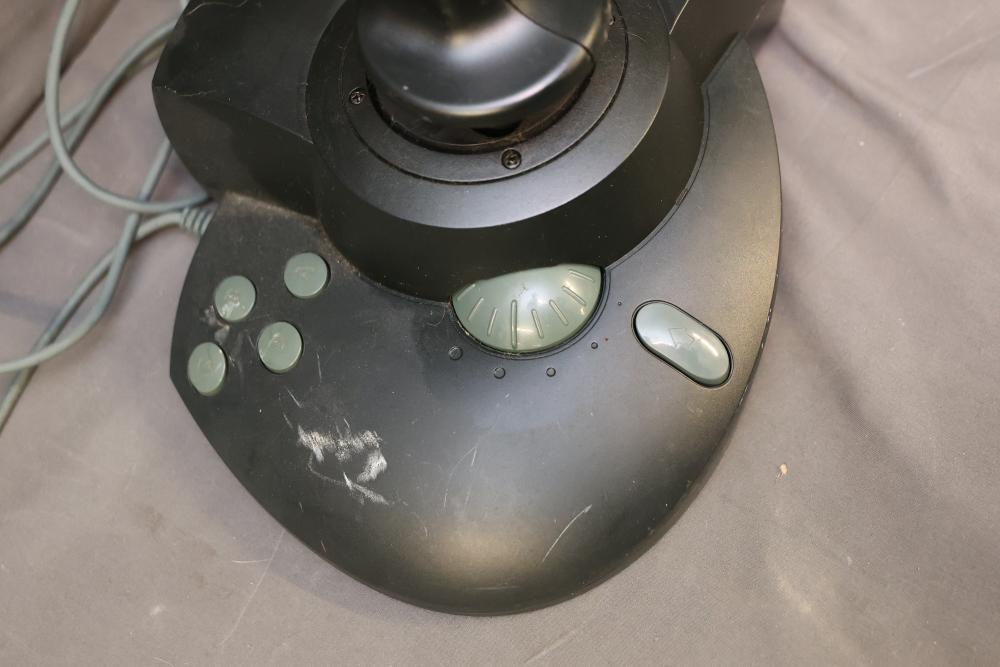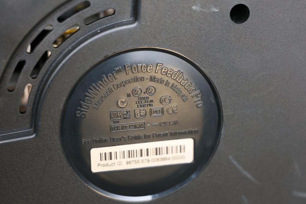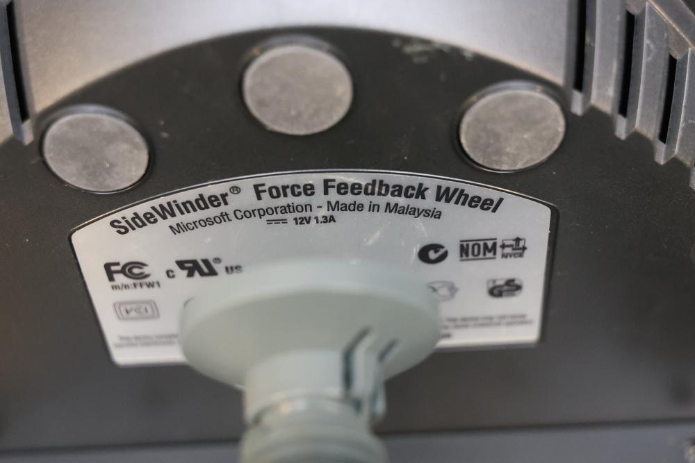 Microsoft SideWinder gaming accessories including a Force Feedback Wheel, pedals, joystick, and controller. Items are powered by a compatible adapter (model LA-1203C included). Components show visible wear from prior use. Items are untested. Pickup only.