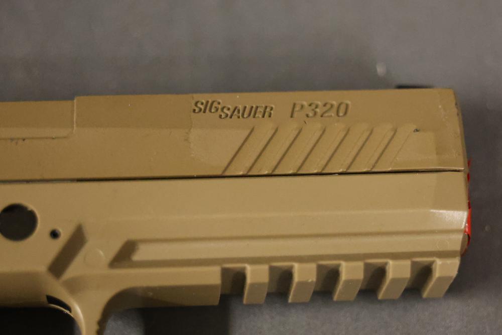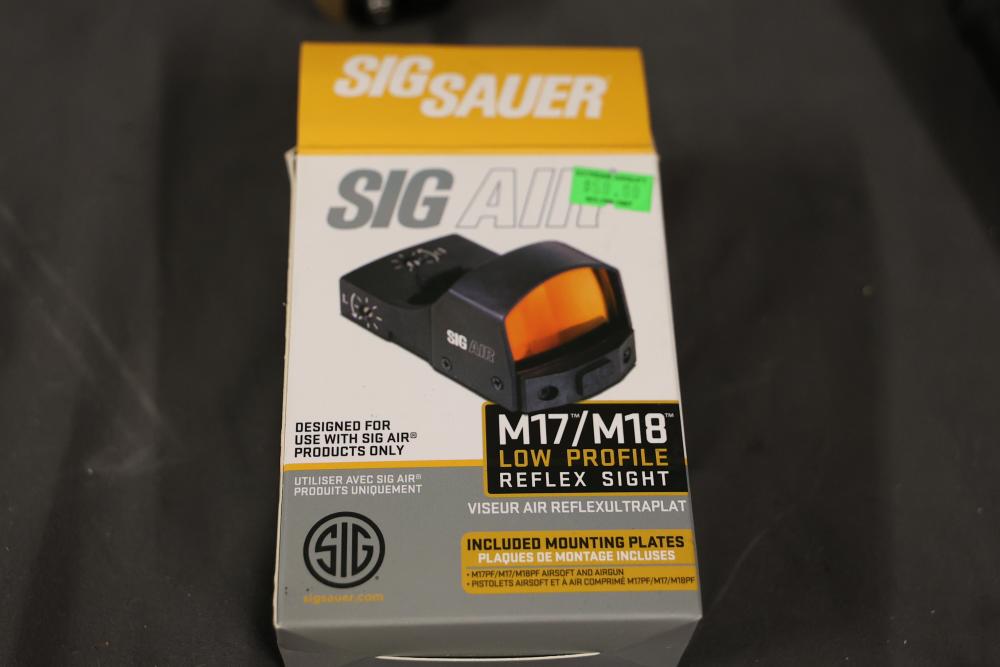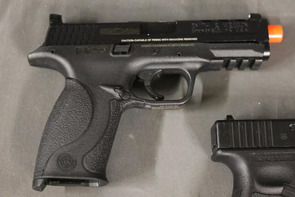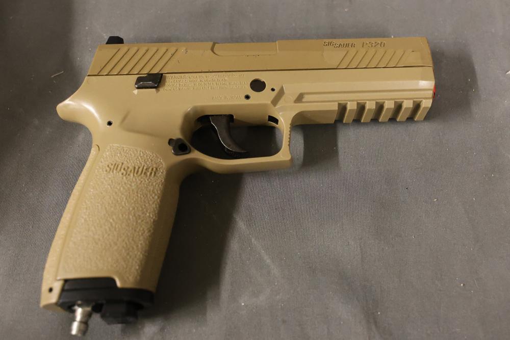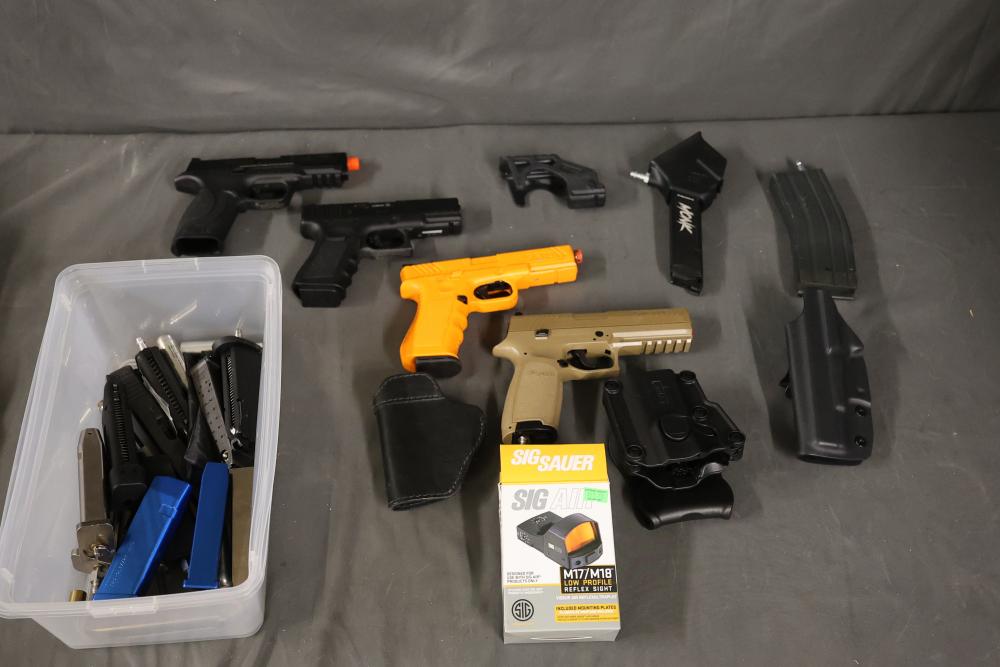 Various airsoft pistols, including models resembling Smith & Wesson, Glock, and Sig Sauer P320, along with accessories such as holsters, a Sig Sauer M17/M18 reflex sight, magazines, and additional components. Pickup only.