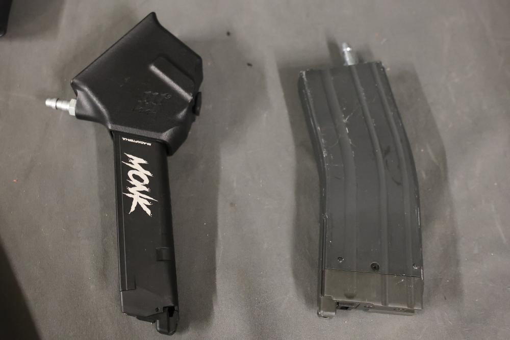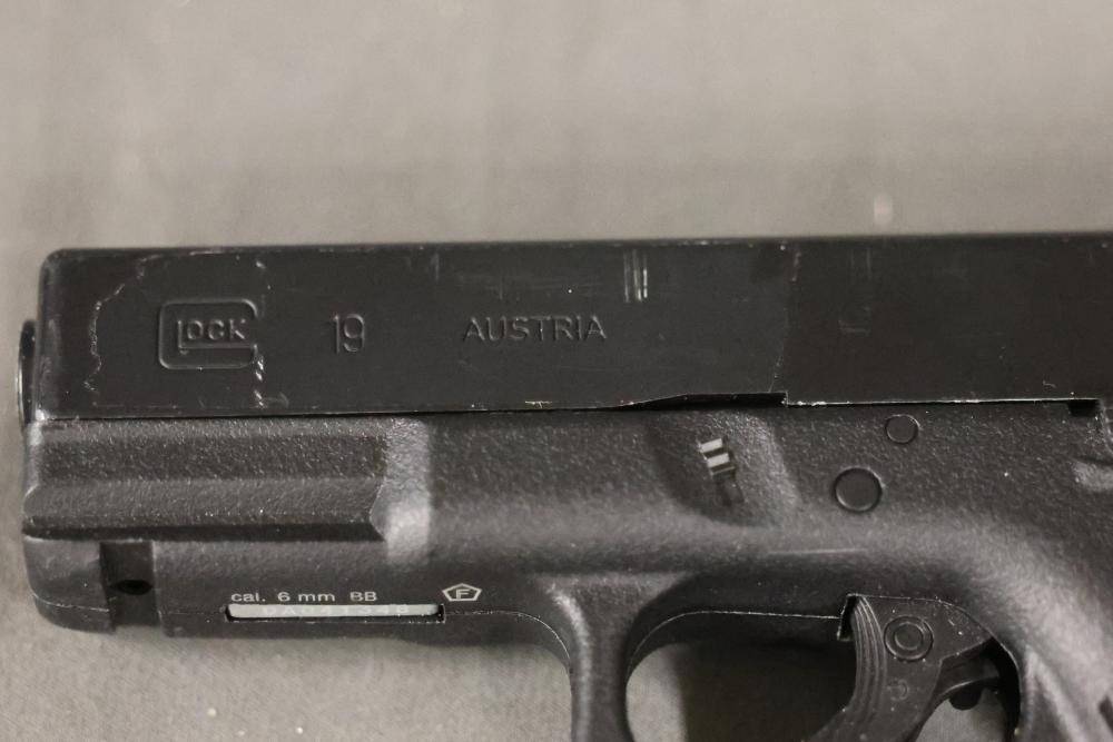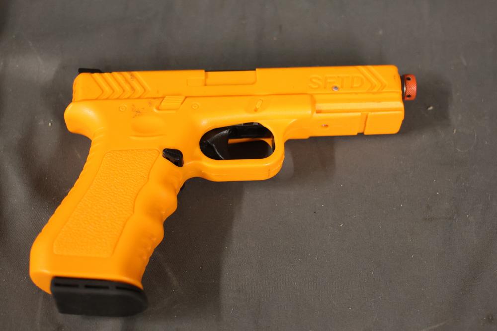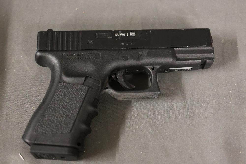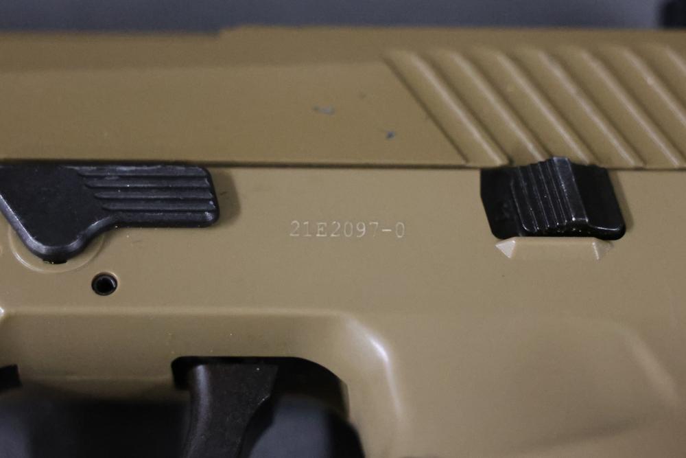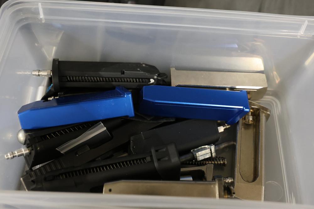 Various airsoft pistols, including models resembling Smith & Wesson, Glock, and Sig Sauer P320, along with accessories such as holsters, a Sig Sauer M17/M18 reflex sight, magazines, and additional components. Pickup only.