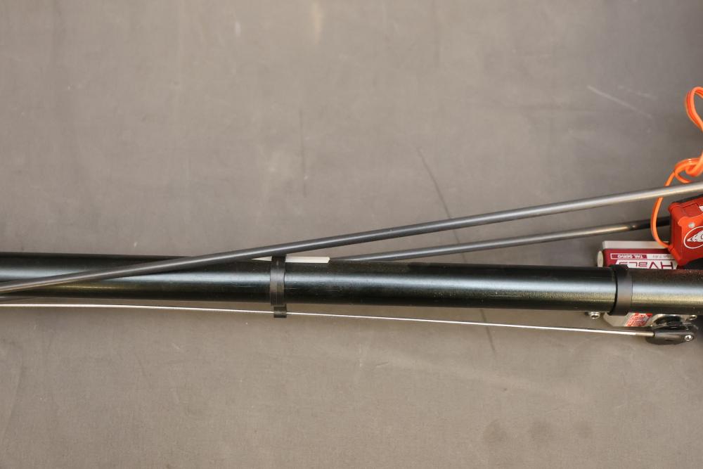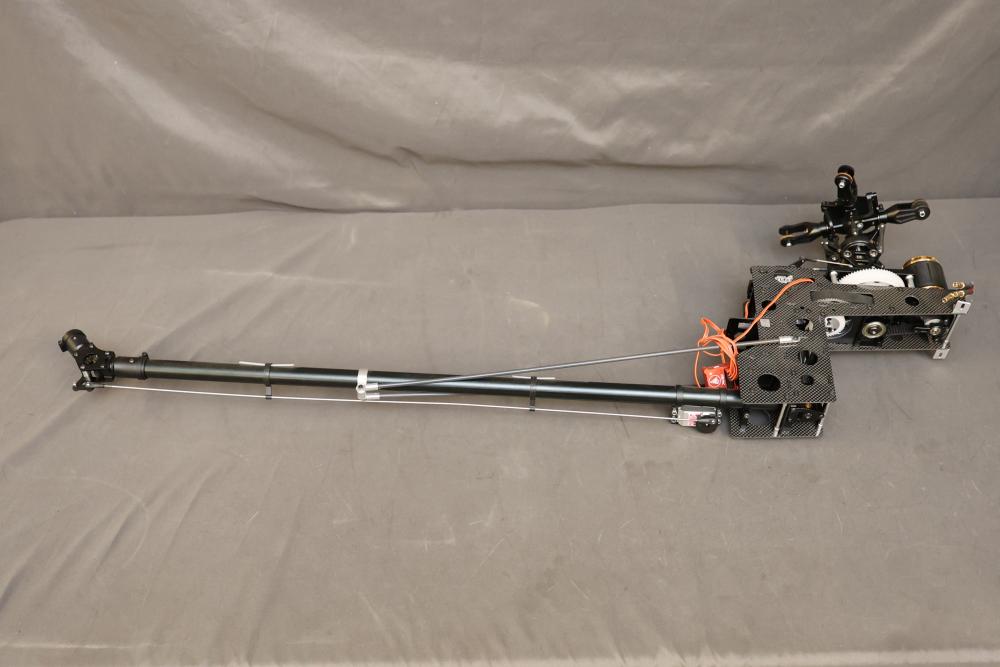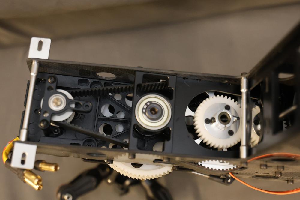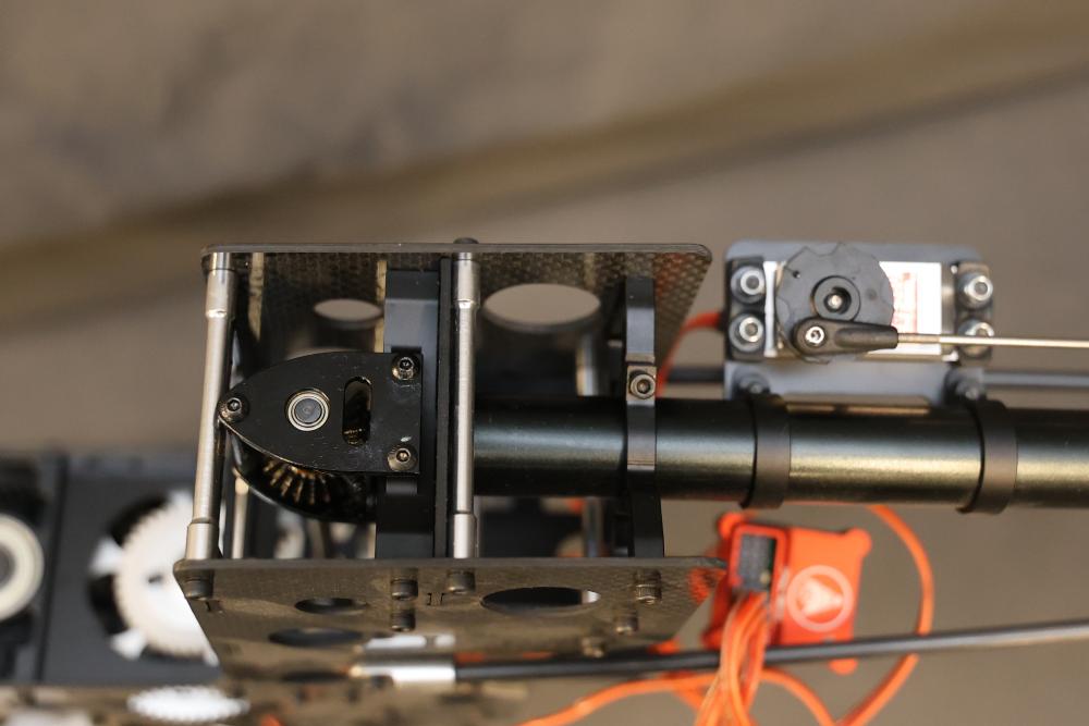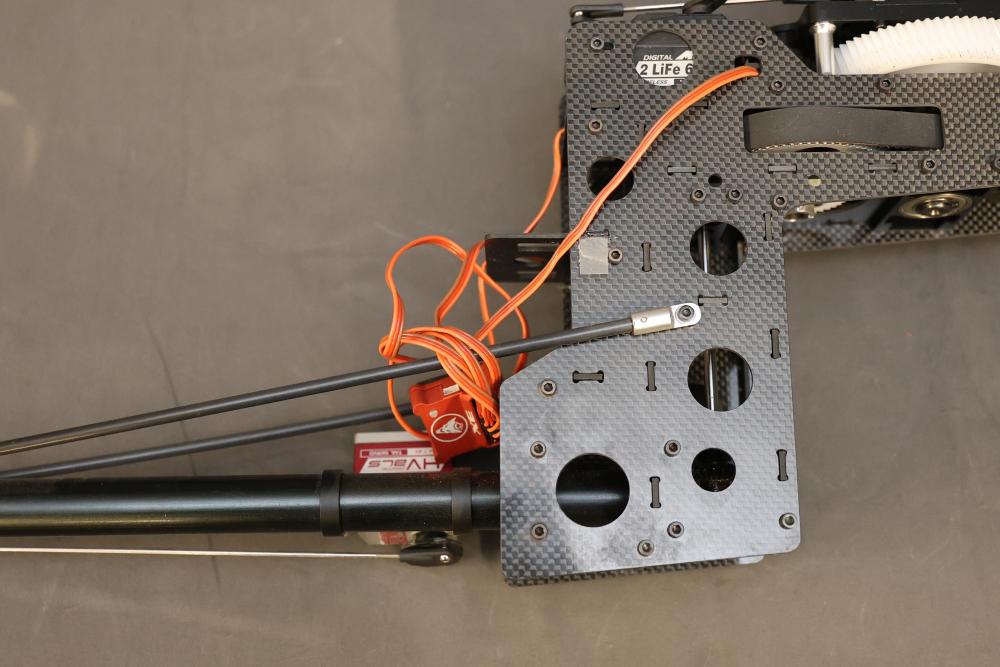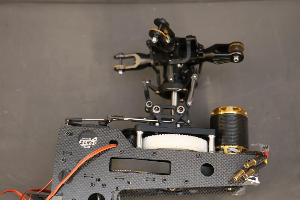 Radio Controlled (RC) helicopter assembly featuring a carbon fiber frame, tail boom, and various internal components. Includes servos, gears, and wiring, as shown. Components are fully assembled on the frame. Pickup only.