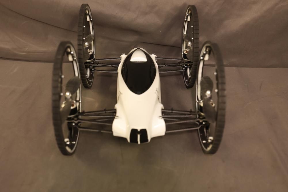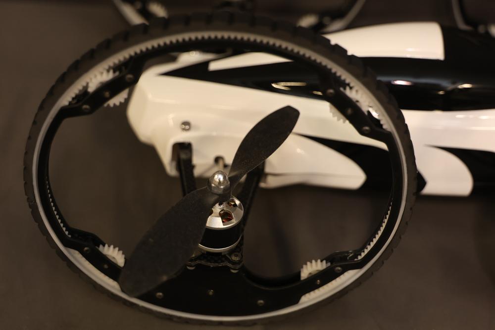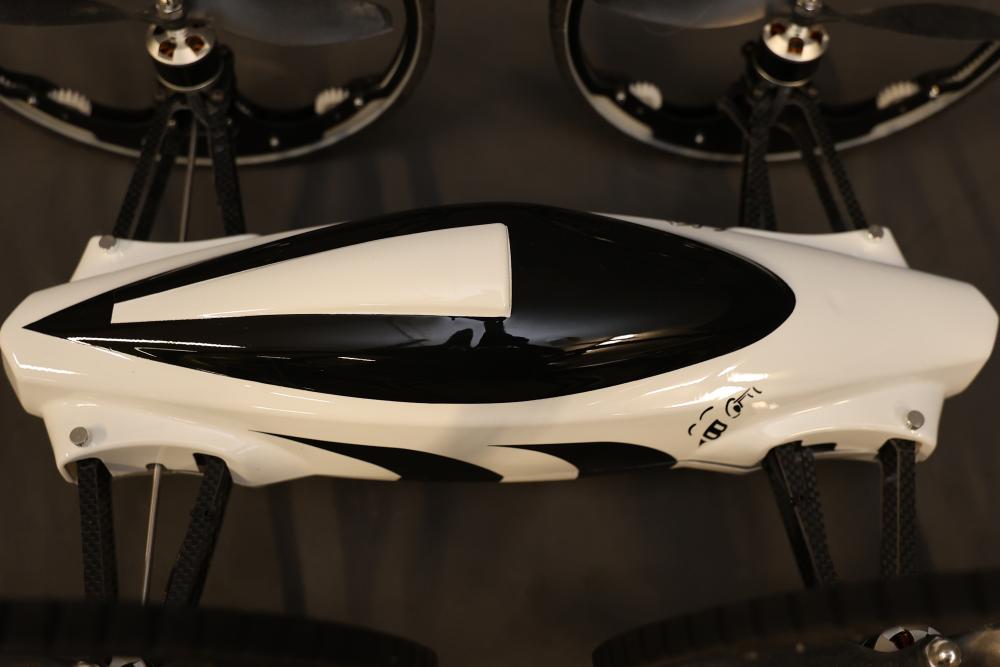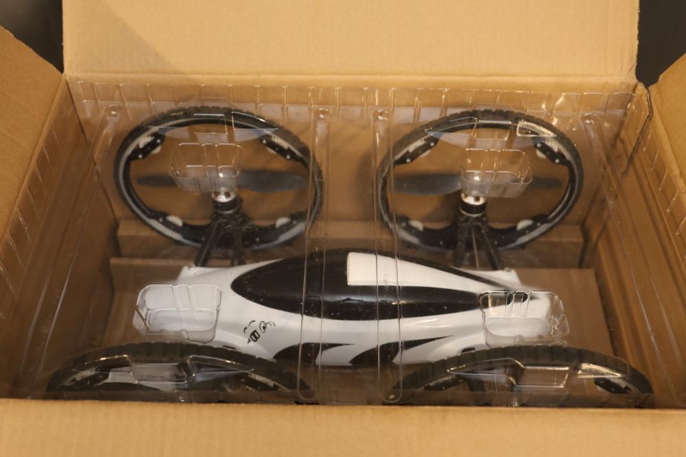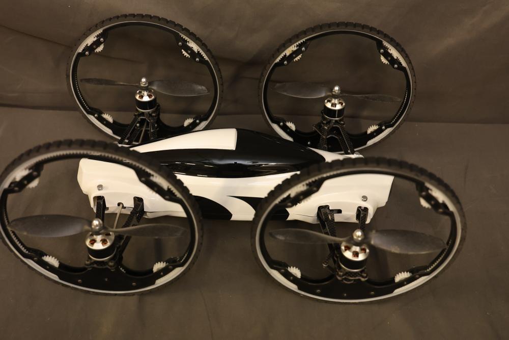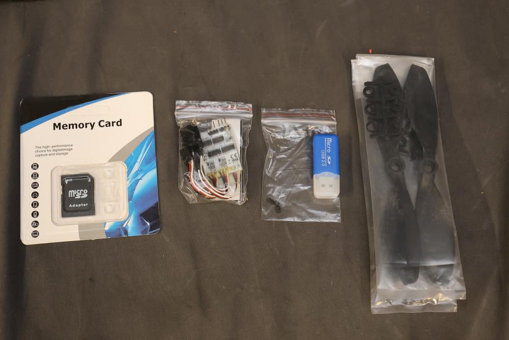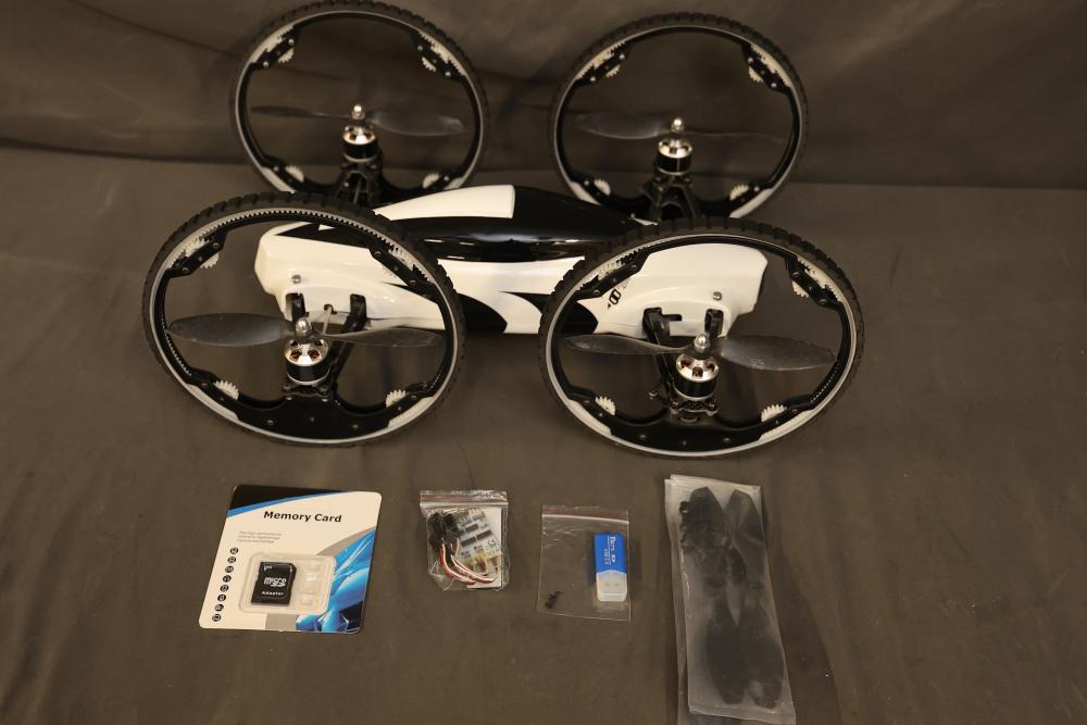 Remote-controlled quadcopter featuring a black-and-white design and four propeller units enclosed by protective rims. Includes additional accessories: memory card, spare propellers, USB drive, and cables. Appears to be assembled and housed in original packaging. Pickup only.