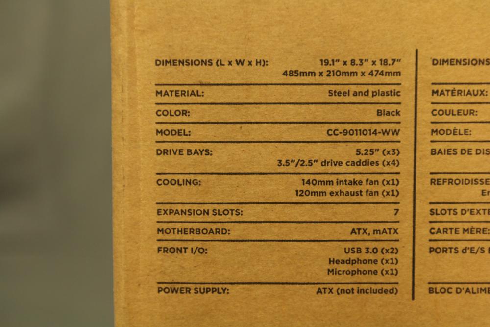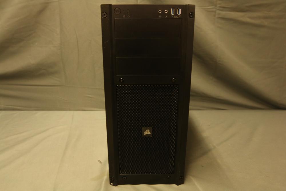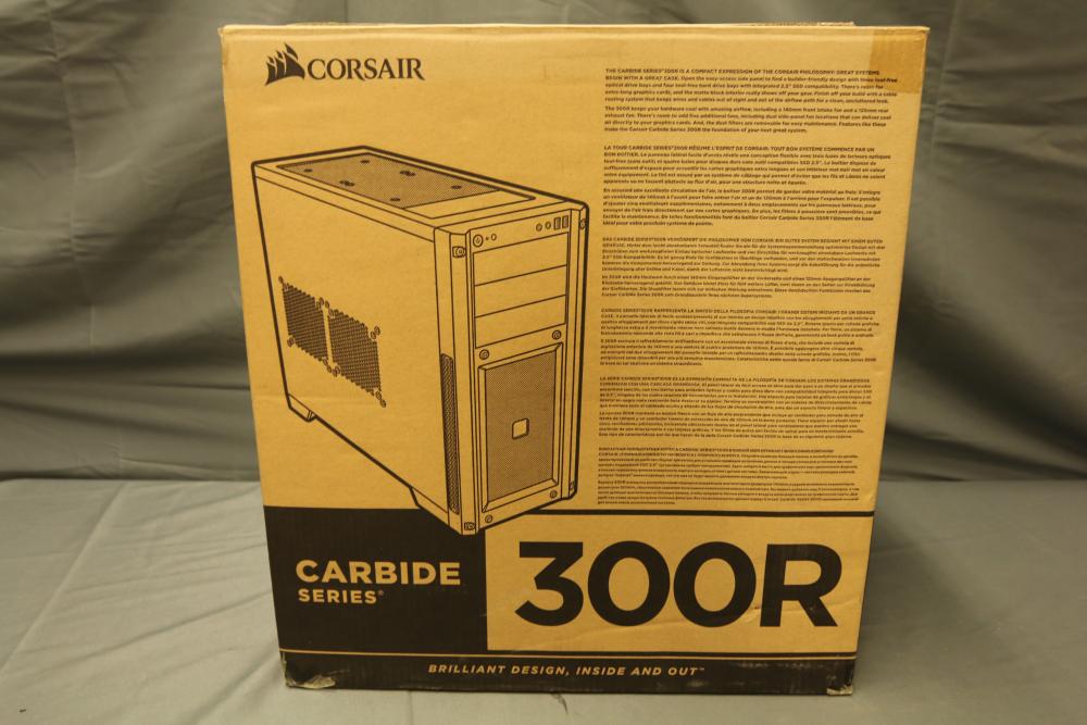 Corsair Carbide Series 300R computer case made of steel and plastic in black finish. Features dimensions of 19.1 x 8.3 x 18.7 inches and includes 3.5"/2.5" drive caddies, seven expansion slots, ATX and mATX motherboard compatibility, and front I/O ports for USB 3.0, headphone, and microphone. Cooling options include a 140mm intake fan and a 120mm exhaust fan. Pickup only.