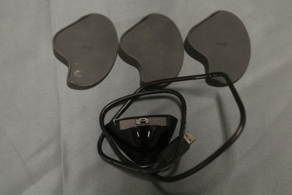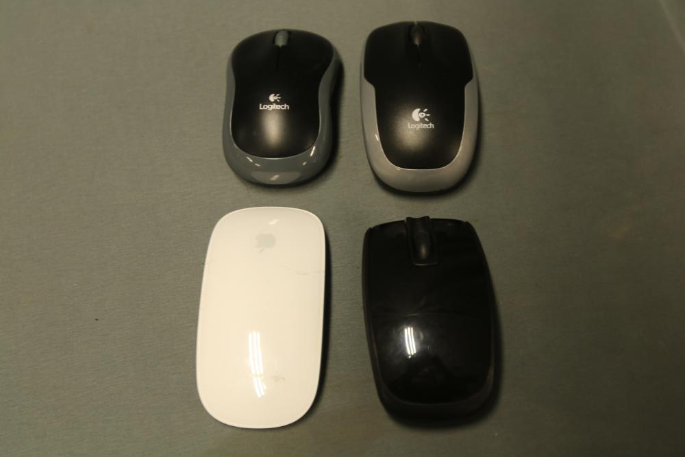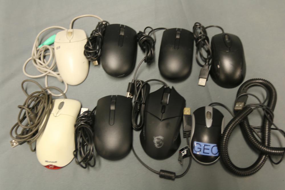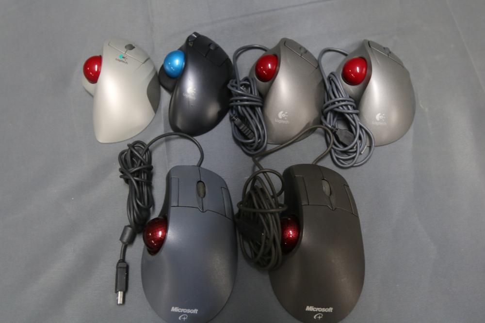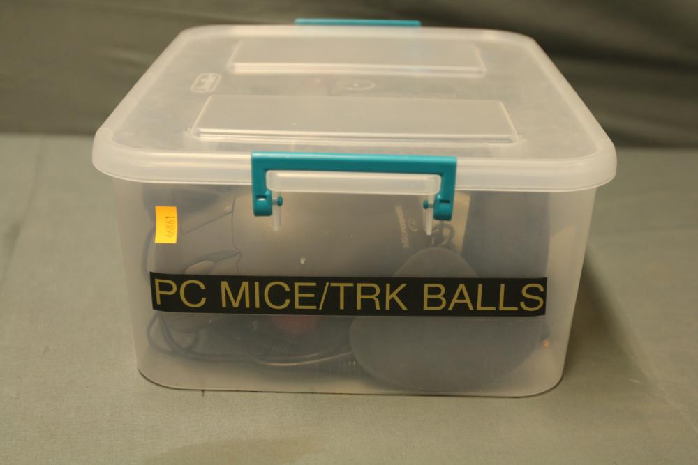 A collection includes several wired and wireless computer mice and trackball devices, along with a labeled plastic storage container. The lot features brands such as Logitech, Microsoft, and other makes. Includes various styles, cables, and components.
