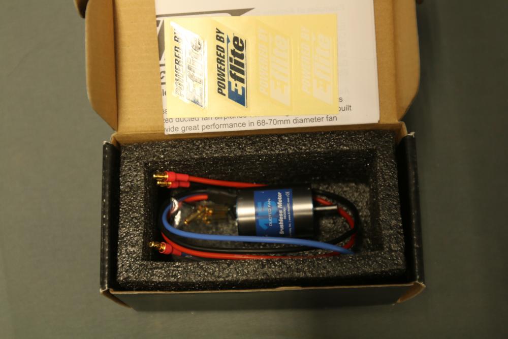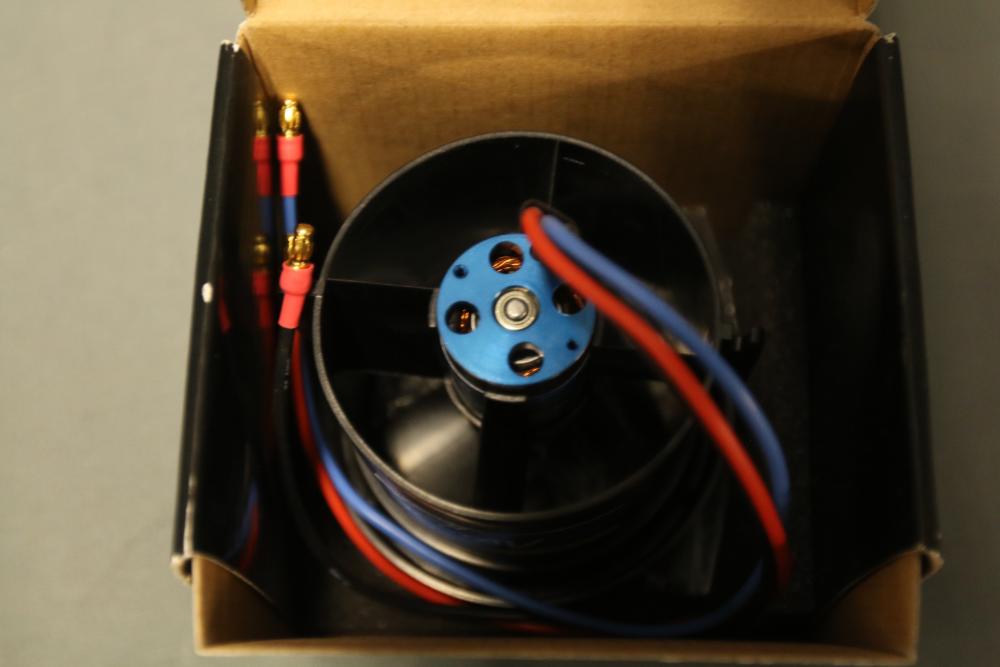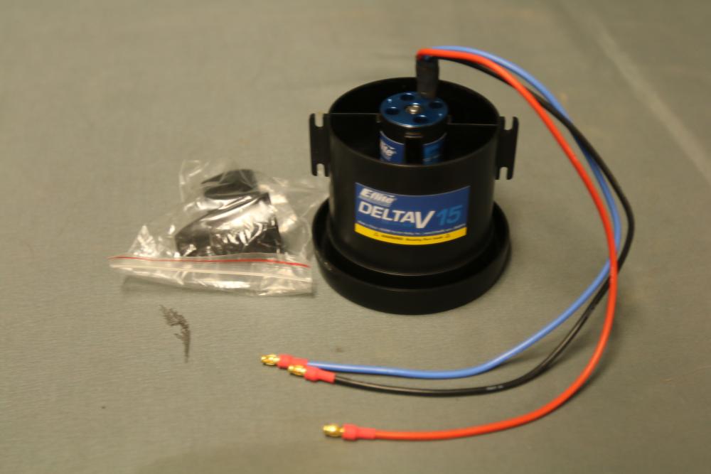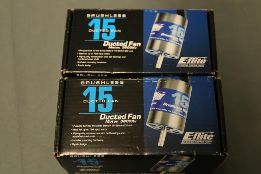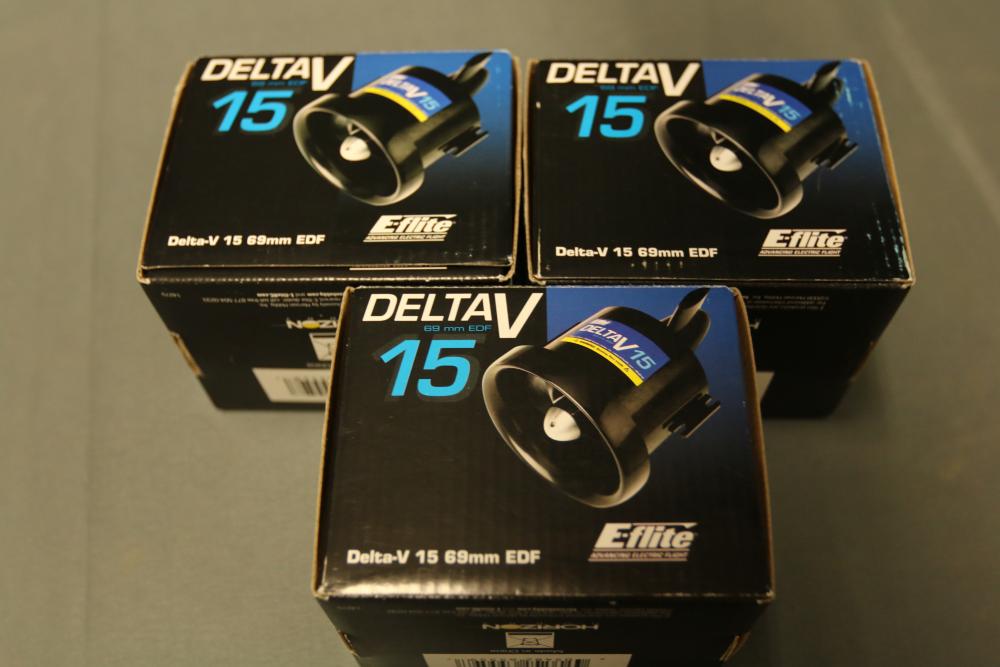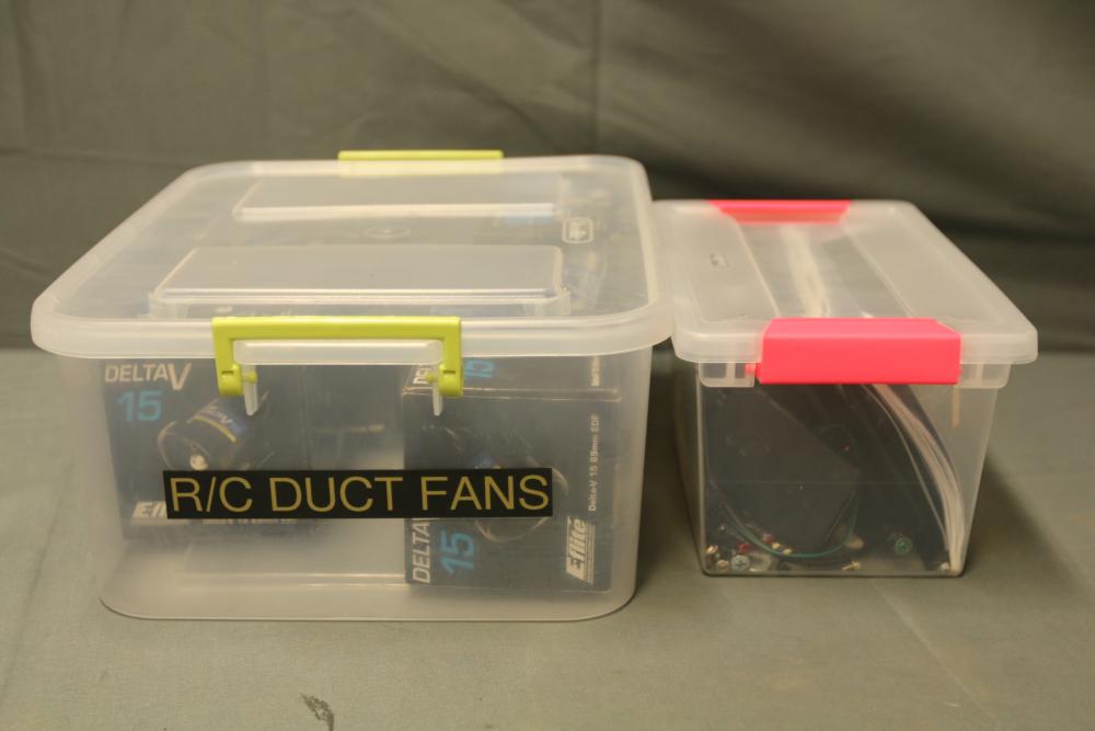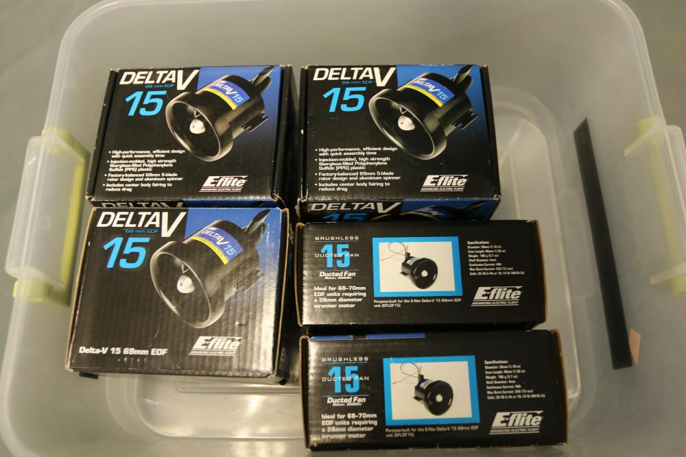 Multiple DeltaV 15 ducted fan units with brushless motors, additional fan components, wires, and various small hardware pieces. Items come organized in labeled plastic storage containers. Pickup only.