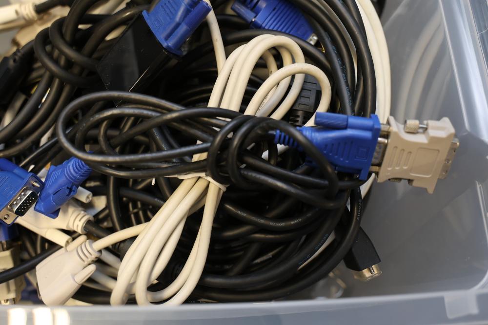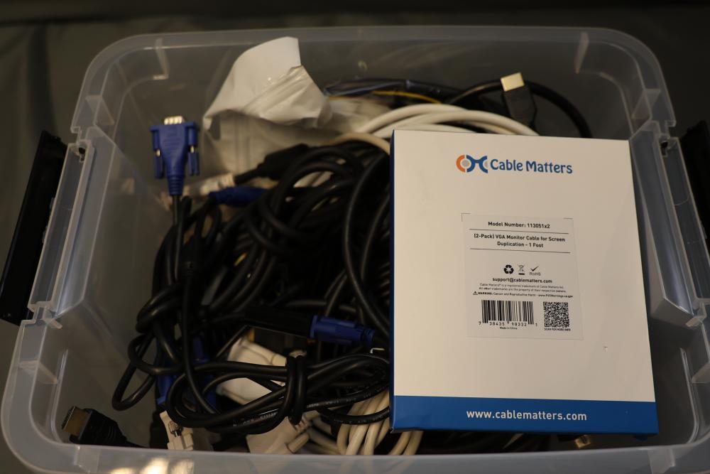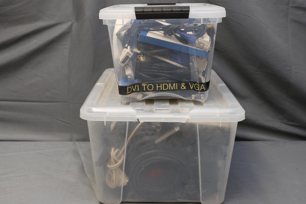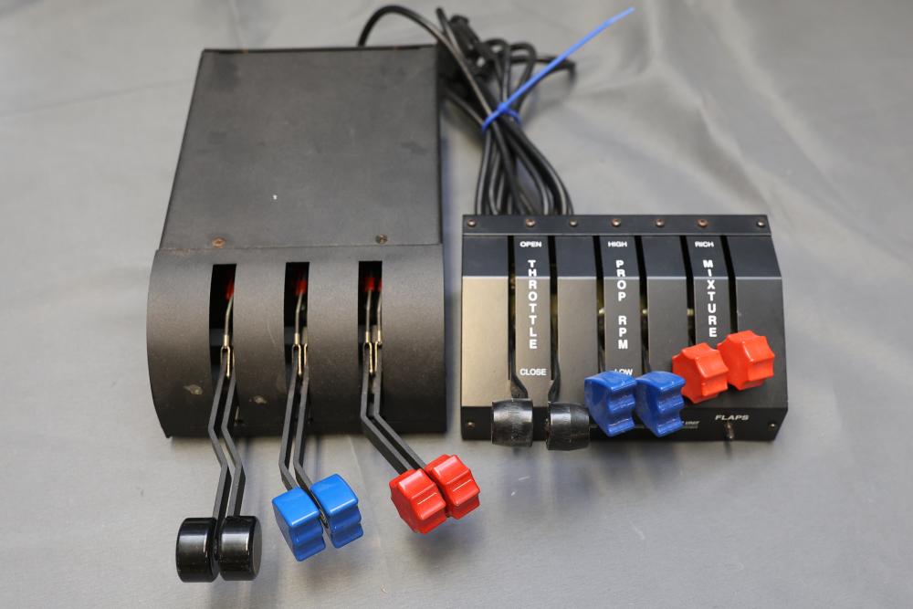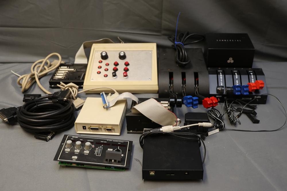 Includes a selection of AV cables (DVI, HDMI, VGA, etc.), simulation control devices, and related electronic components. Items include throttle controls, panel controllers, and interface boxes alongside various cables. Pickup only.