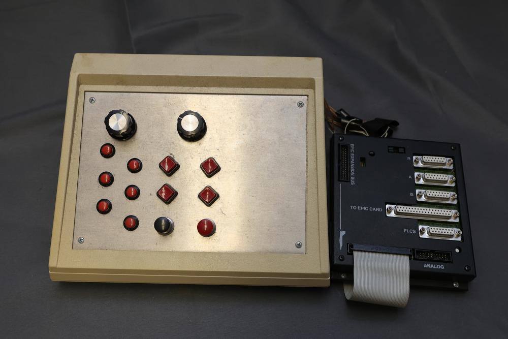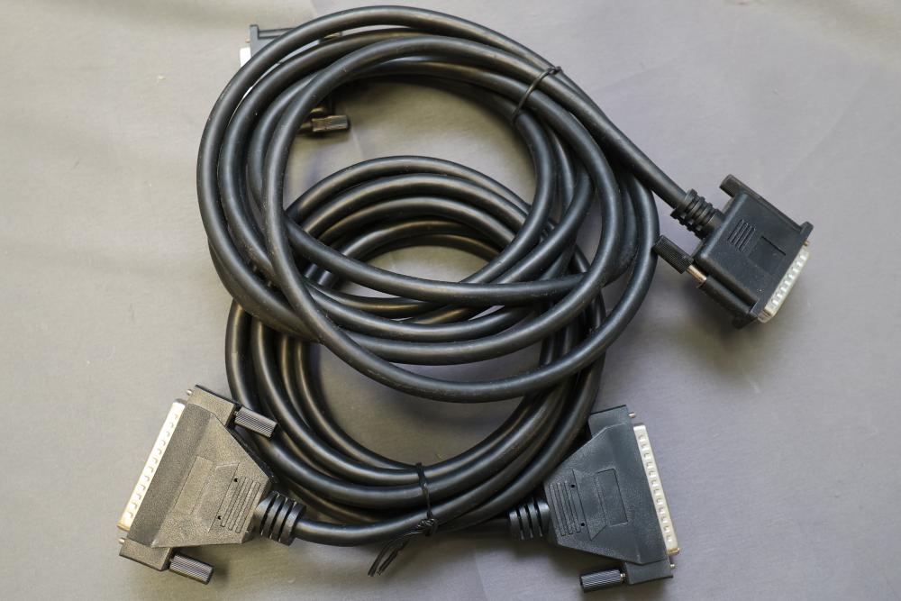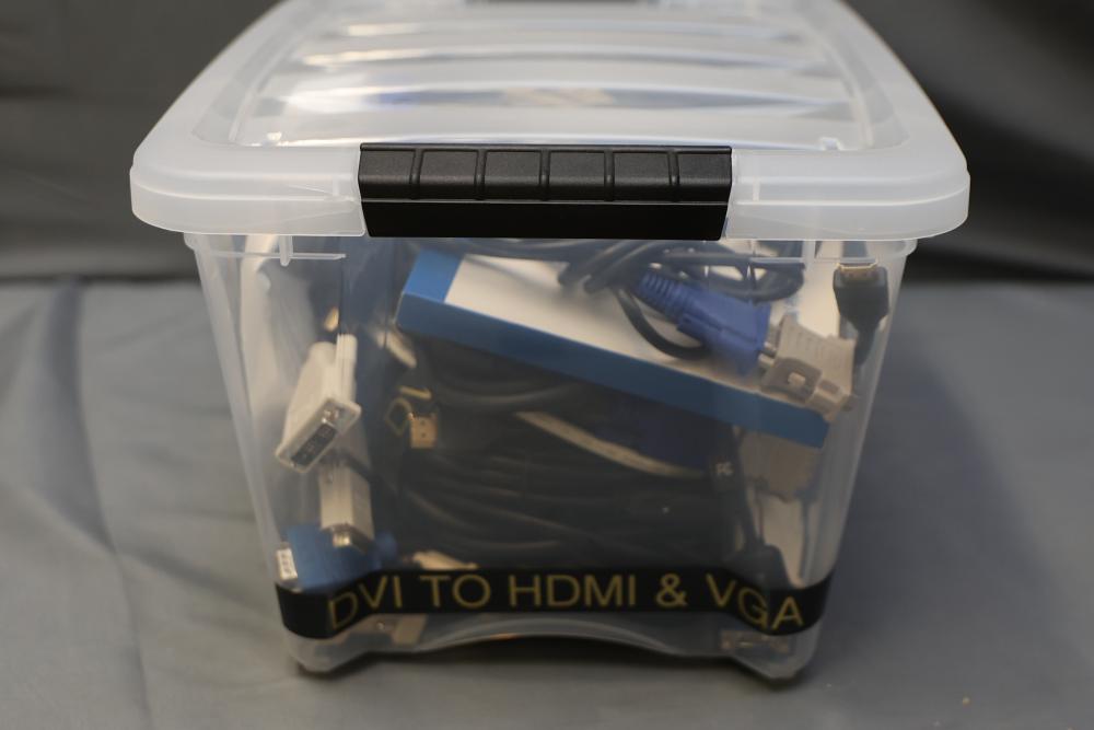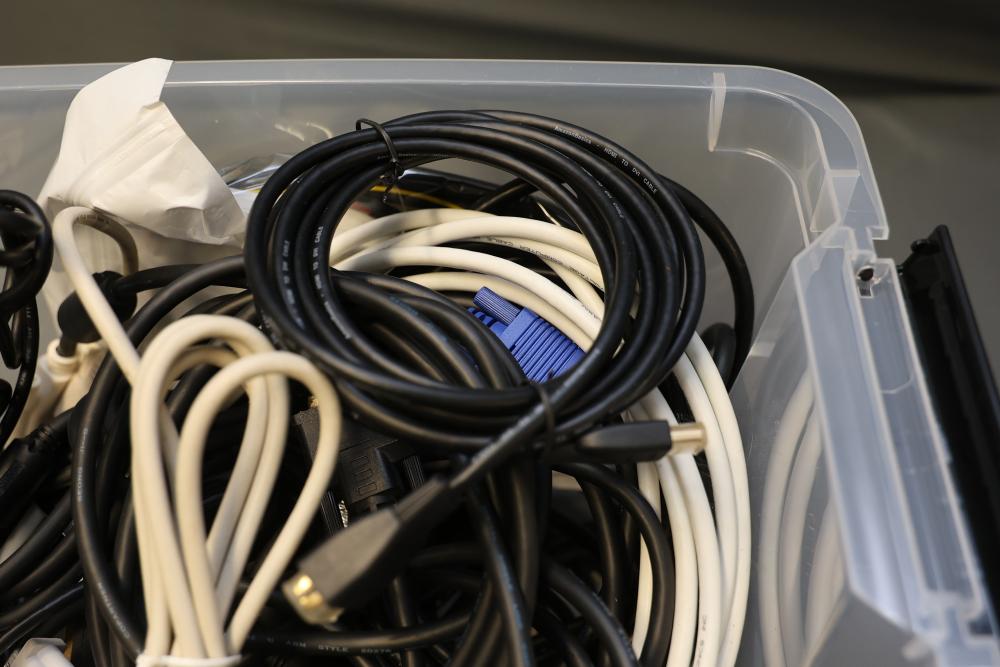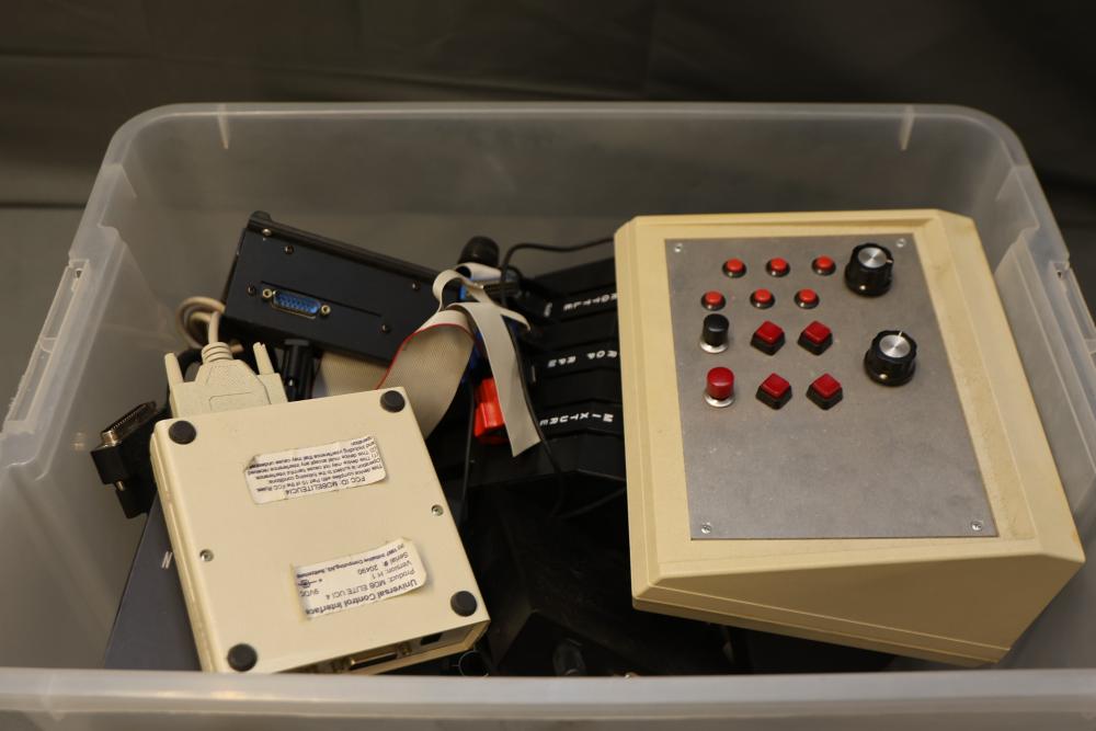Includes a selection of AV cables (DVI, HDMI, VGA, etc.), simulation control devices, and related electronic components. Items include throttle controls, panel controllers, and interface boxes alongside various cables. Pickup only.