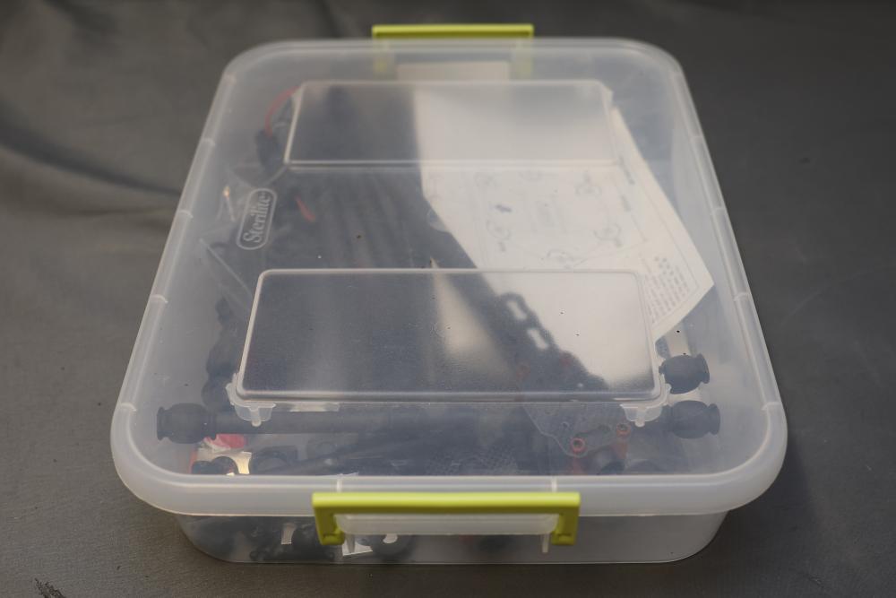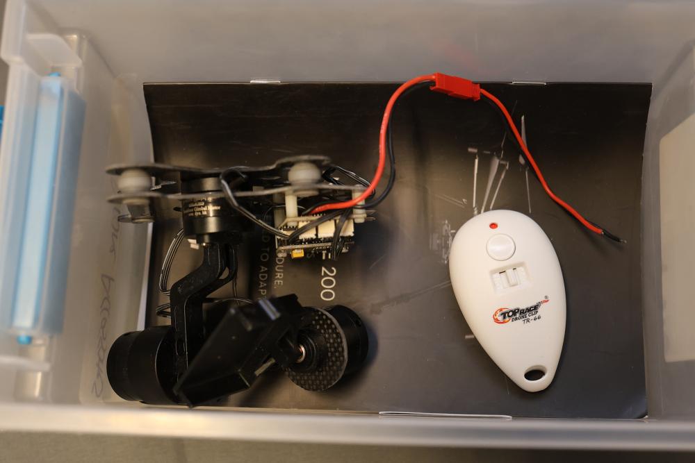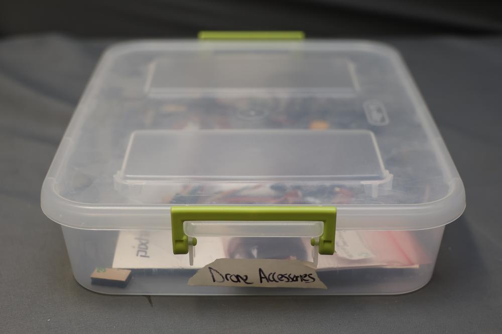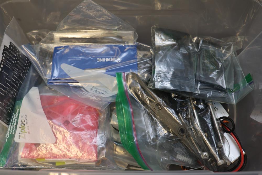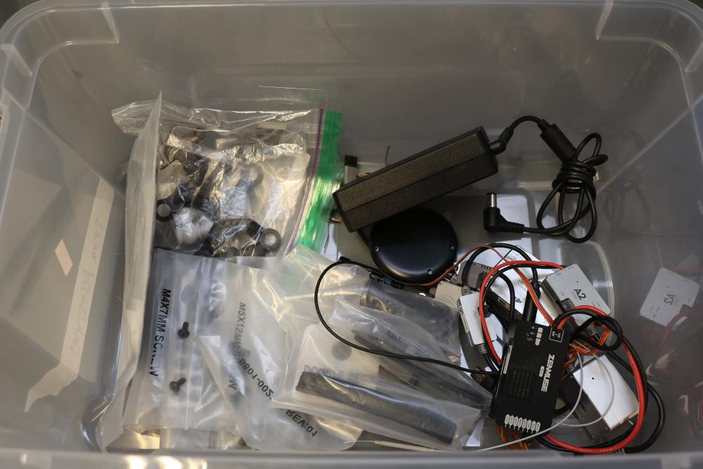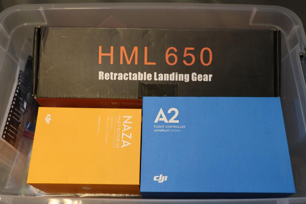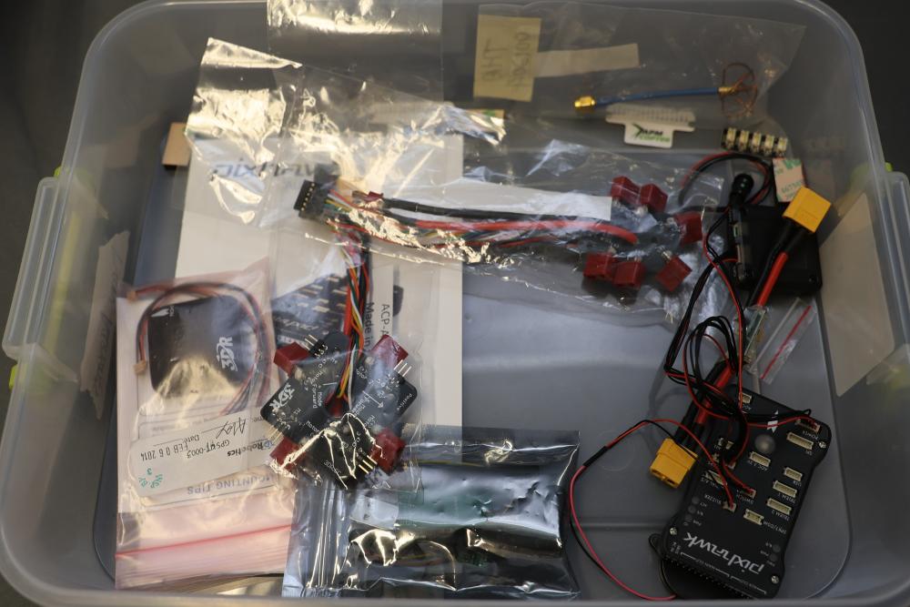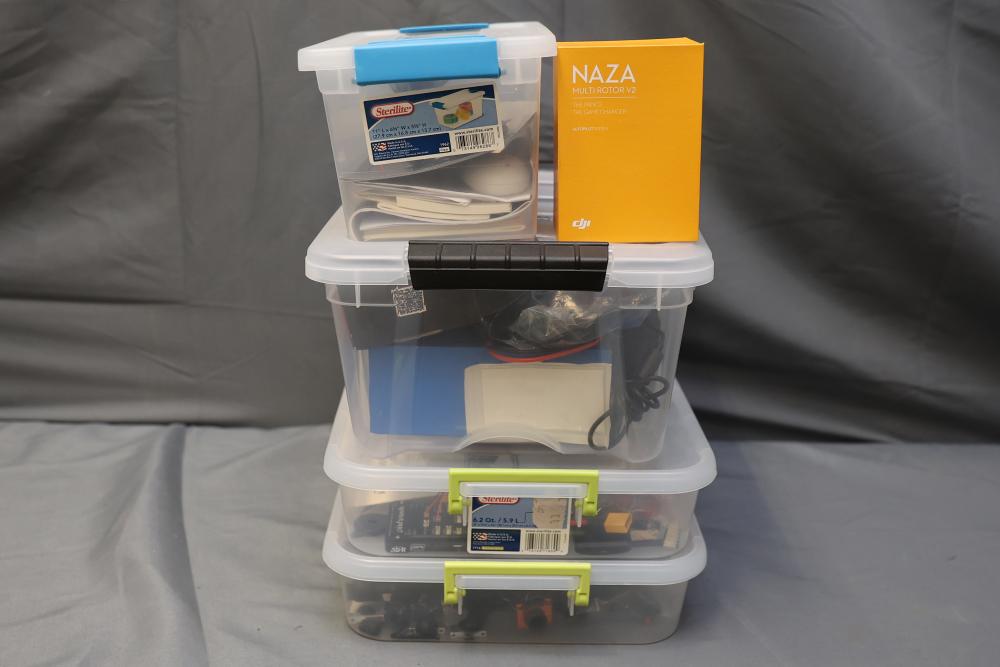 Assorted drone parts, components, and accessories. Items include but are not limited to retractable landing gear, flight controllers, propellers, wiring components, and various hardware. Pickup only.