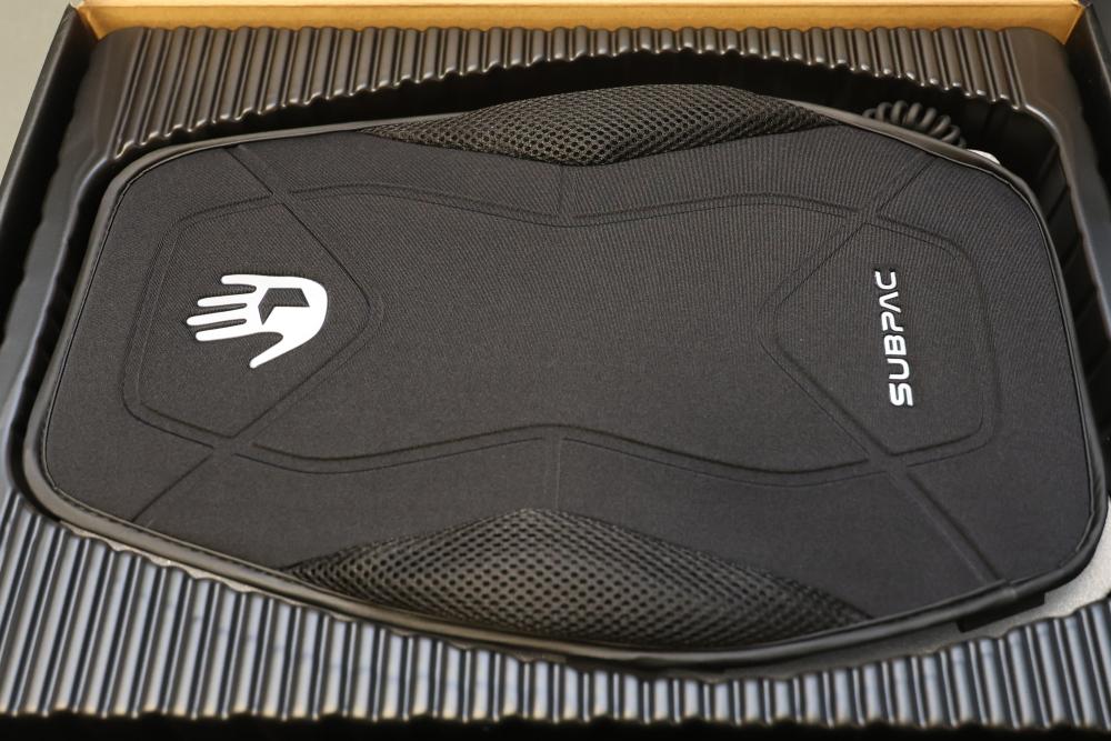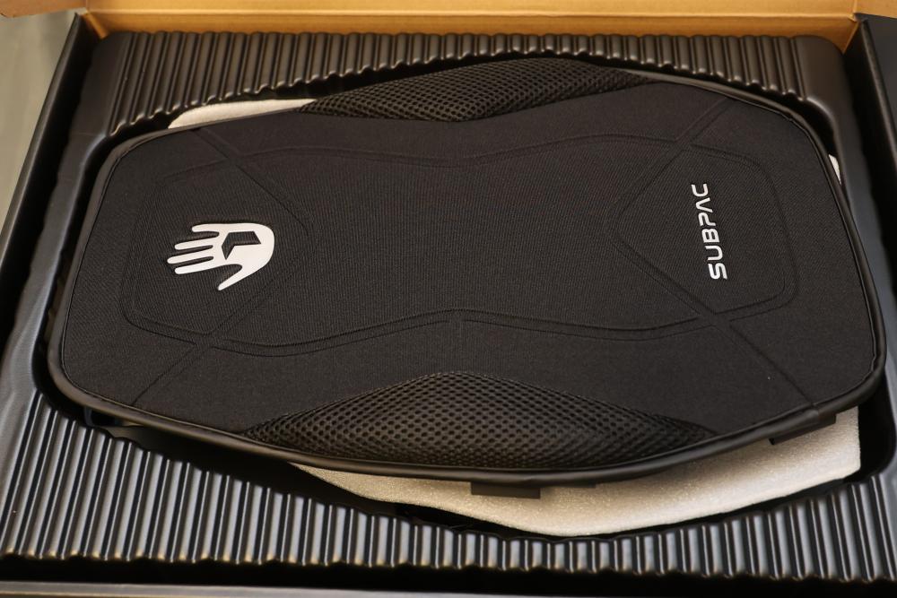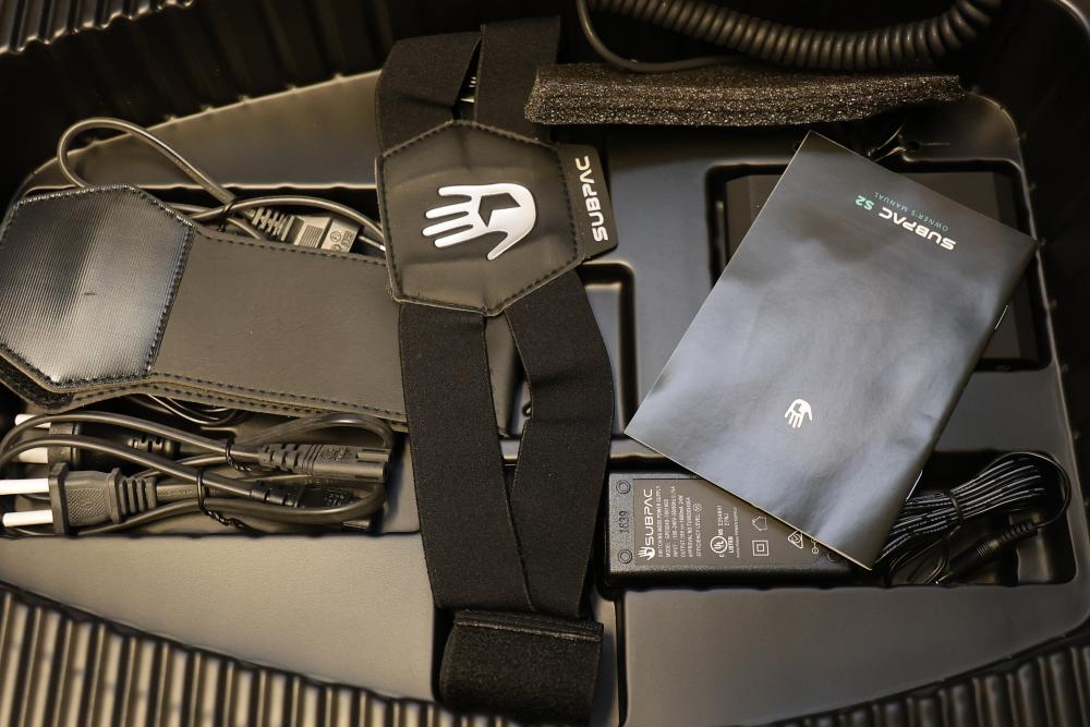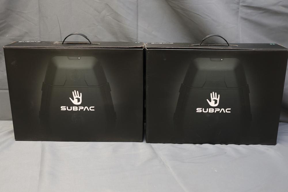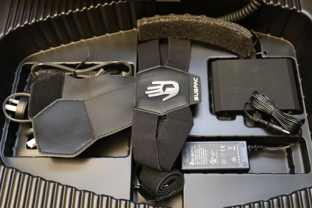 SubPac wearable sound system with accessories. Includes harness, power adapter, cables, and instruction materials. Packaged in original boxes with fitted internal storage. Condition appears unused, all components present and well-maintained. Pickup only.