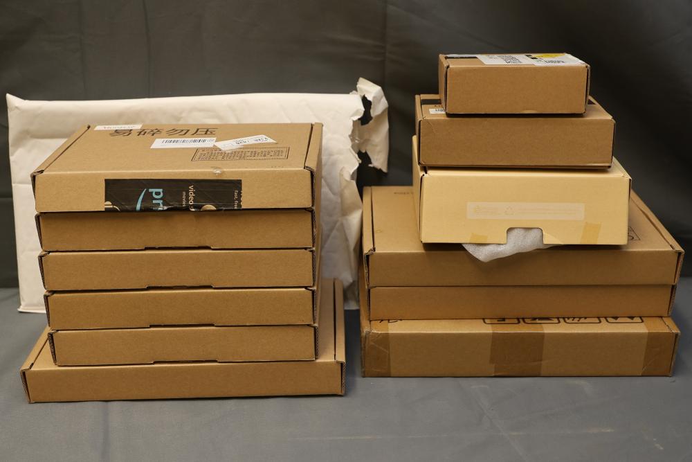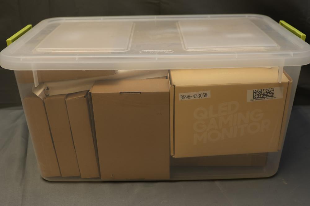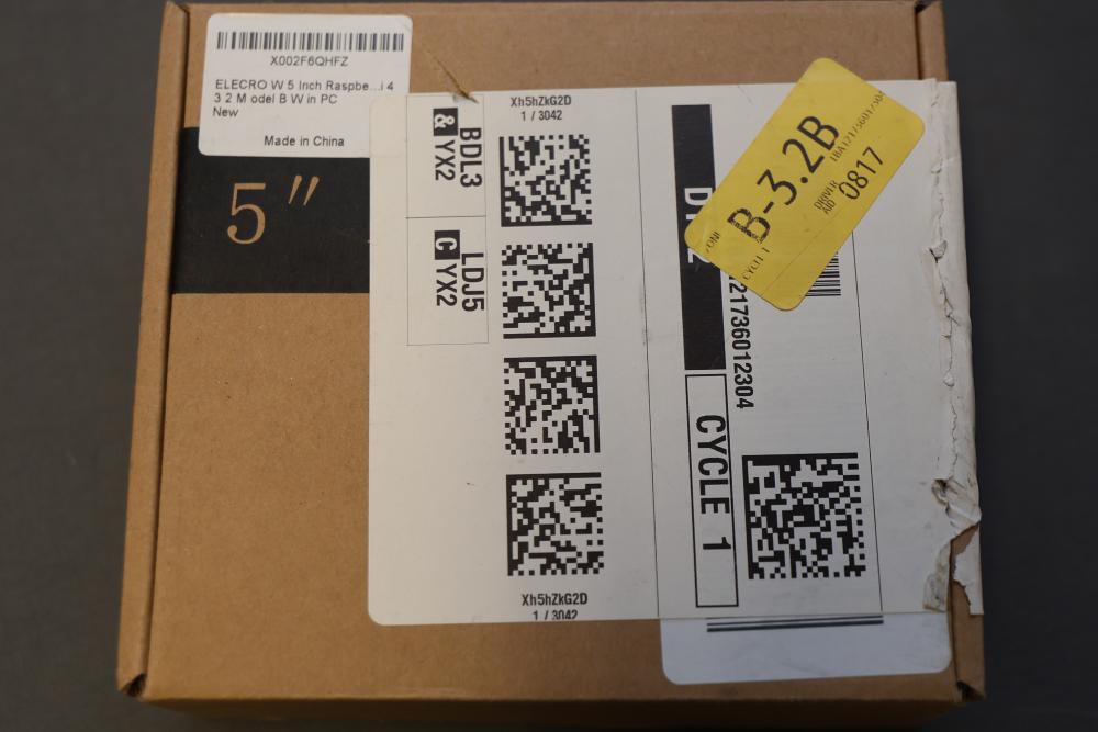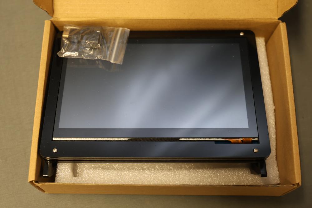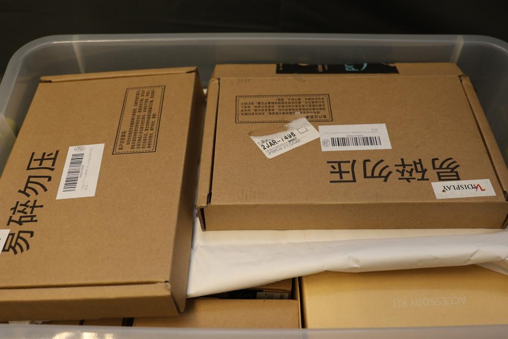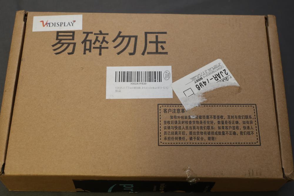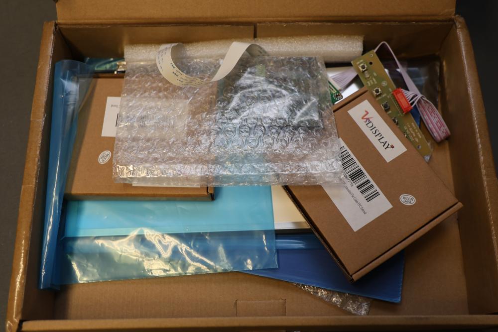 Boxed display screens and related accessories. Brands include VSDISPLAY and Longrunner, with sizes such as 5-inch and 7-inch displays noted. Items are packaged in original boxes, some unopened, with bubble wrap and protective packaging. Pickup only.