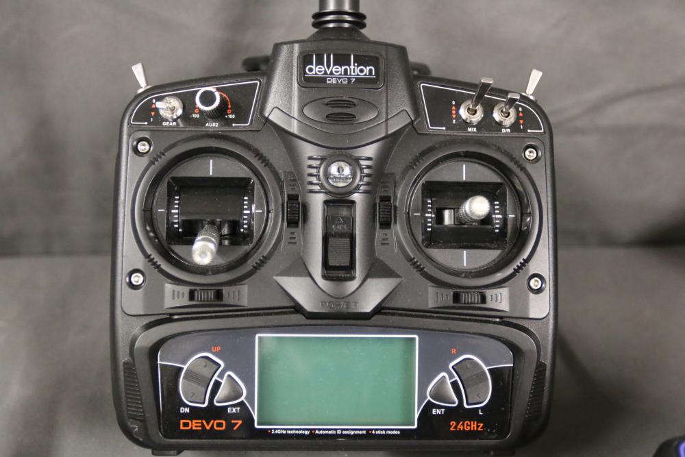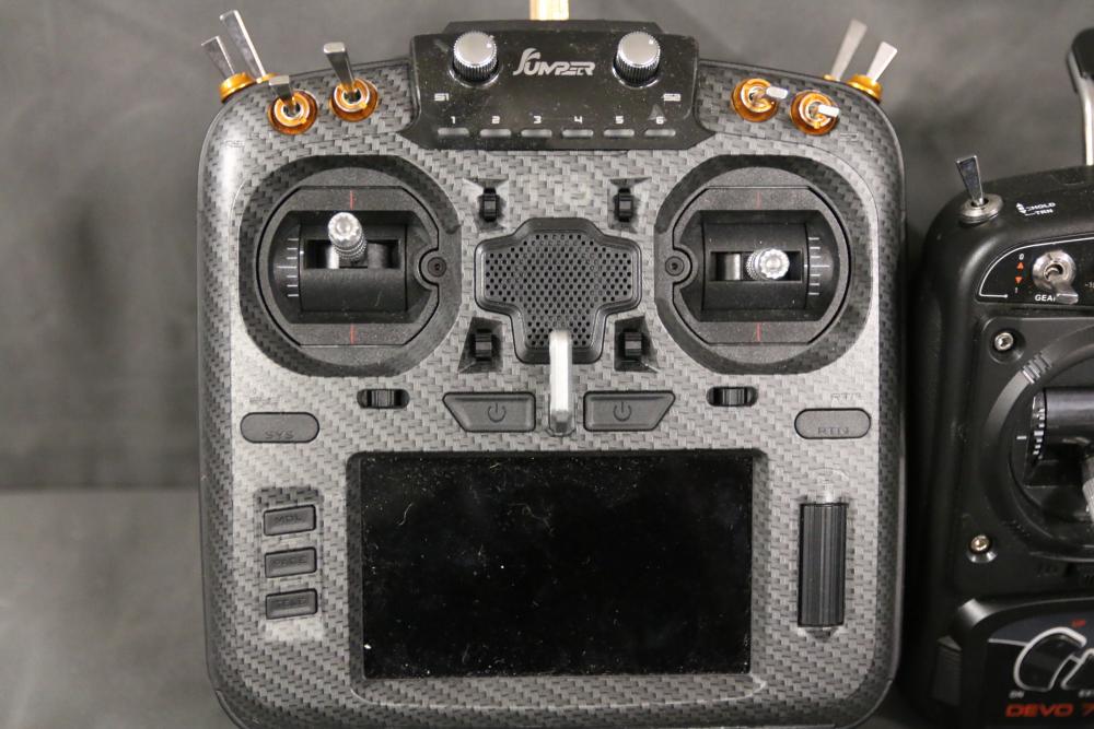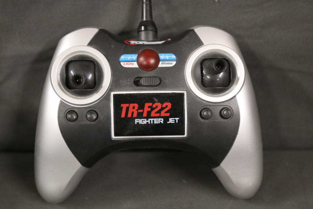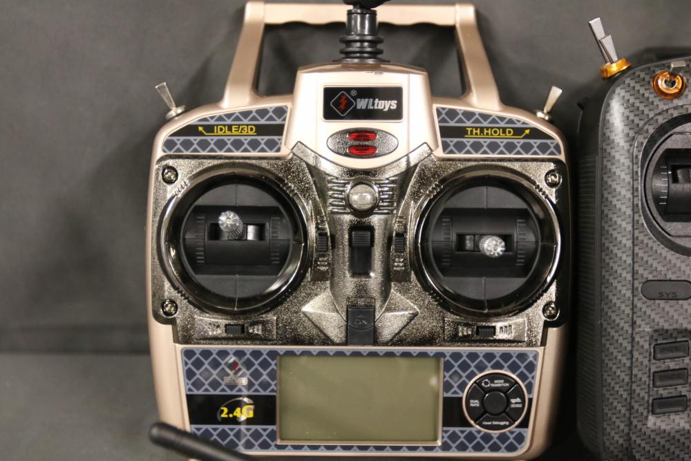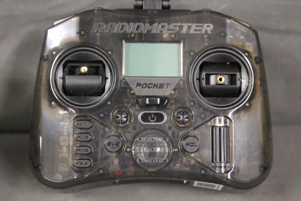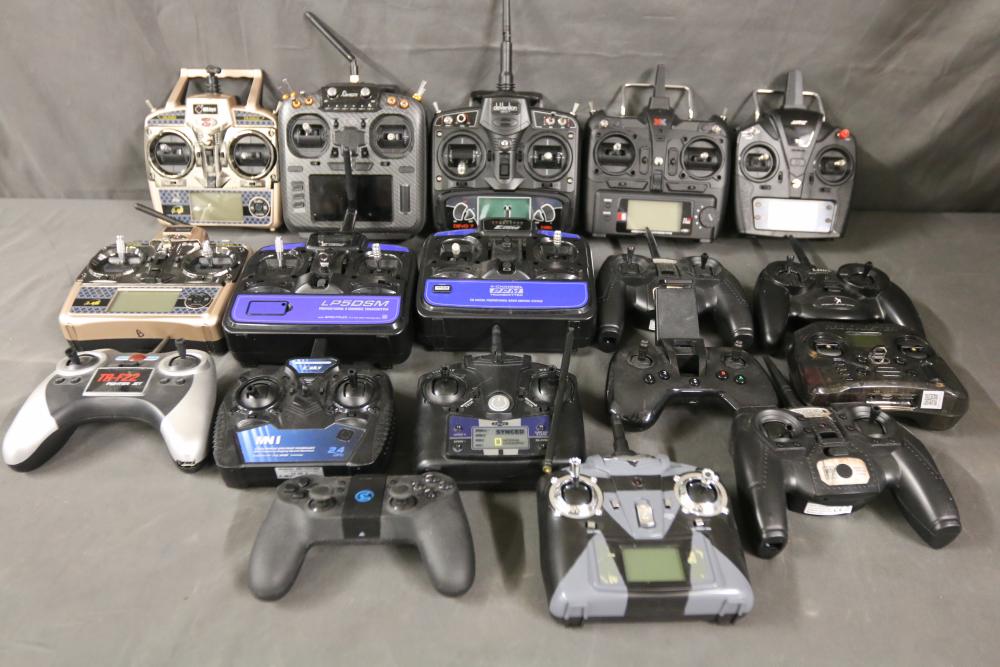 Includes multiple remote control transmitters for various RC models. Models include types such as National Geographic Synced, Radiomaster Pocket, TR-F22 Fighter Jet, Force RC, and more, from brands like WLtoys, Devo, eSky, and Elite. Items are in used condition, and functionality is not guaranteed. Includes items with both digital and analog controls. Pickup only.