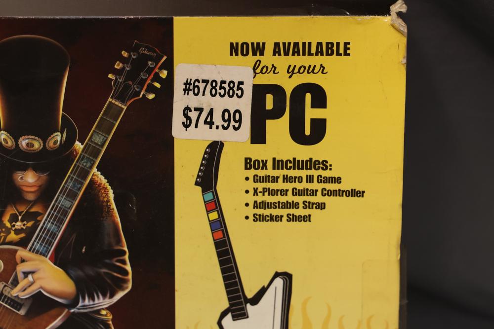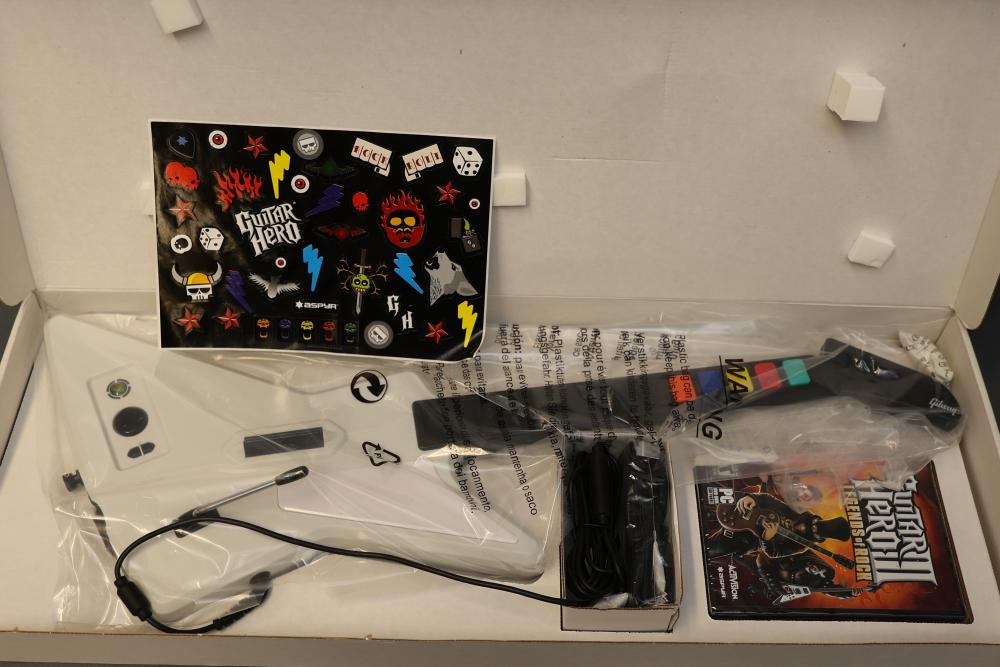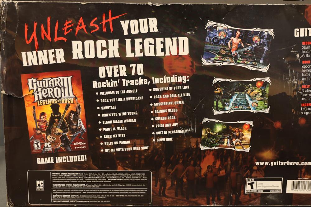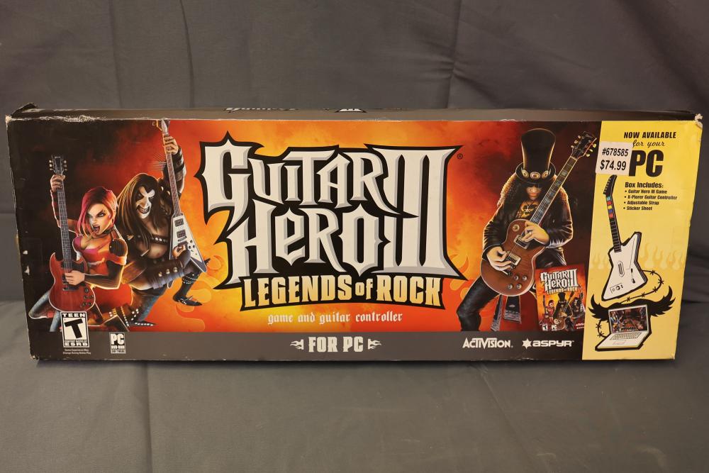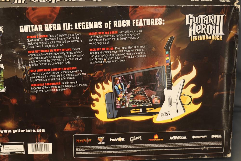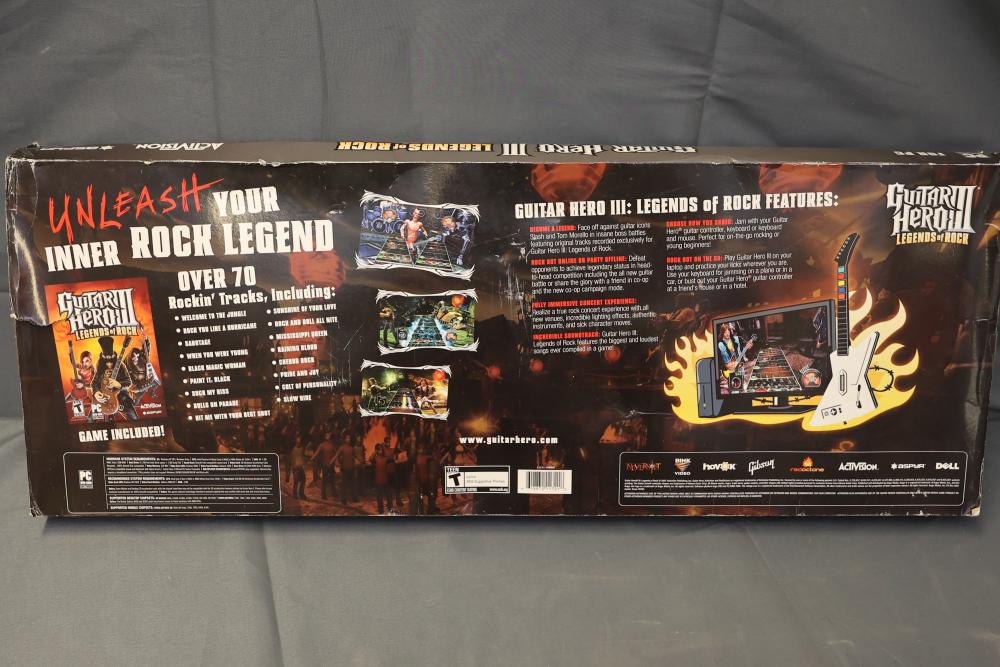 Guitar Hero III: Legends of Rock PC version includes the game, a white X-Plorer guitar-style controller, an adjustable strap, and a sticker sheet. Comes in original packaging. Pickup only.