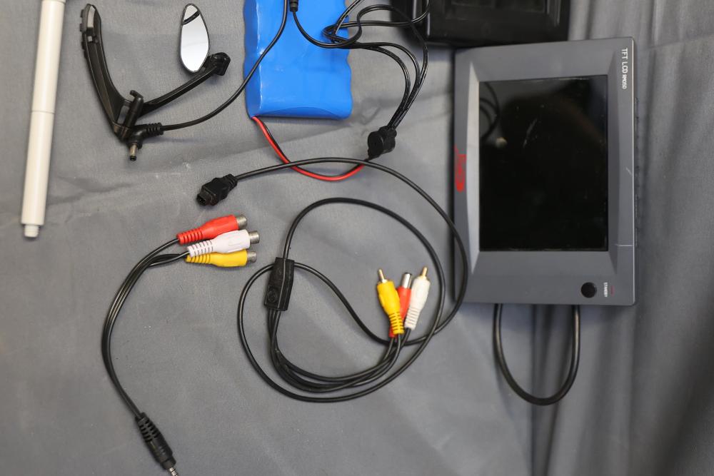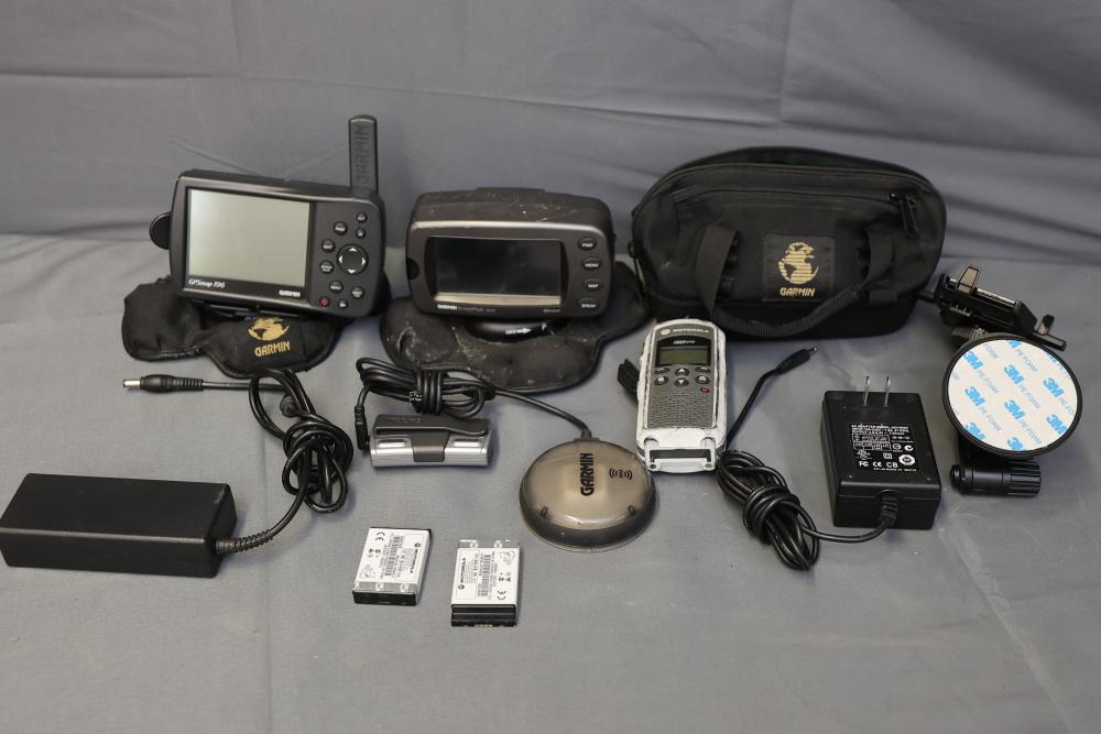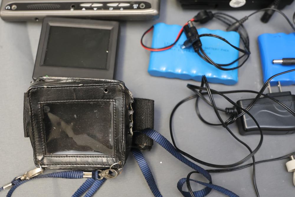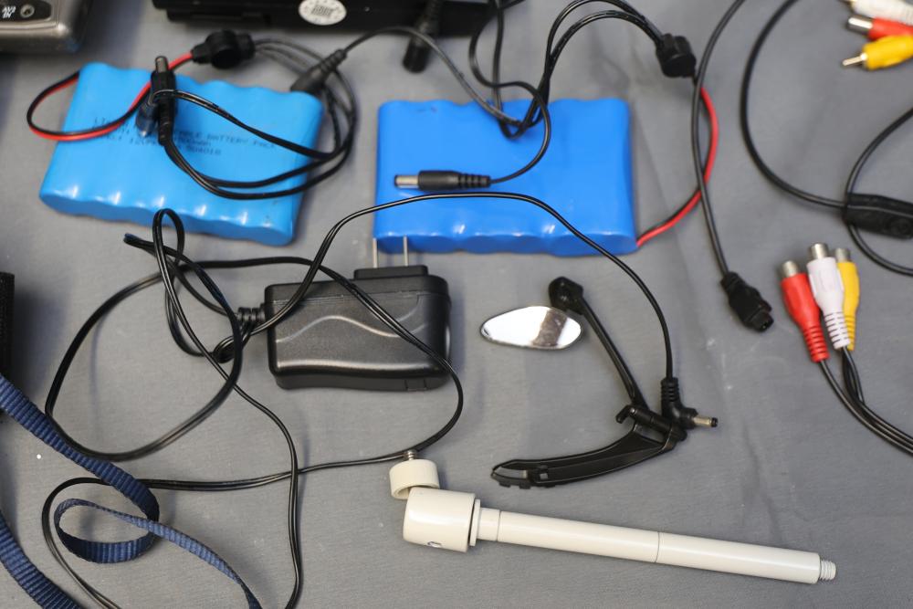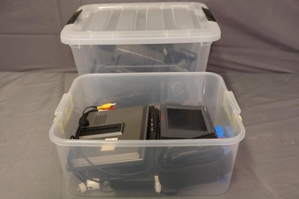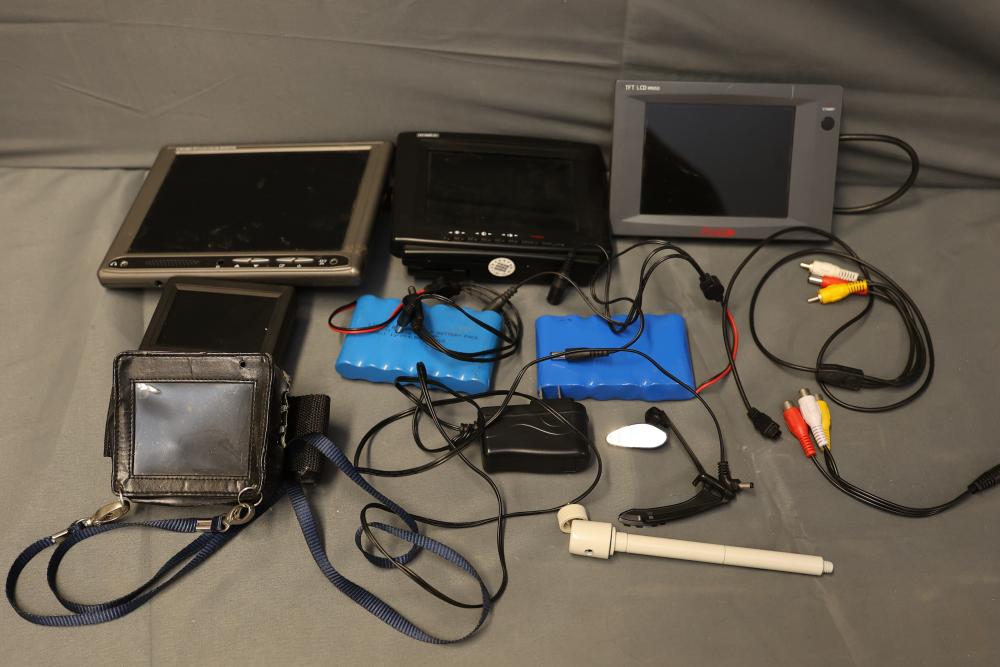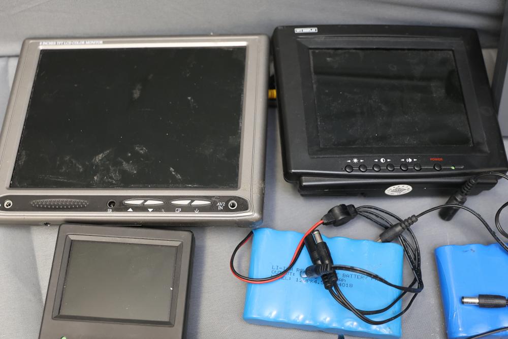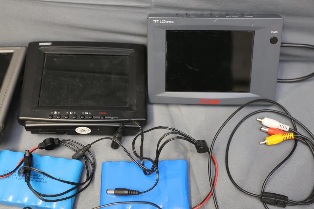 Electronic devices including several LCD display screens, power adapters, rechargeable battery packs, RCA connector cables, and additional accessories. Items are stored in two clear plastic bins for organization. Pickup only.