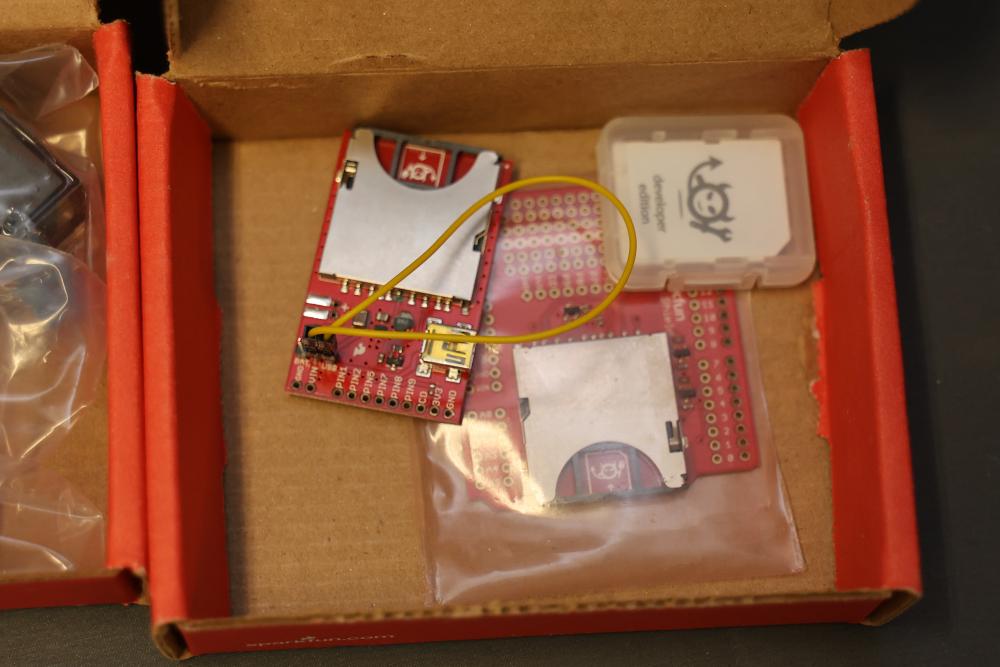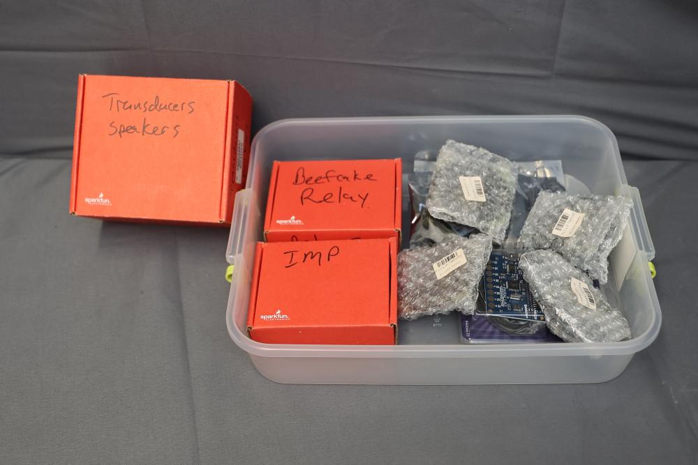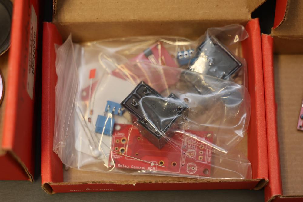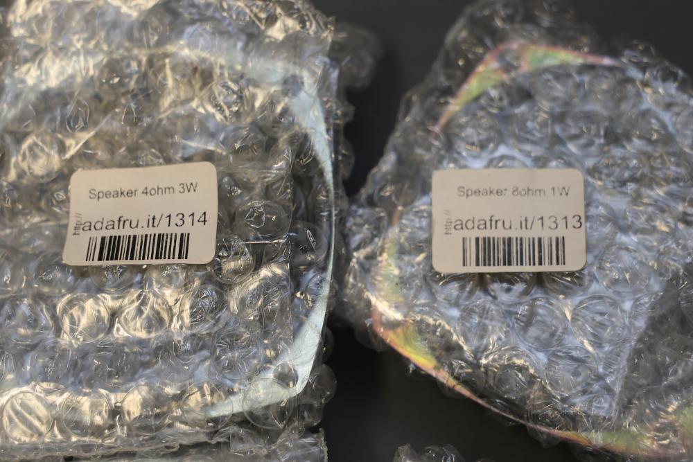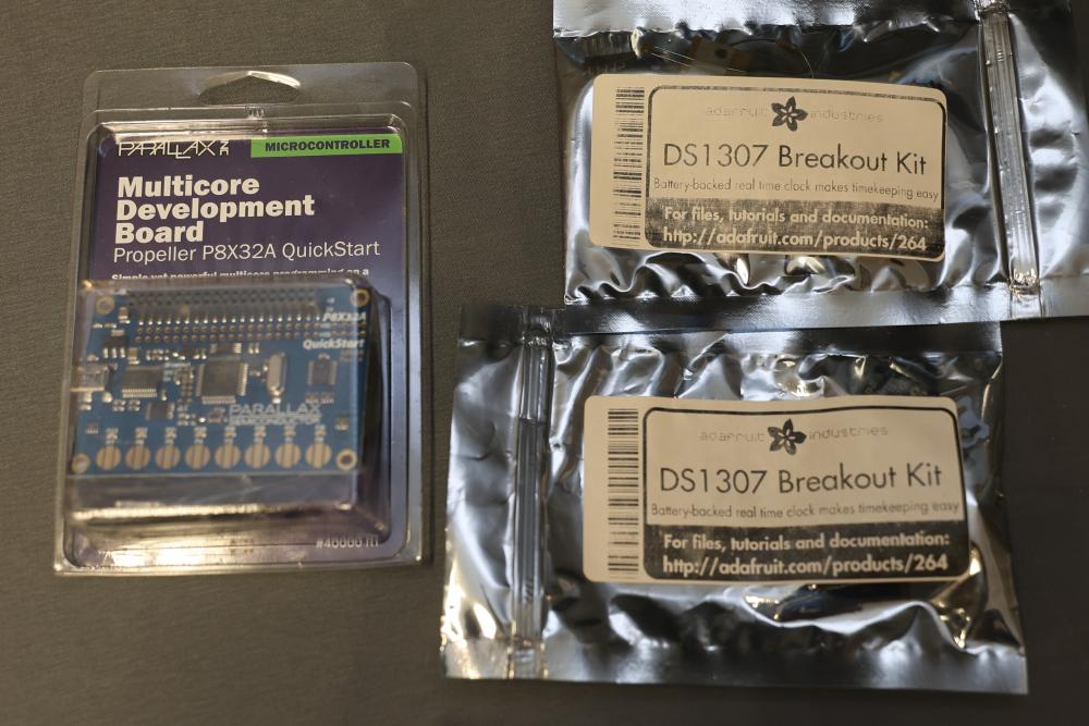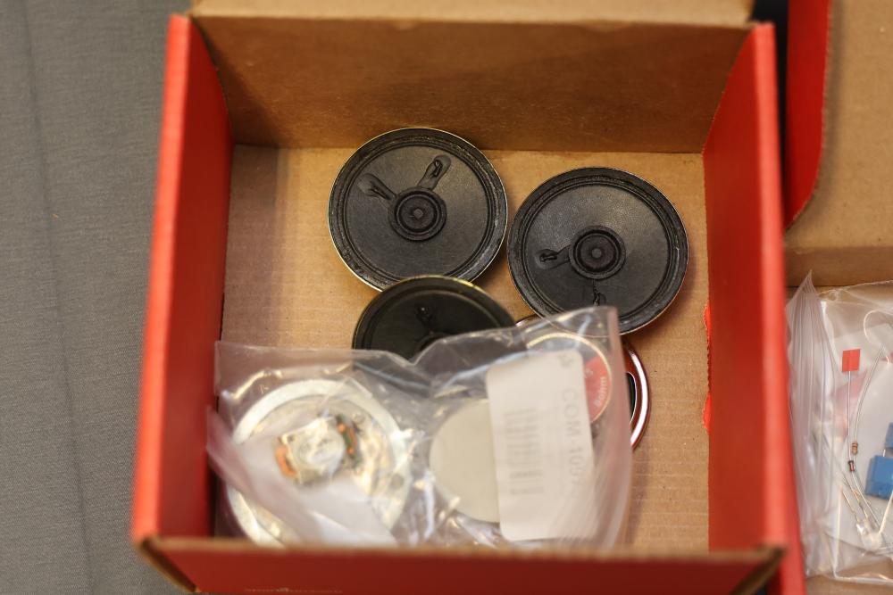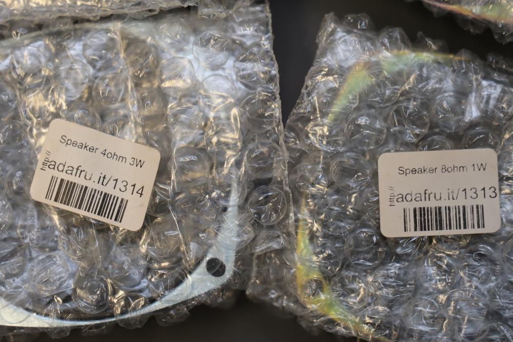 Electronic components, including a multicore development board, Adafruit DS1307 breakout kits, 8-ohm 1W and 3W speakers, and various circuit boards and smaller components. Pickup only.