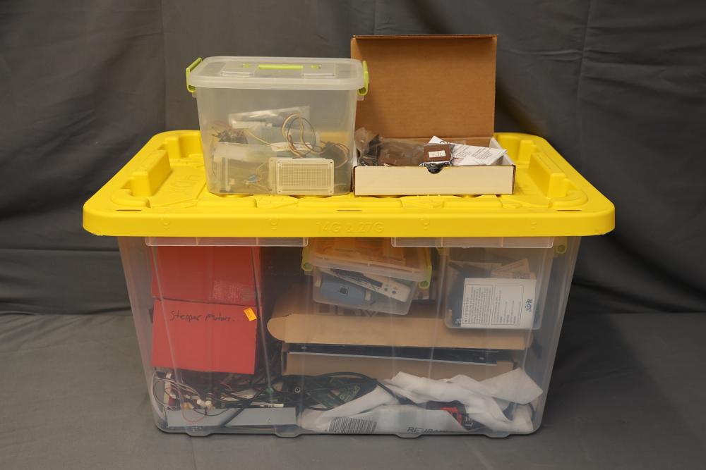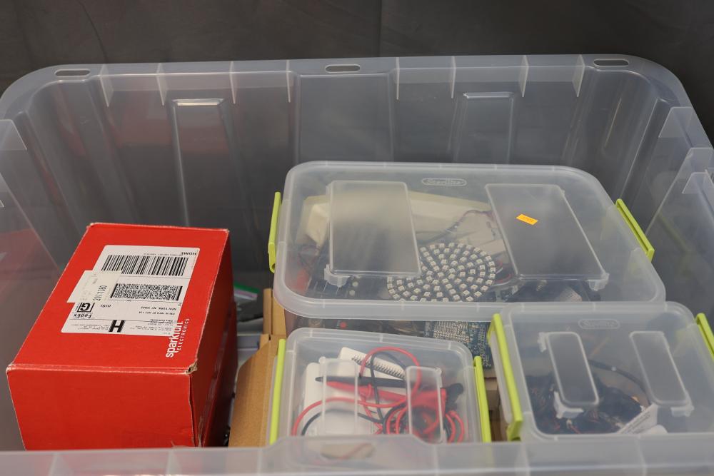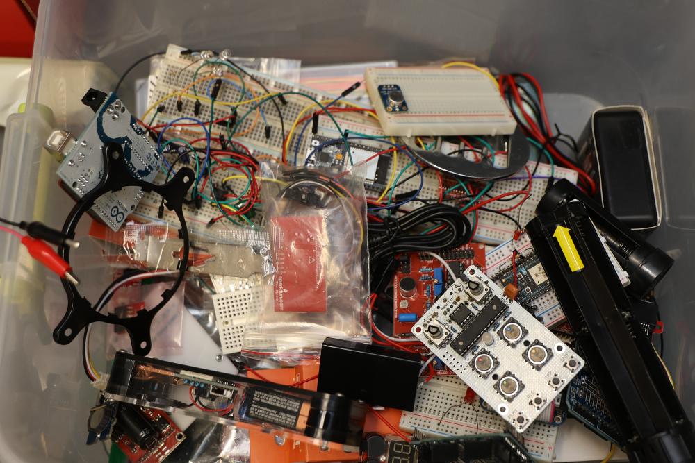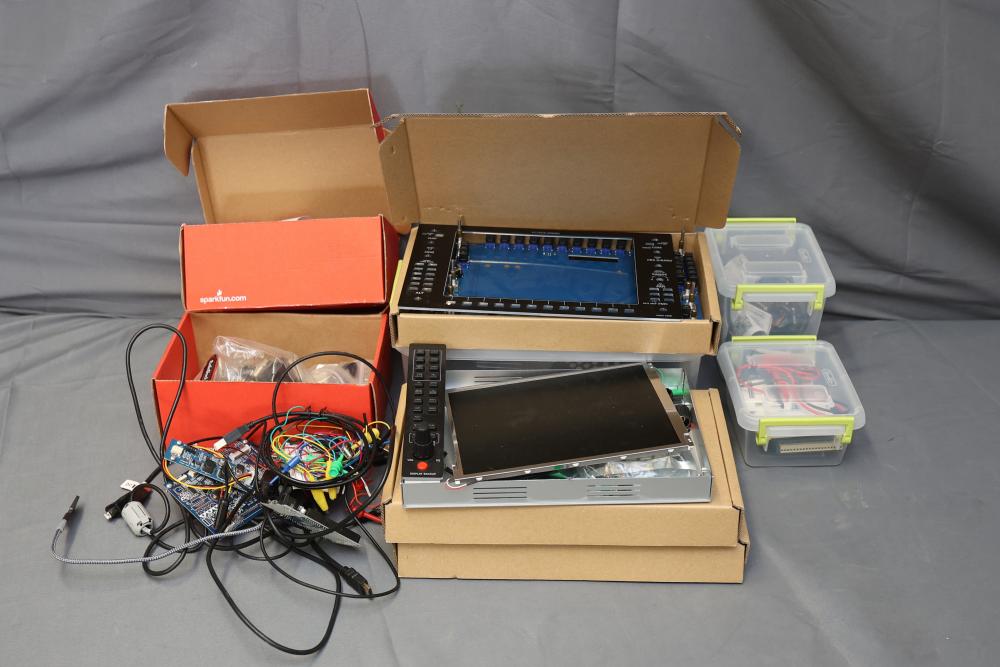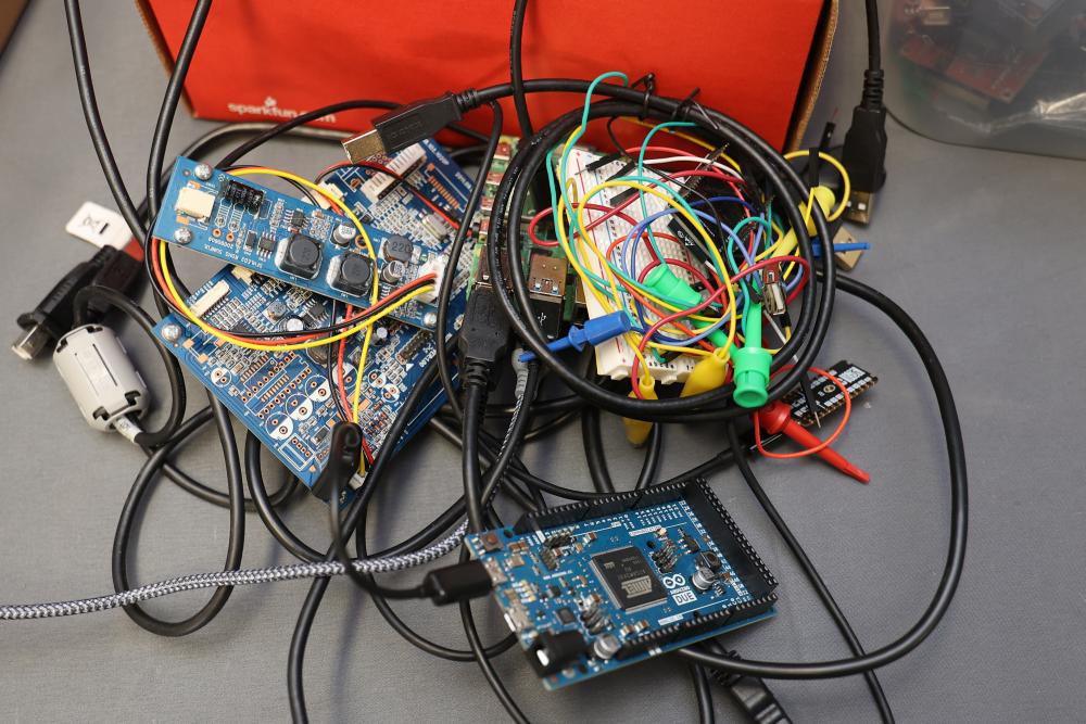 Electronics and development components including Arduino boards, Raspberry Pi boards, multiple prototyping boards, wiring, and accessories. Includes boxed components, PCBs, and controllers for various projects. Pickup only.
