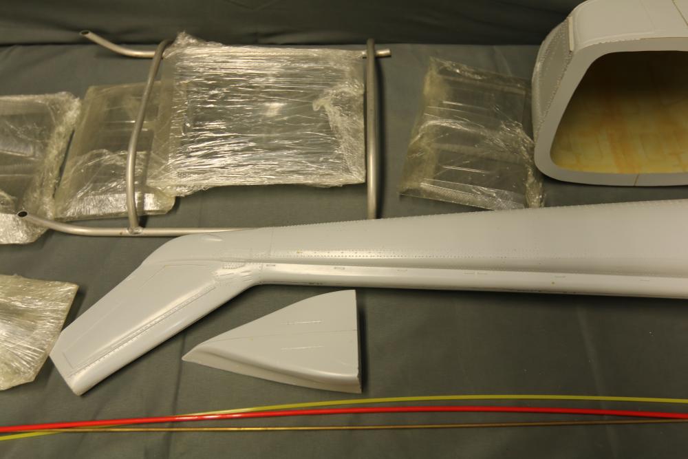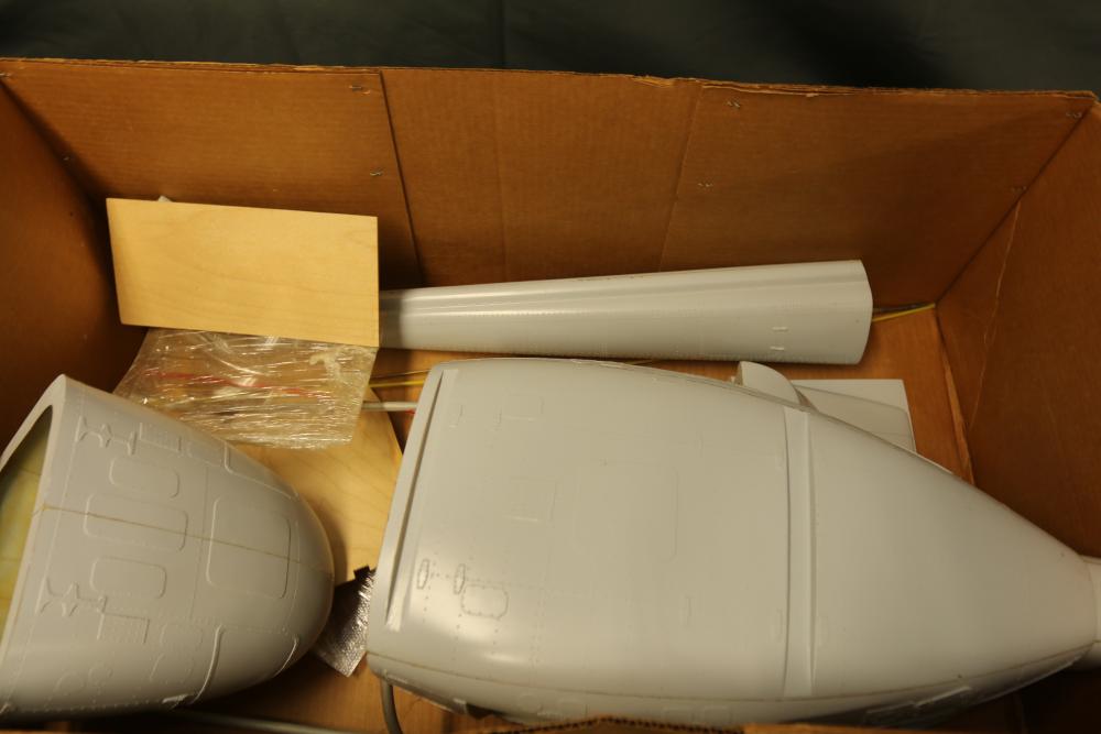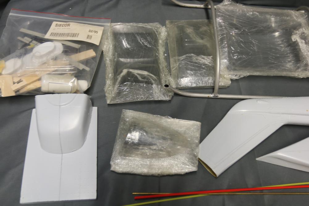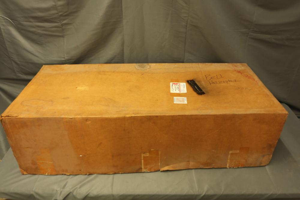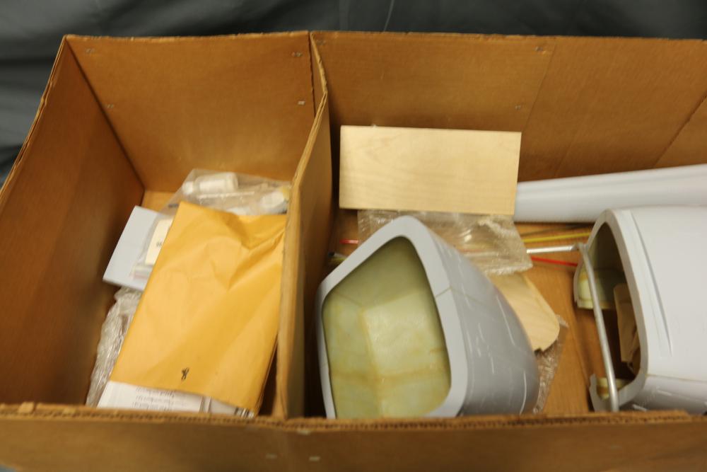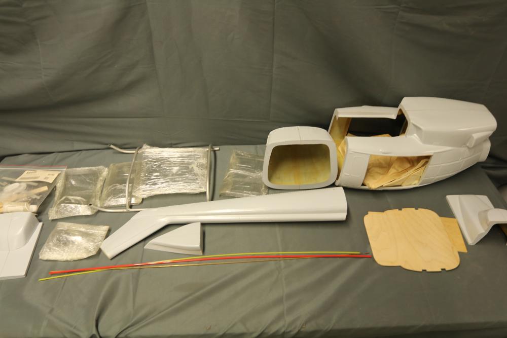 Unassembled model helicopter kit with fiberglass and wood components. Includes fuselage sections, pre-cut wooden parts, plastic elements, rods, and additional assembly materials. Packaged in its original box. Box shows wear from storage and handling. Pickup only.