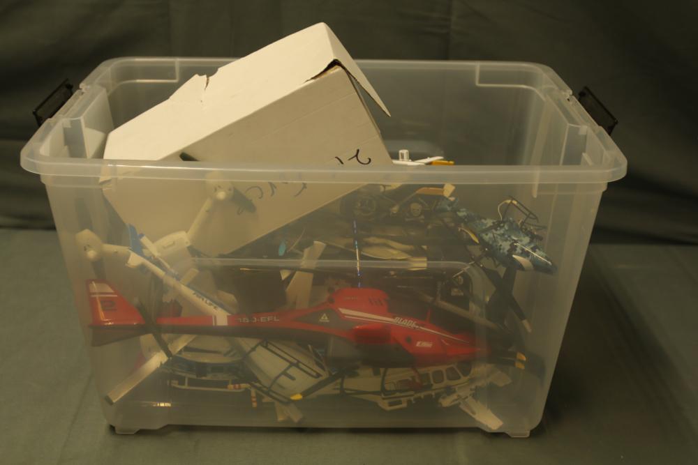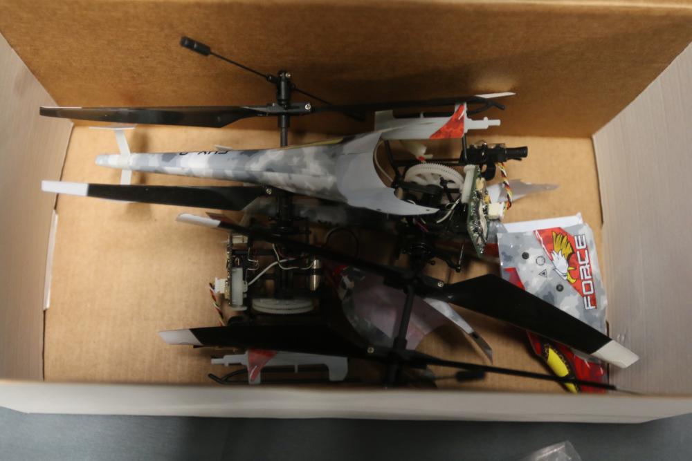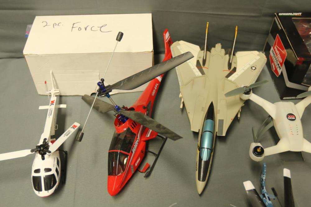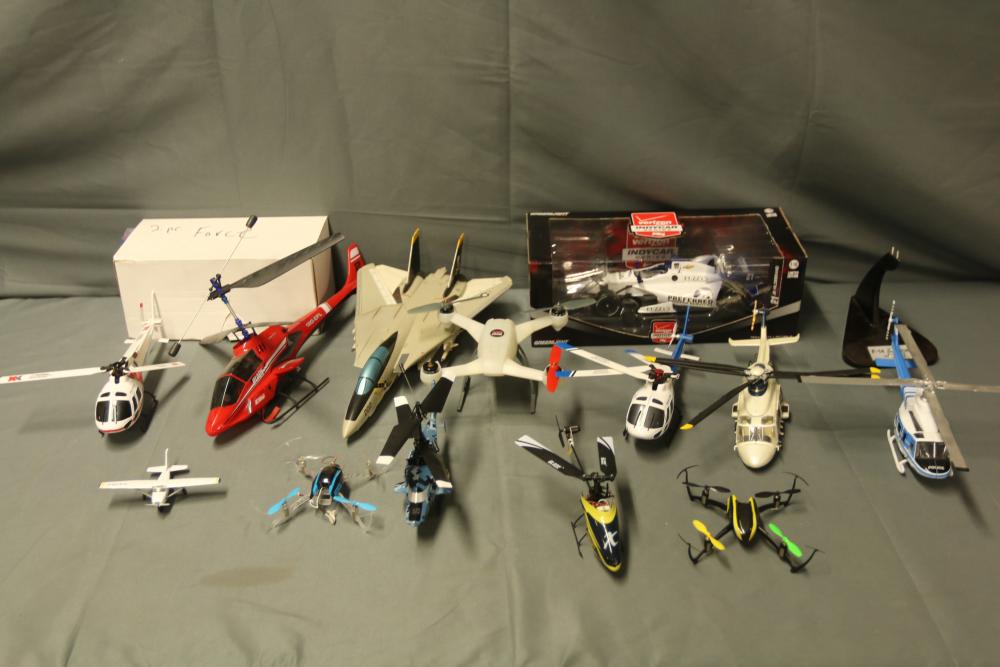 Remote-control aircraft and drones, including helicopters, planes, and quadcopters. Items are a mix of boxed and loose pieces. Several appear to have been used, with accessories and parts included where shown. Pickup only.