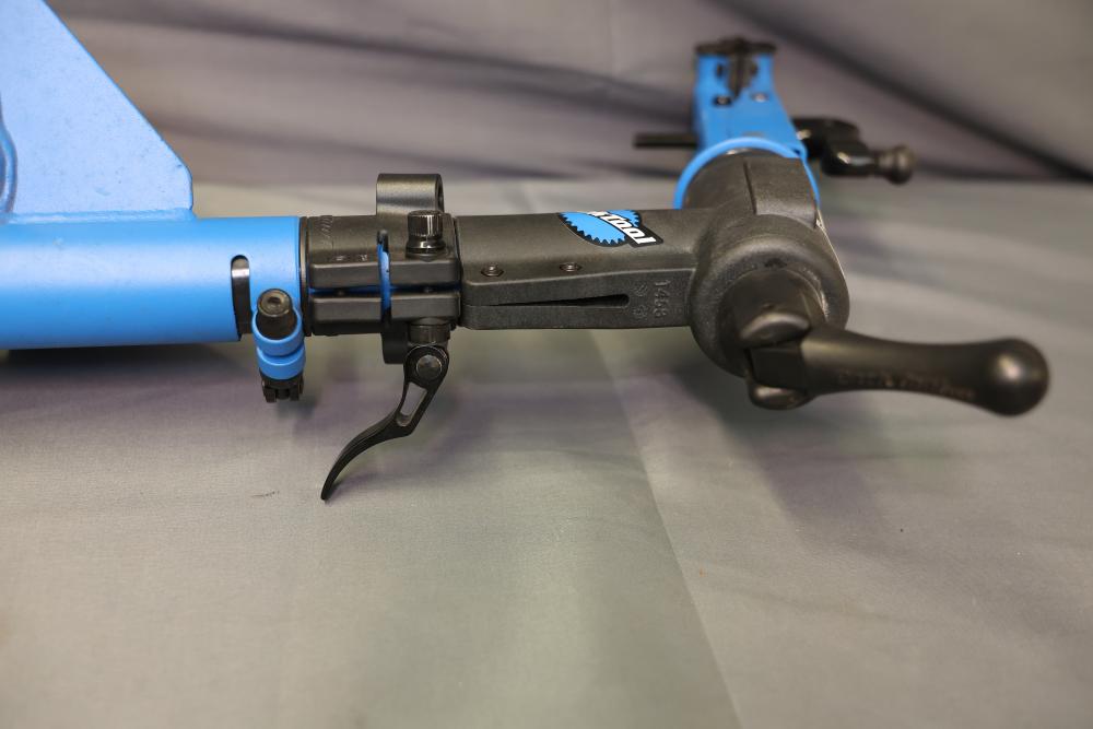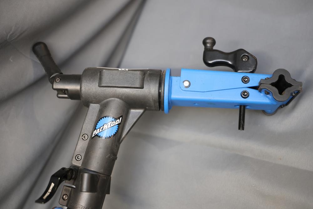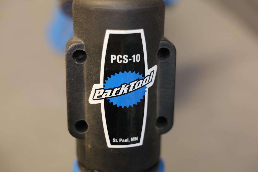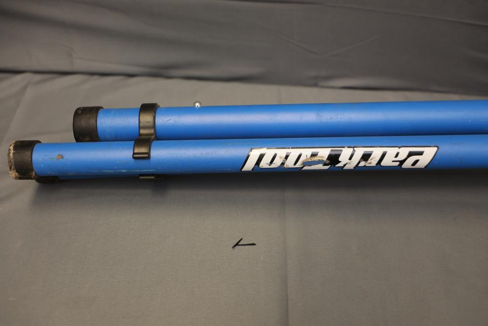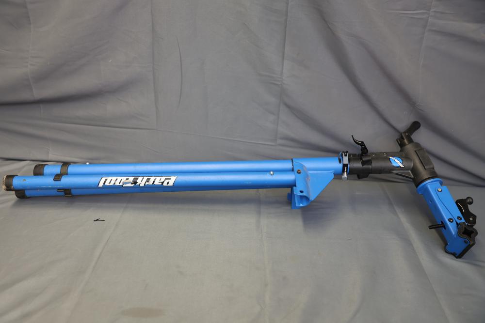 Park Tool PCS-10 portable bicycle repair stand featuring a foldable frame and adjustable height. Constructed with a blue steel frame and a durable clamping mechanism for securely holding bikes during maintenance. Pickup only.
