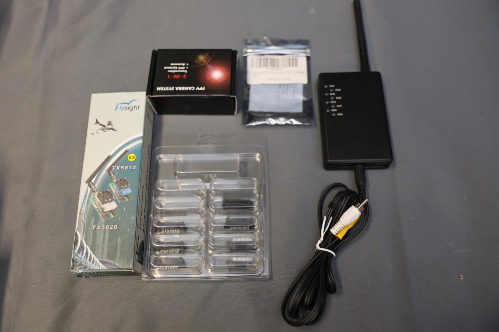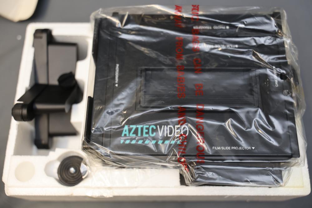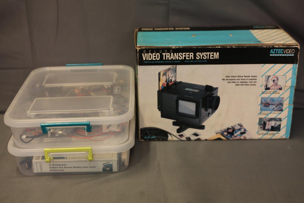 Aztec Video Transfer System includes the main unit in its original packaging and appears unused. Additional accessories, components, cables, and electronic parts are included, stored in plastic containers. Specific functions and completeness of the accessories are not verified. Pickup only.