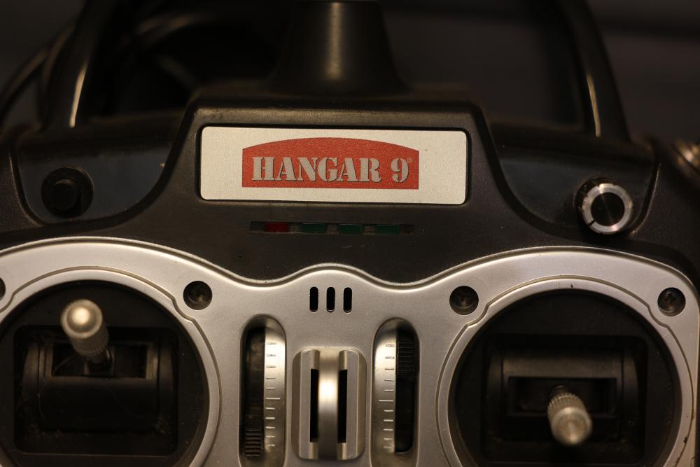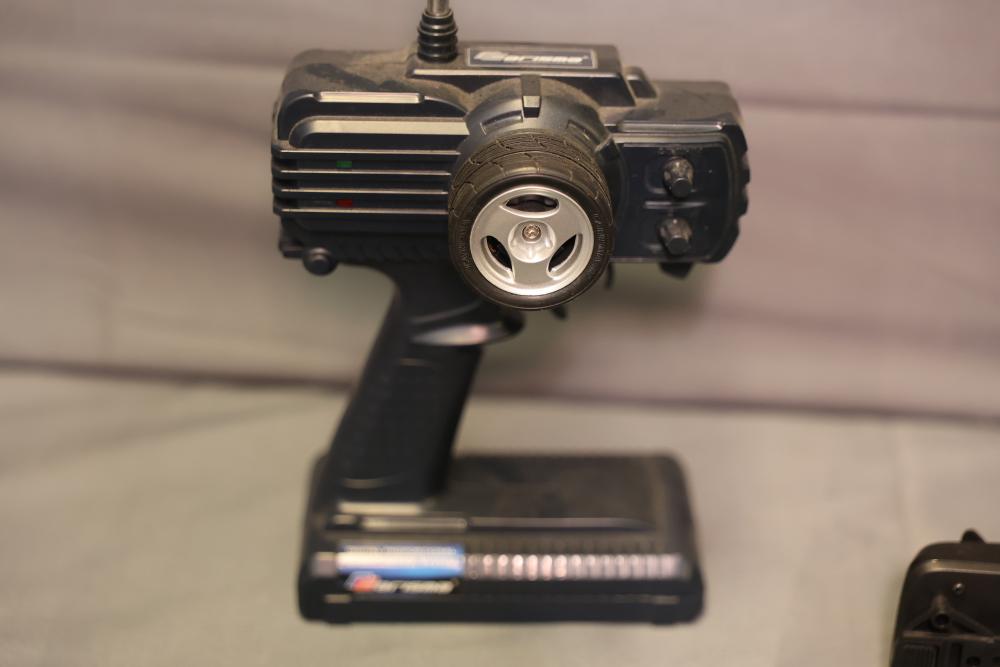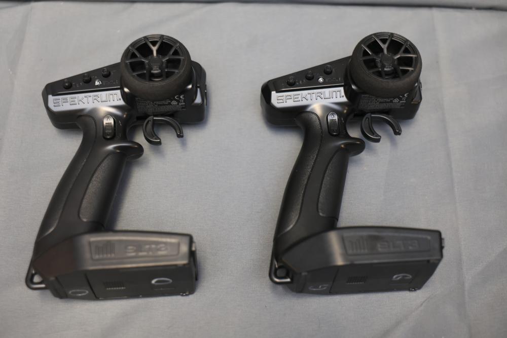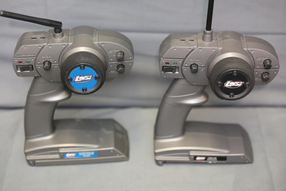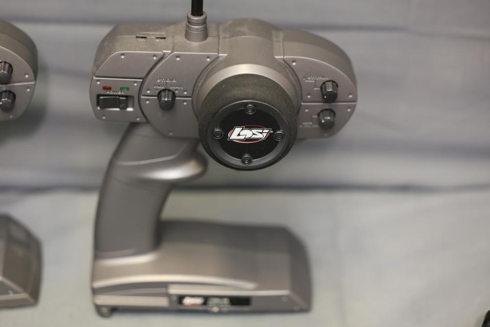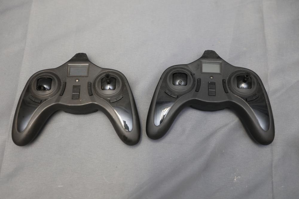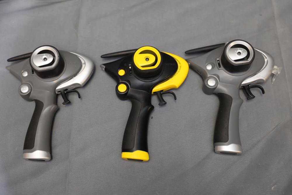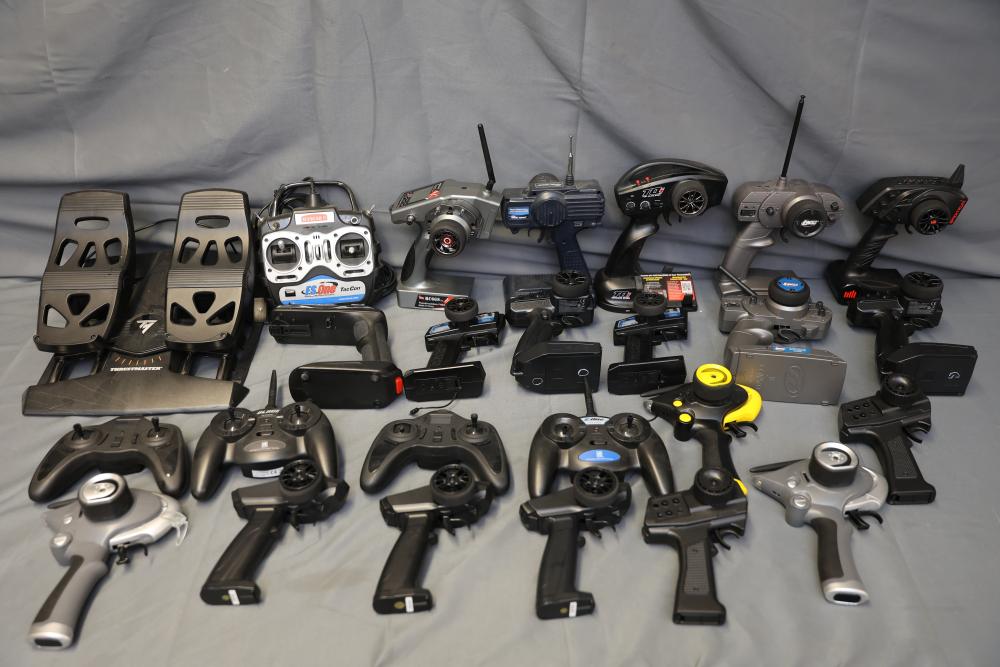 Radio control transmitter units and foot pedals. Includes items such as handheld transmitters by brands like Spektrum, Hangar 9, E-Flite, and Radiolink, among others. Some units are handheld pistol-grip designs, while others include joystick-style controllers. Also included is a set of Thrustmaster foot pedals. Pickup only.