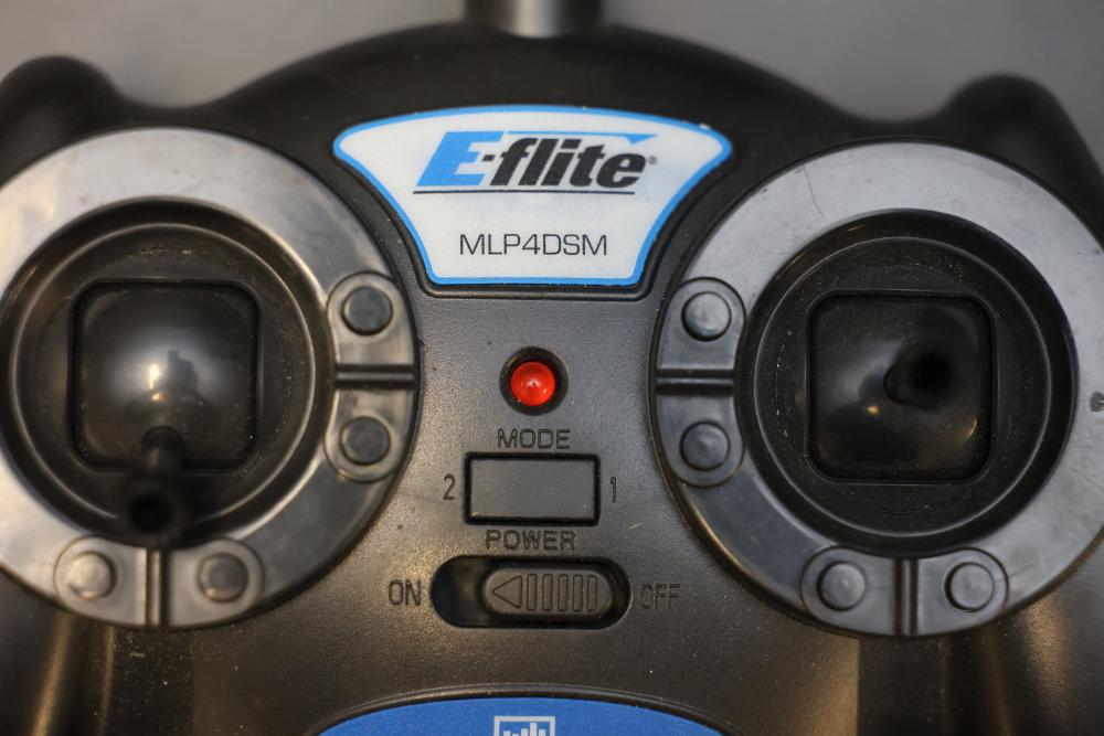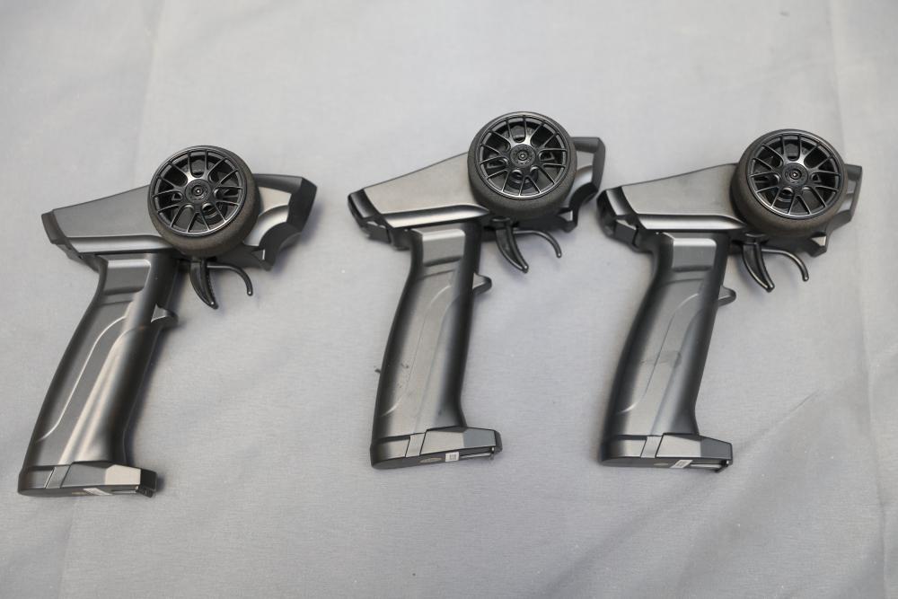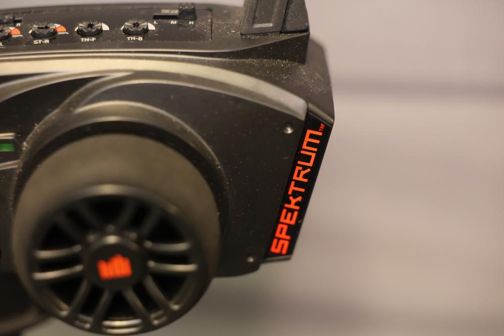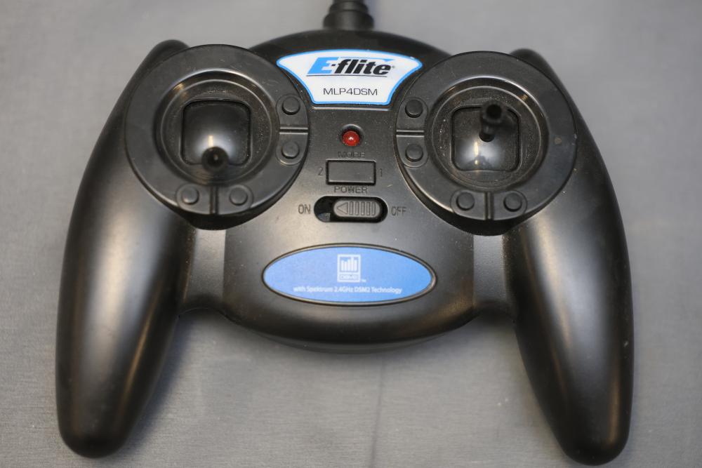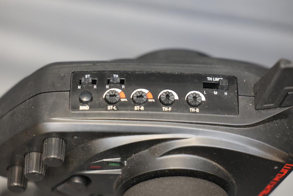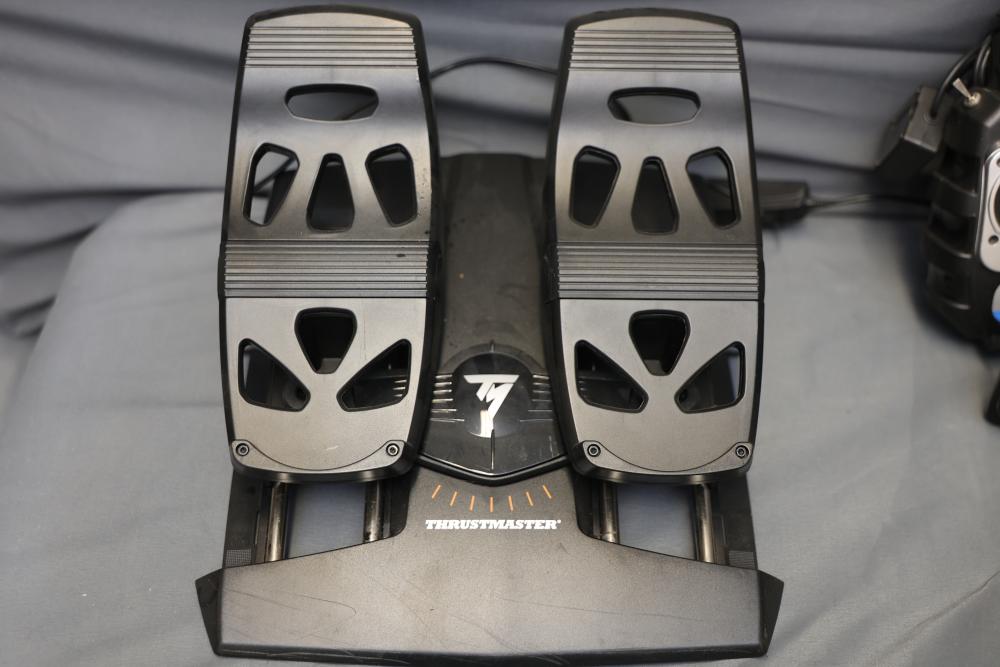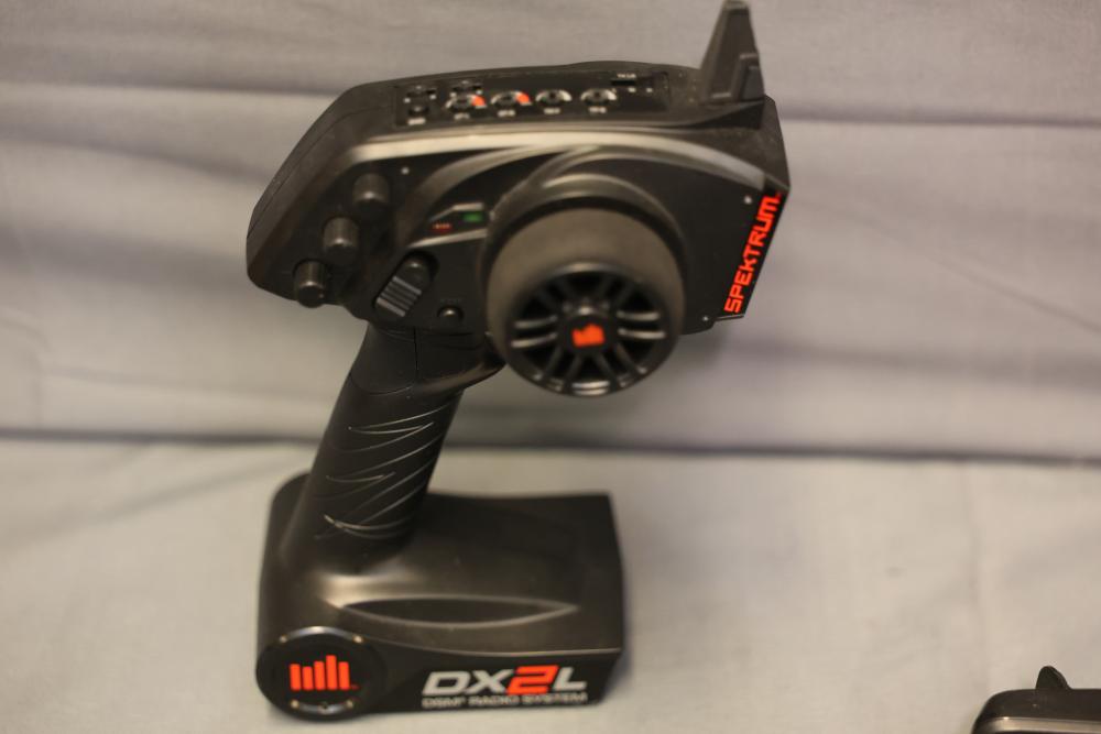 Radio control transmitter units and foot pedals. Includes items such as handheld transmitters by brands like Spektrum, Hangar 9, E-Flite, and Radiolink, among others. Some units are handheld pistol-grip designs, while others include joystick-style controllers. Also included is a set of Thrustmaster foot pedals. Pickup only.