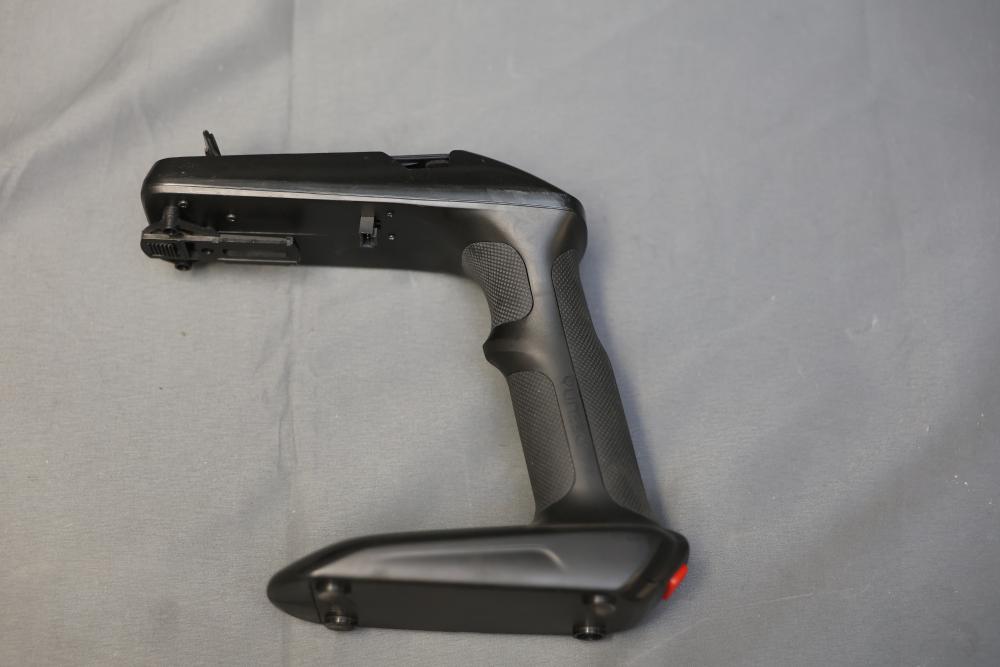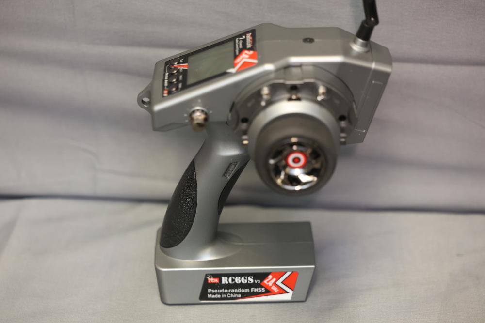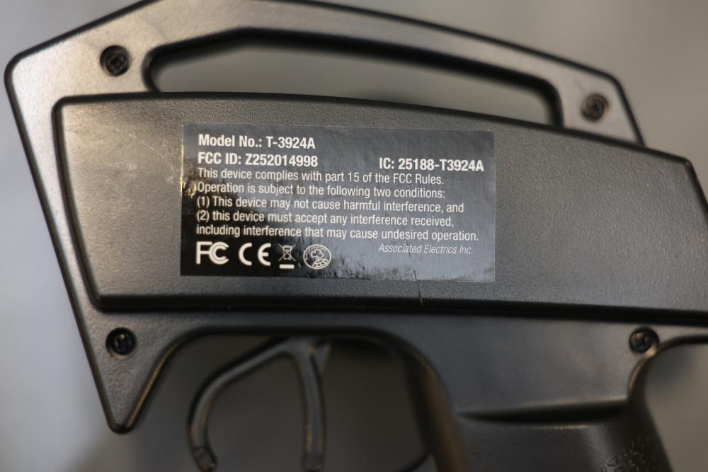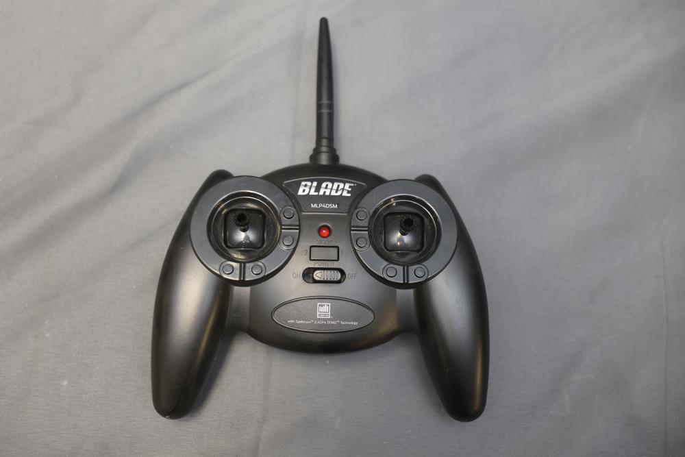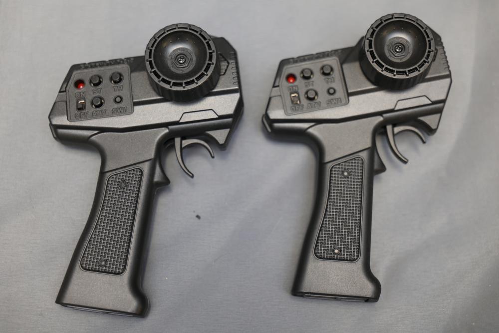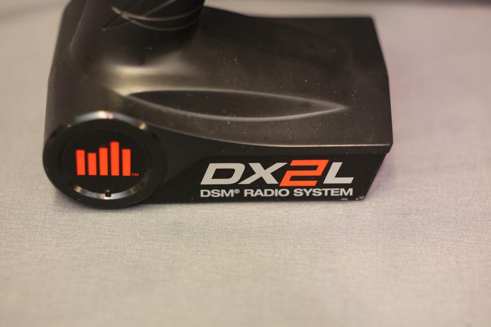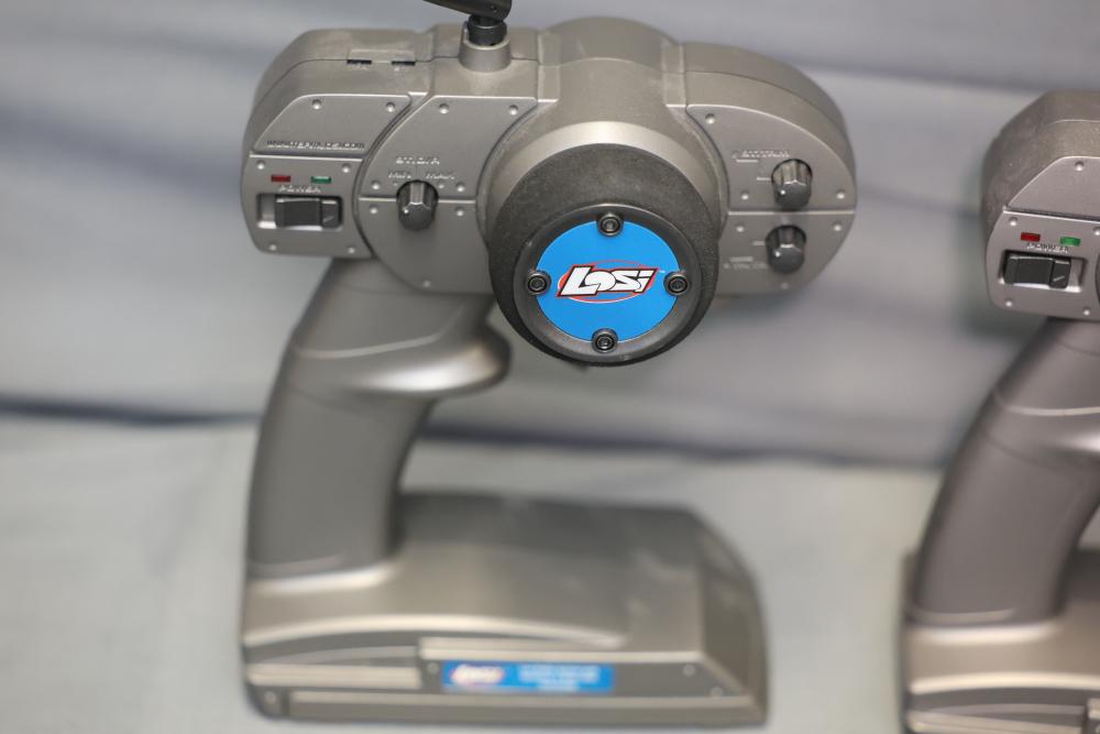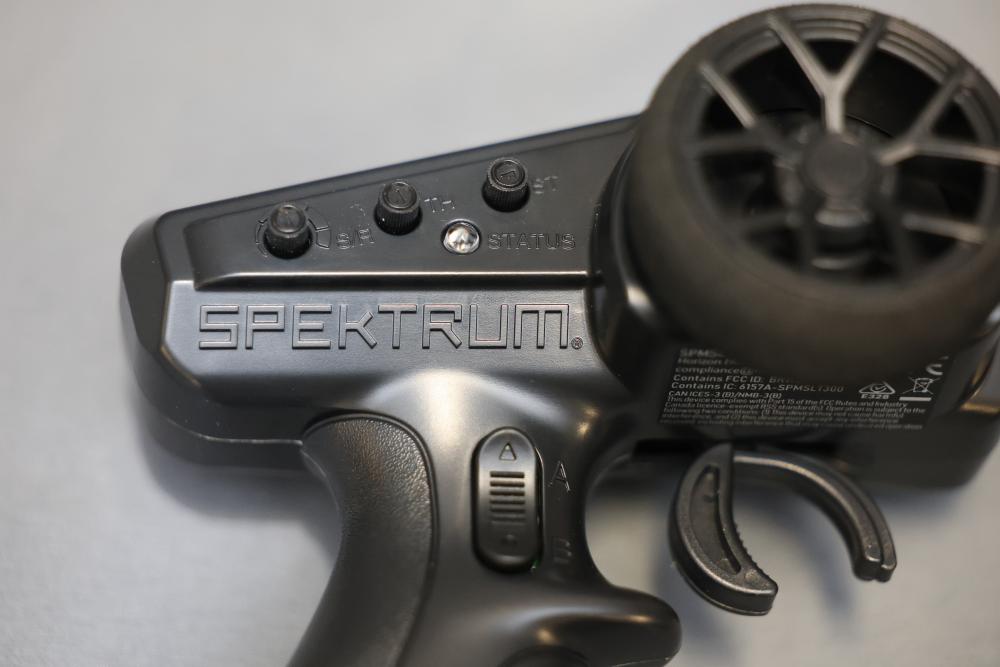 Radio control transmitter units and foot pedals. Includes items such as handheld transmitters by brands like Spektrum, Hangar 9, E-Flite, and Radiolink, among others. Some units are handheld pistol-grip designs, while others include joystick-style controllers. Also included is a set of Thrustmaster foot pedals. Pickup only.