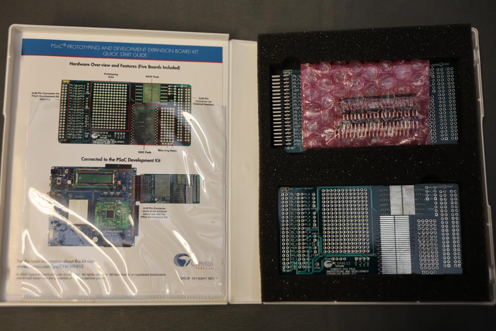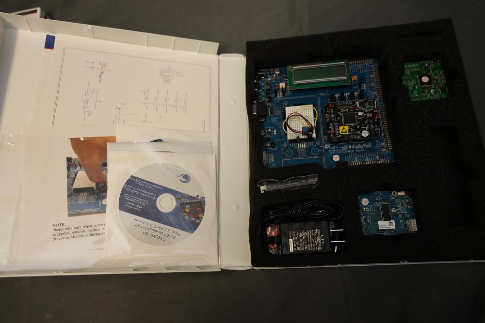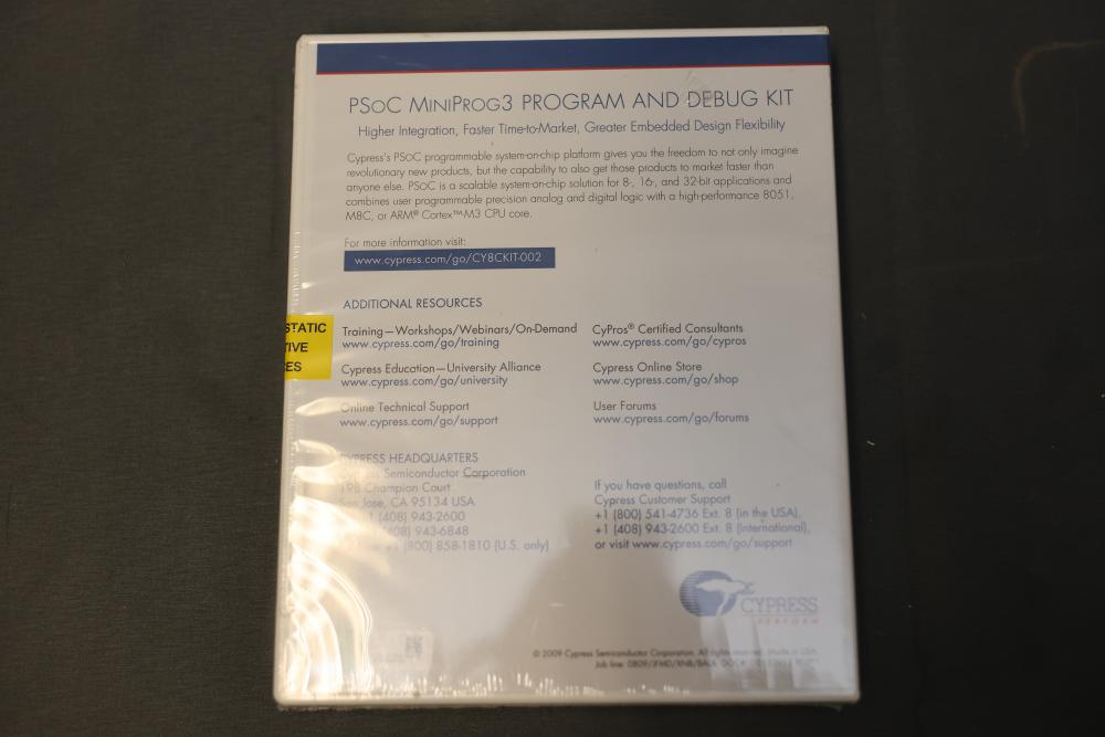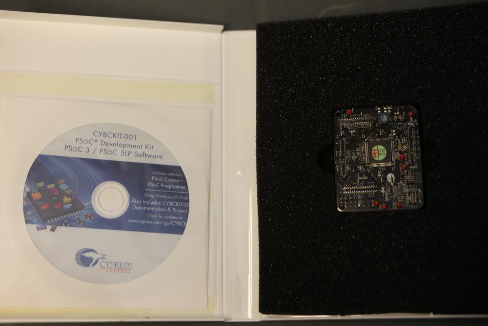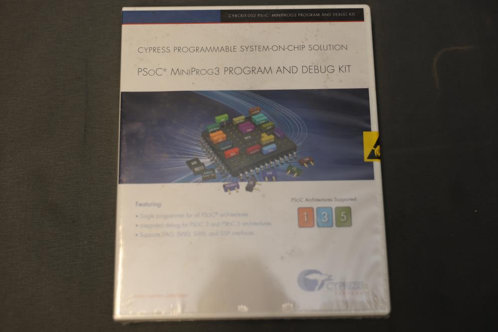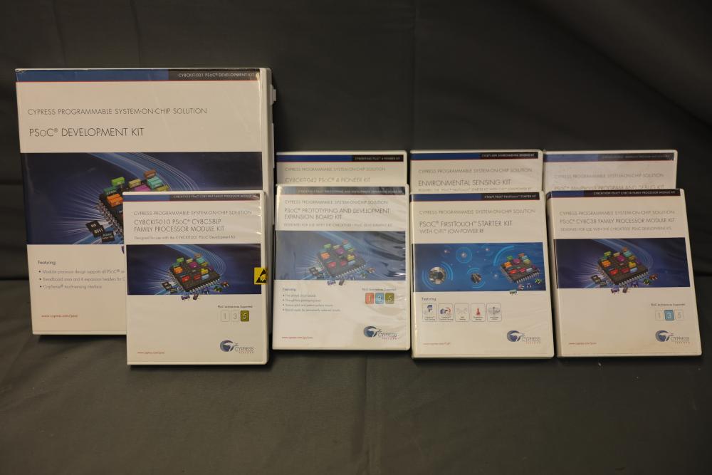 Cypress PSoC Programmable System-on-Chip kits including program and debug modules, hardware development modules, and software on CDs. Includes boards, sensors, and accessories for programming and debugging tasks. Pickup only.
