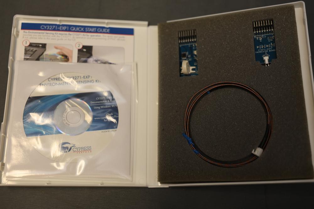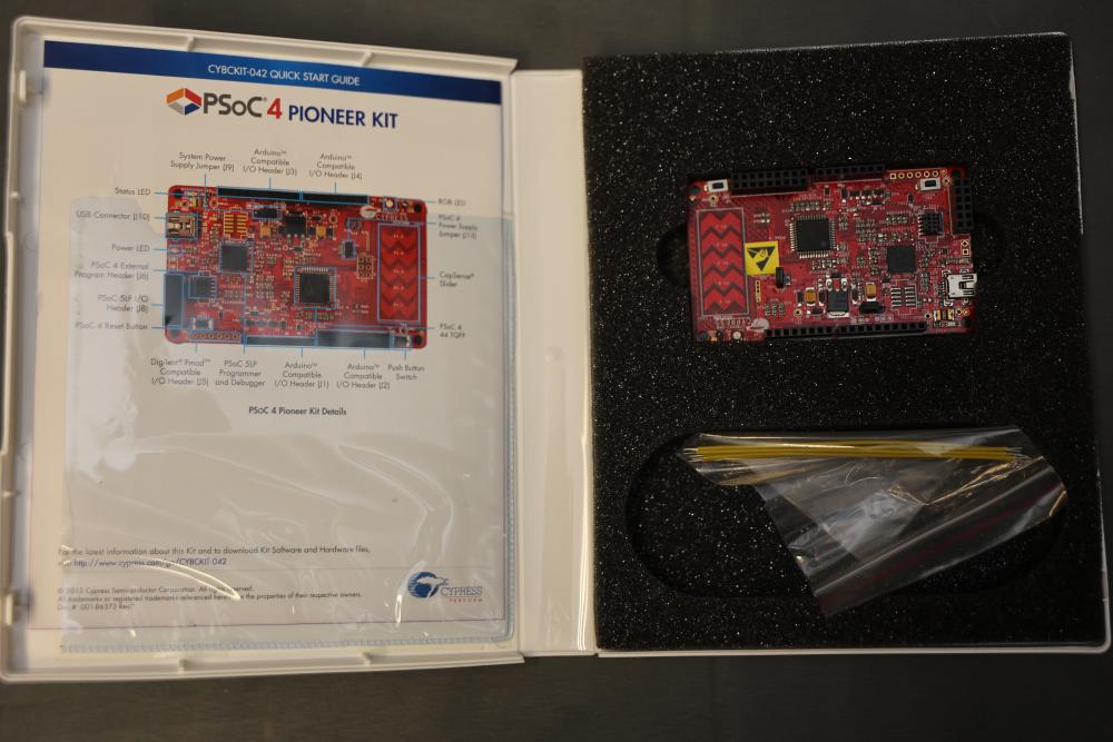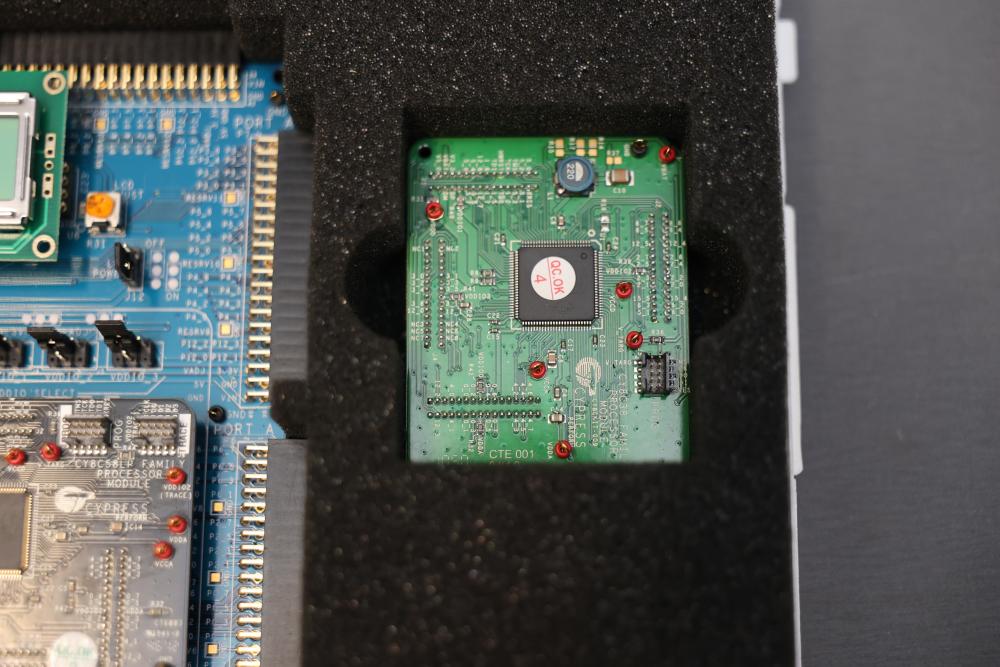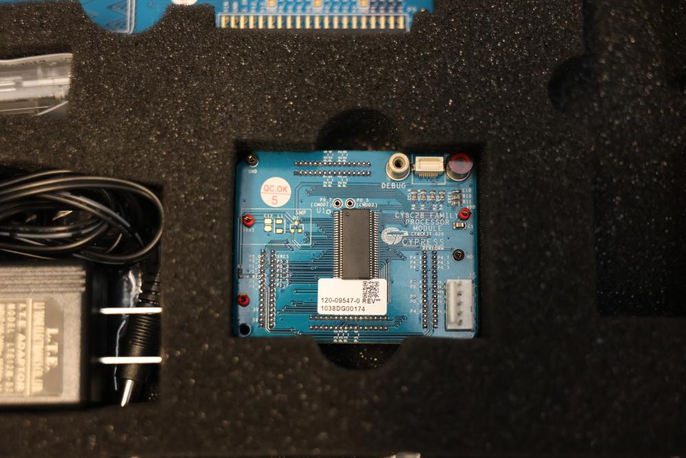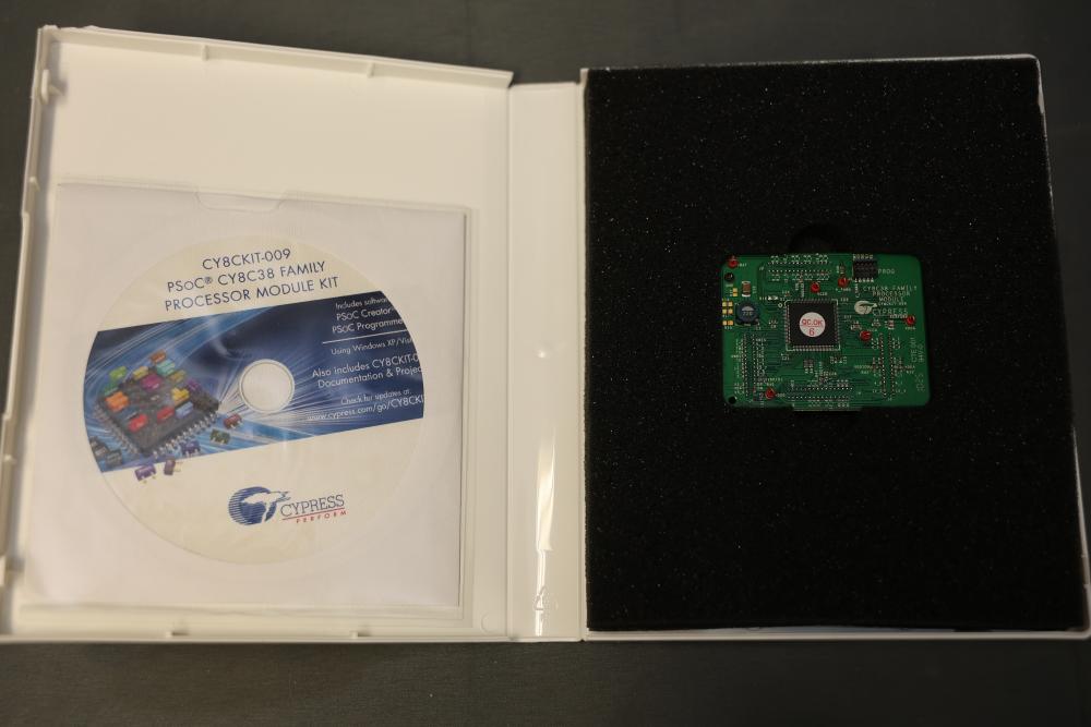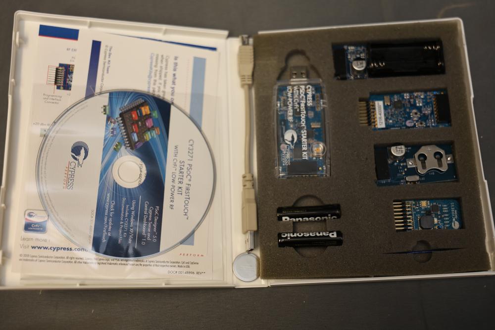 Cypress PSoC Programmable System-on-Chip kits including program and debug modules, hardware development modules, and software on CDs. Includes boards, sensors, and accessories for programming and debugging tasks. Pickup only.